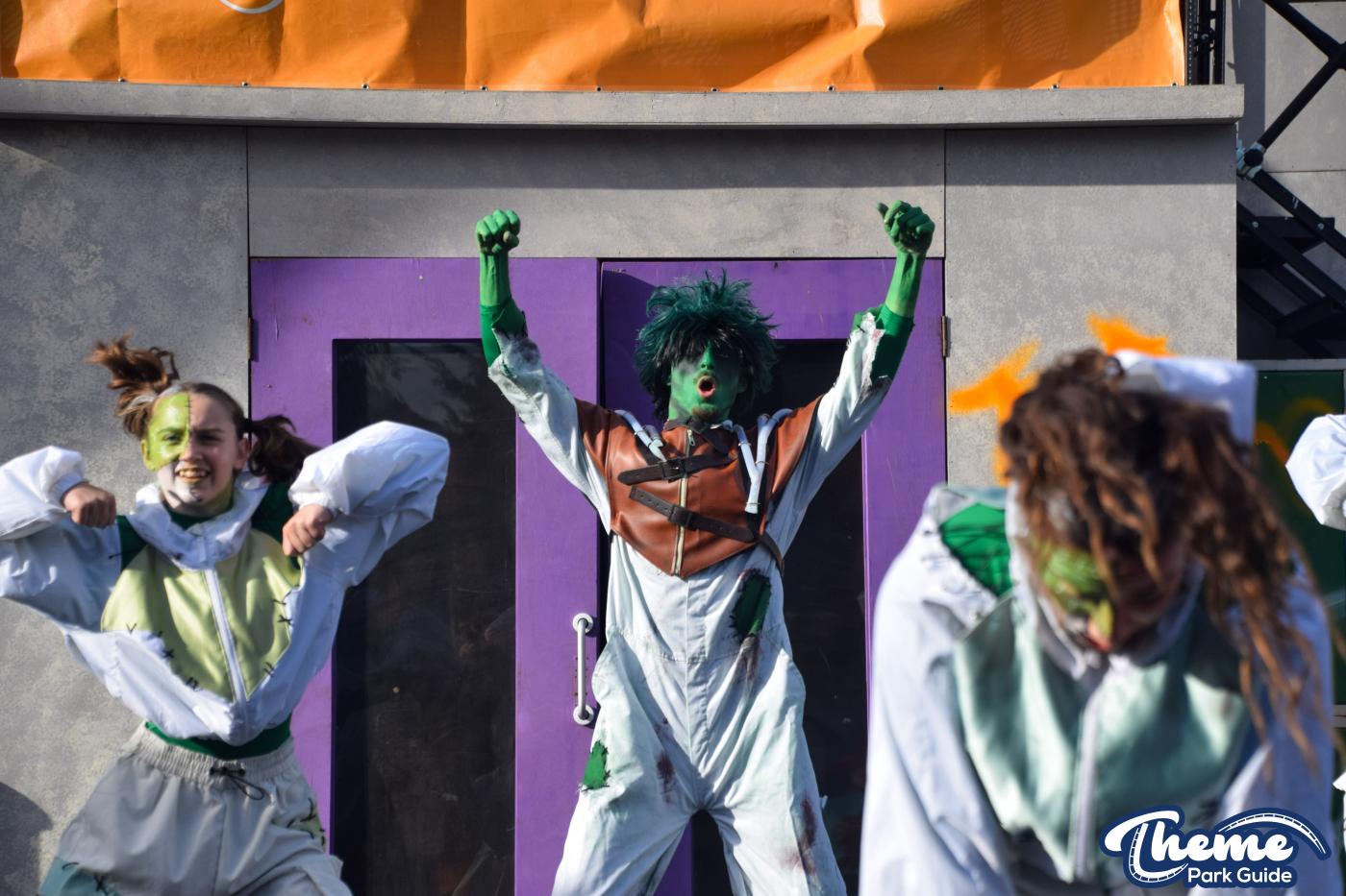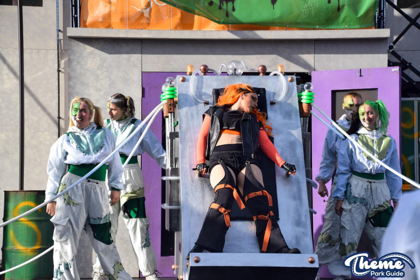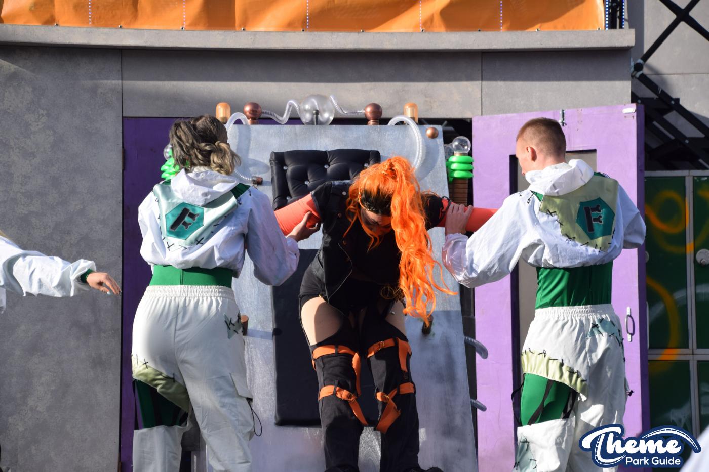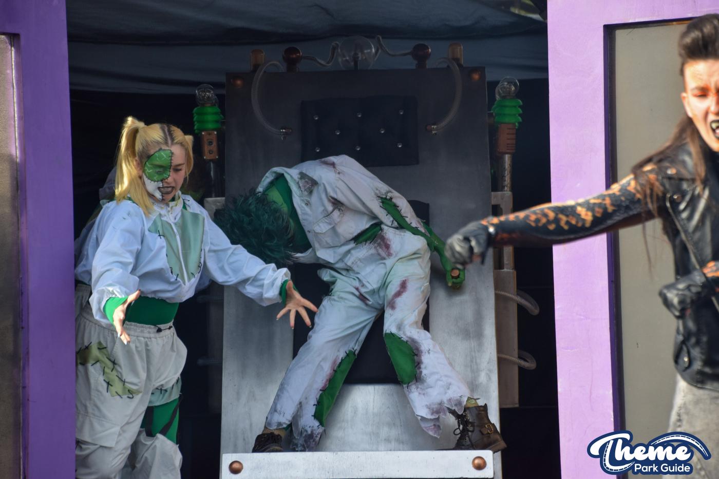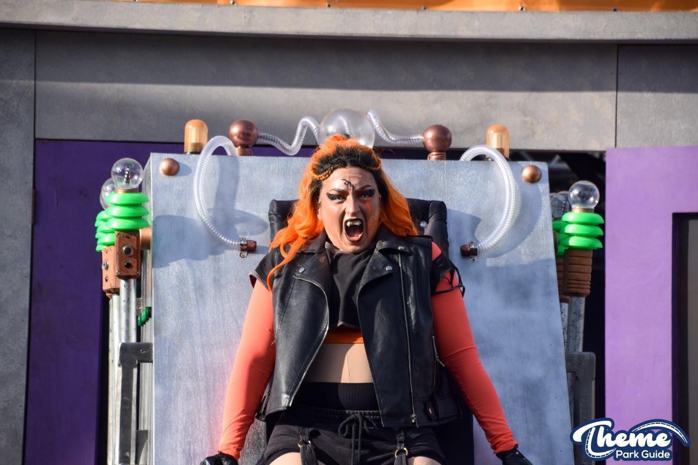 The showpiece of 2025 is undoubtedly Creature Campus: Shock to the System, a reinvention of Thorpe Park’s live entertainment. The stage has been raised, providing excellent sightlines for audiences, and the lighting rig is astonishing – brighter, bolder, and more dynamic than anything seen before at Fright Nights.