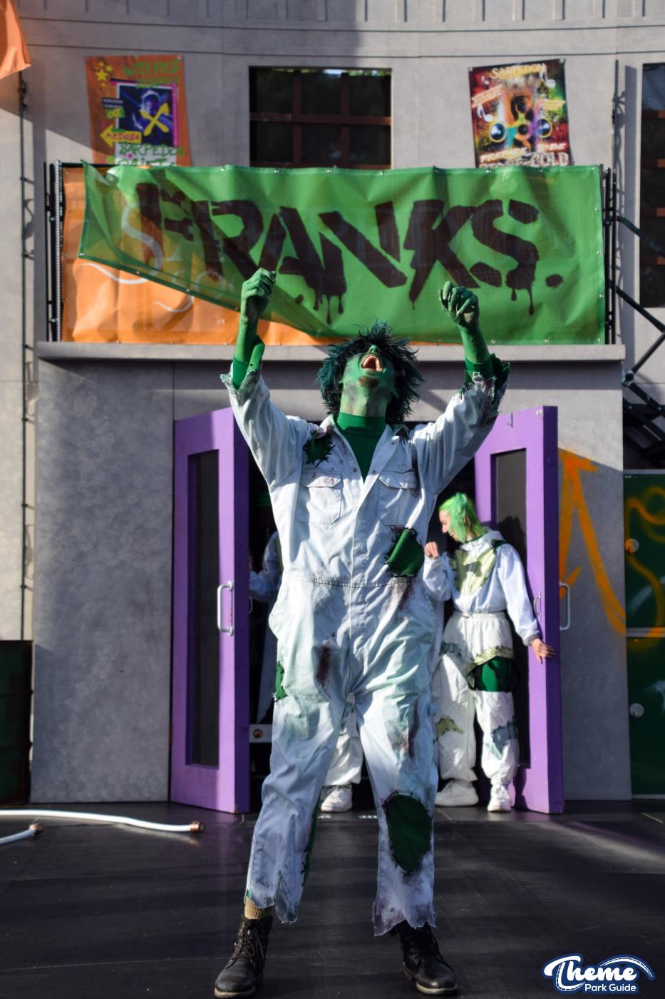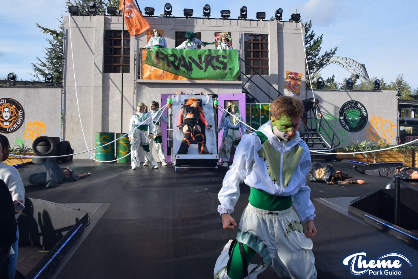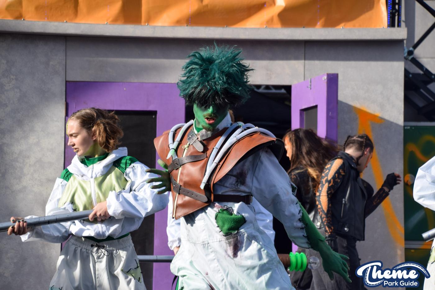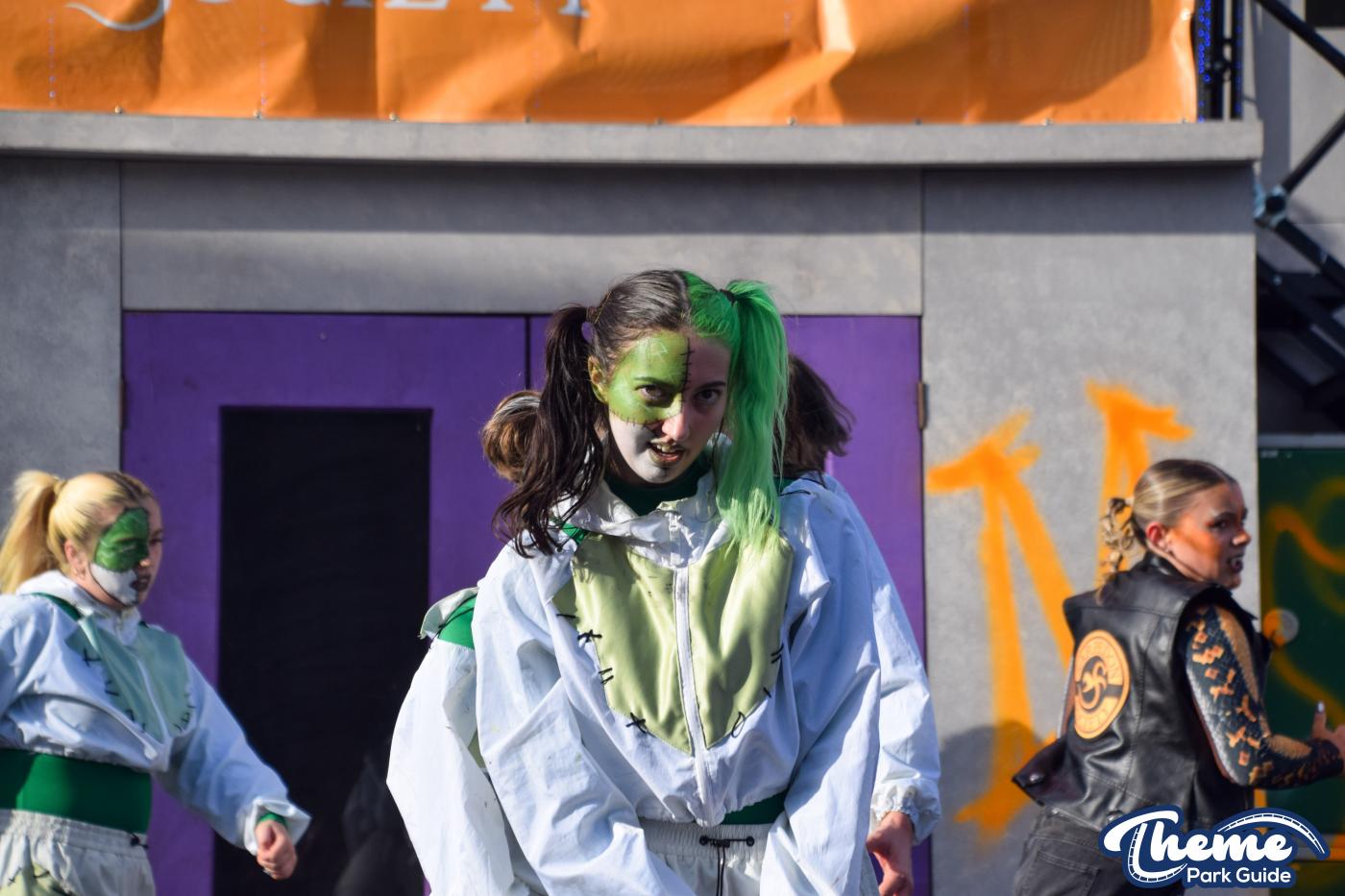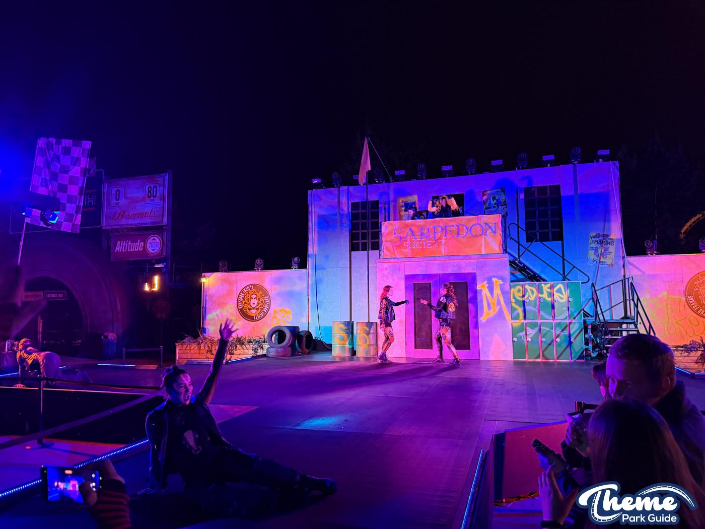 The showpiece of 2025 is undoubtedly Creature Campus: Shock to the System, a reinvention of Thorpe Park’s live entertainment. The stage has been raised, providing excellent sightlines for audiences, and the lighting rig is astonishing – brighter, bolder, and more dynamic than anything seen before at Fright Nights.