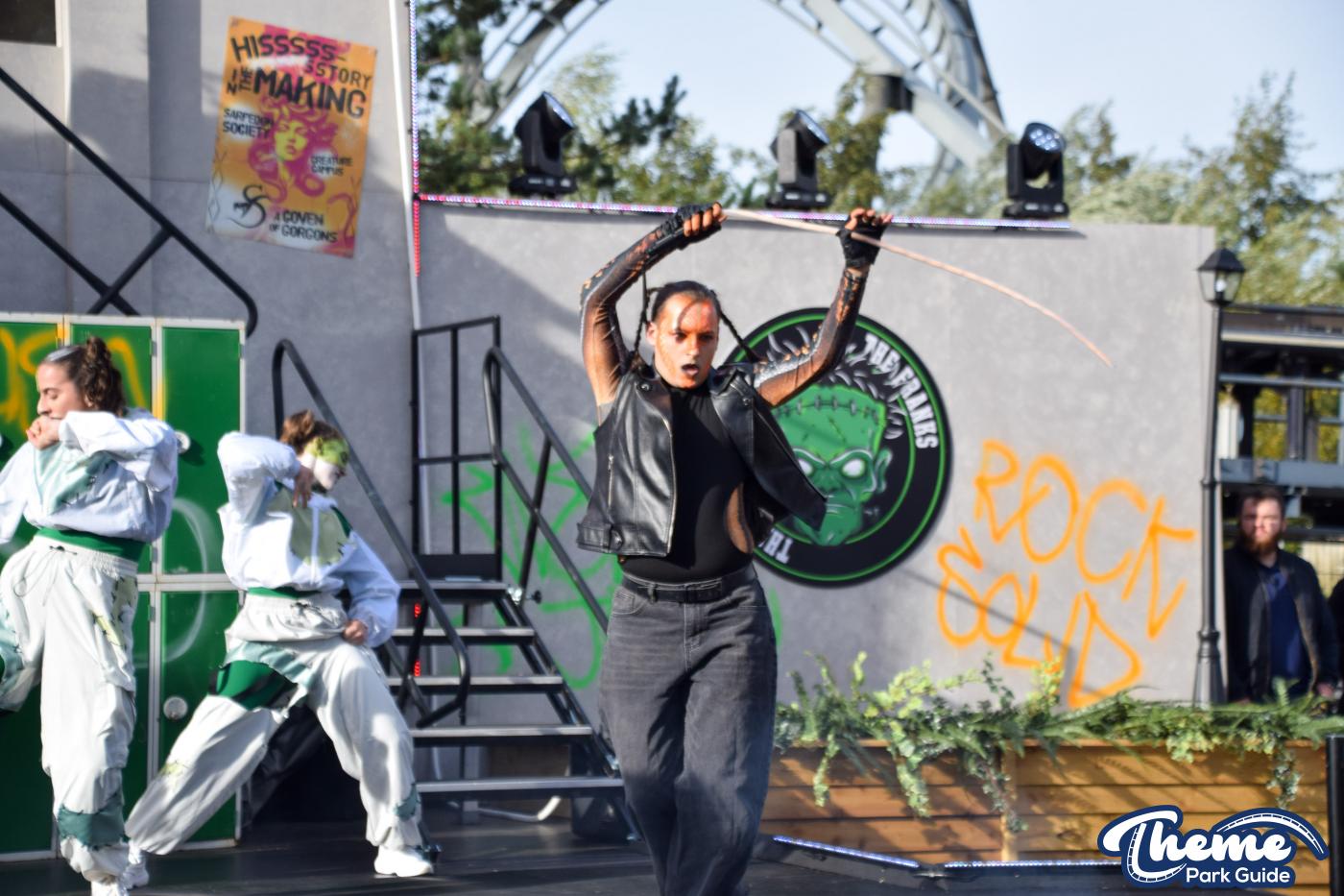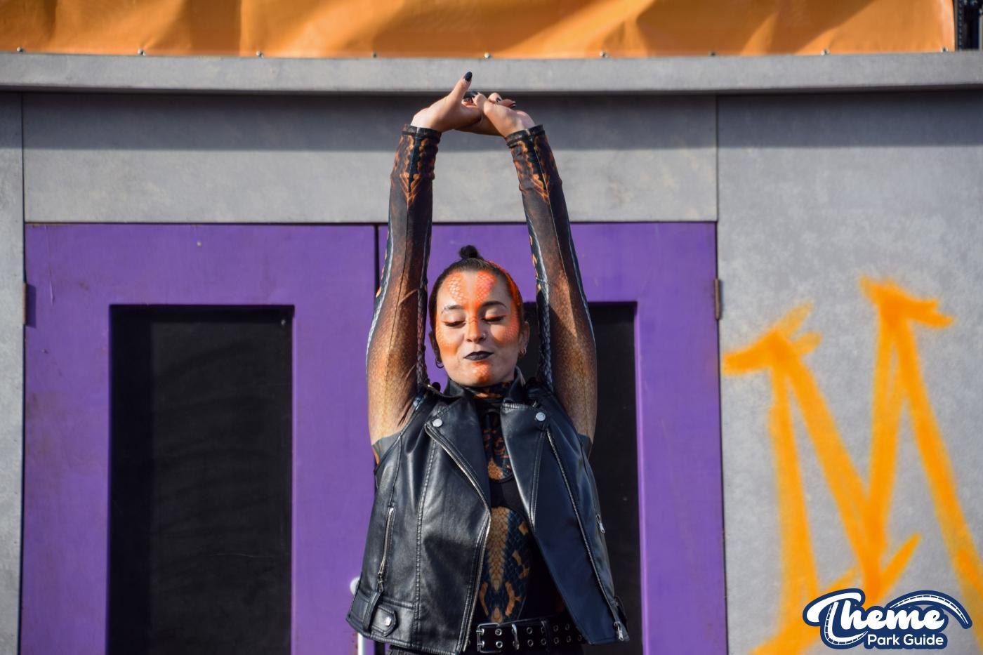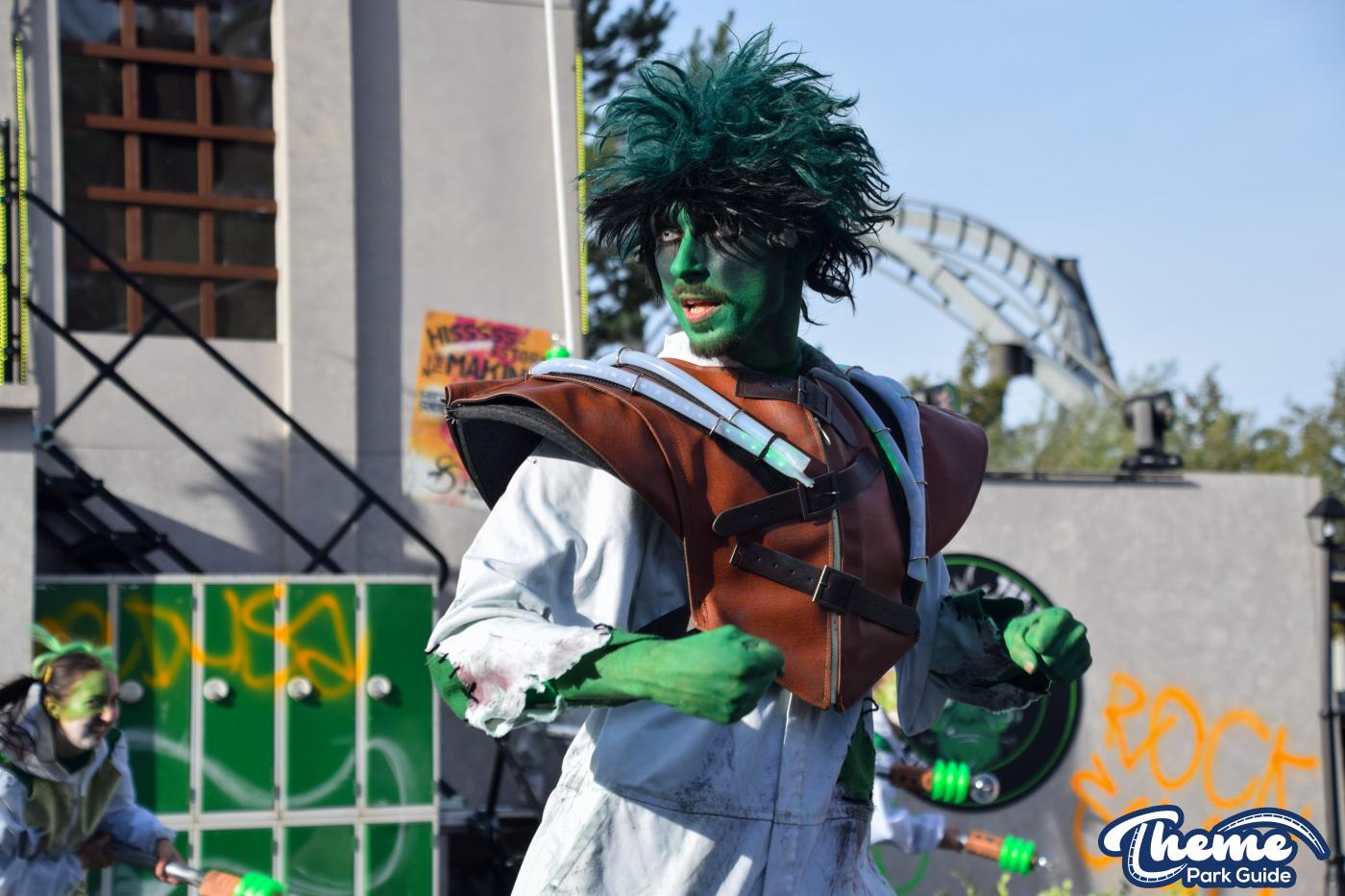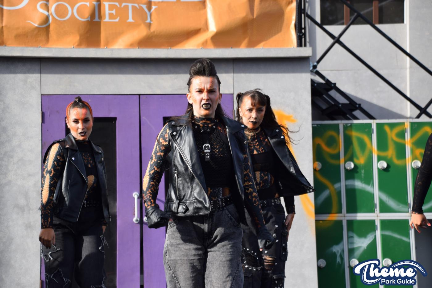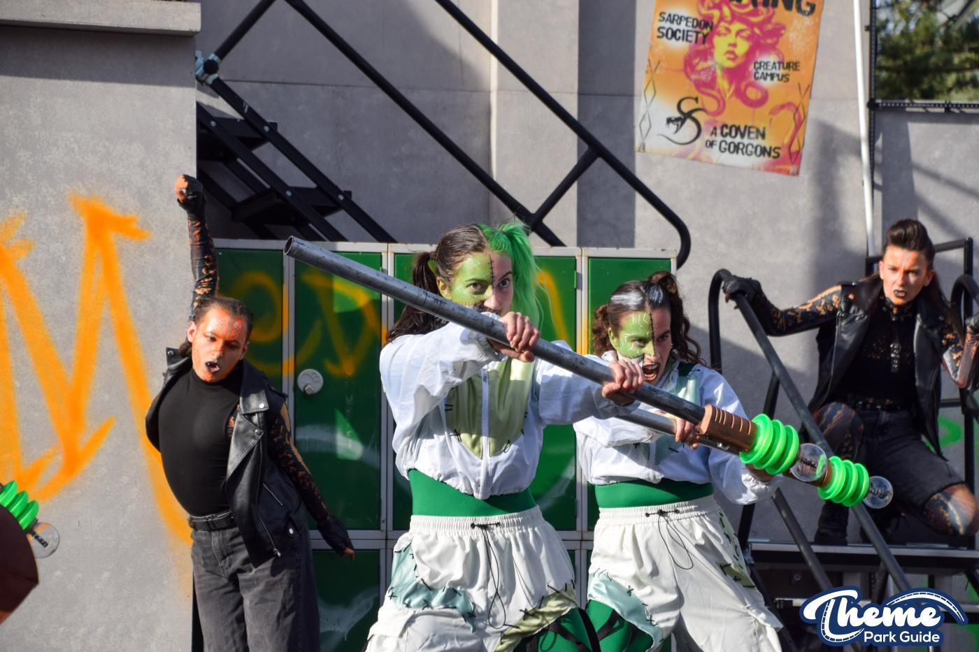 The showpiece of 2025 is undoubtedly Creature Campus: Shock to the System, a reinvention of Thorpe Park’s live entertainment. The stage has been raised, providing excellent sightlines for audiences, and the lighting rig is astonishing – brighter, bolder, and more dynamic than anything seen before at Fright Nights.