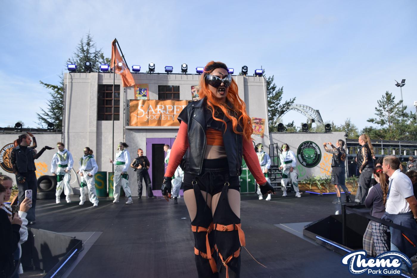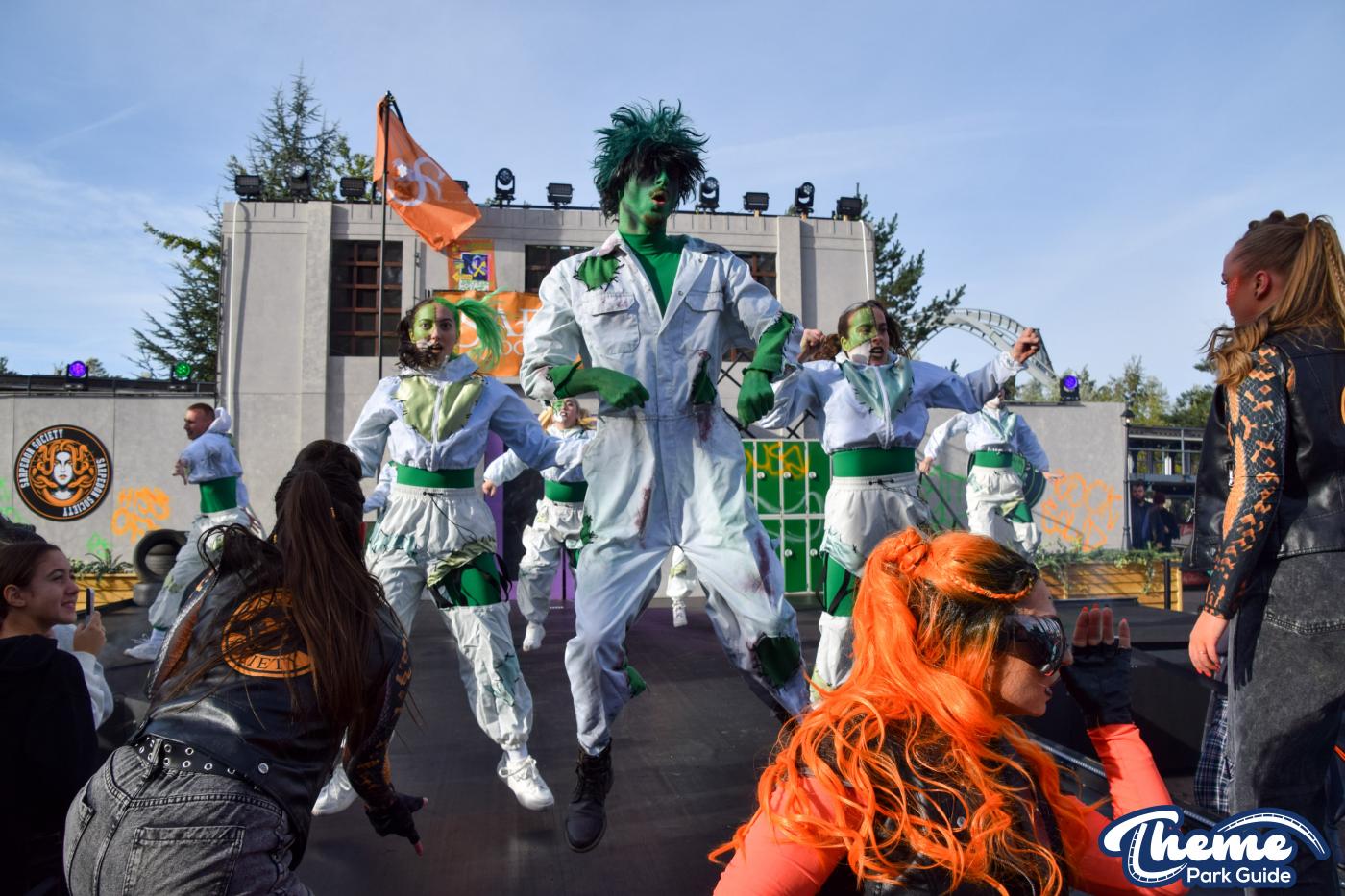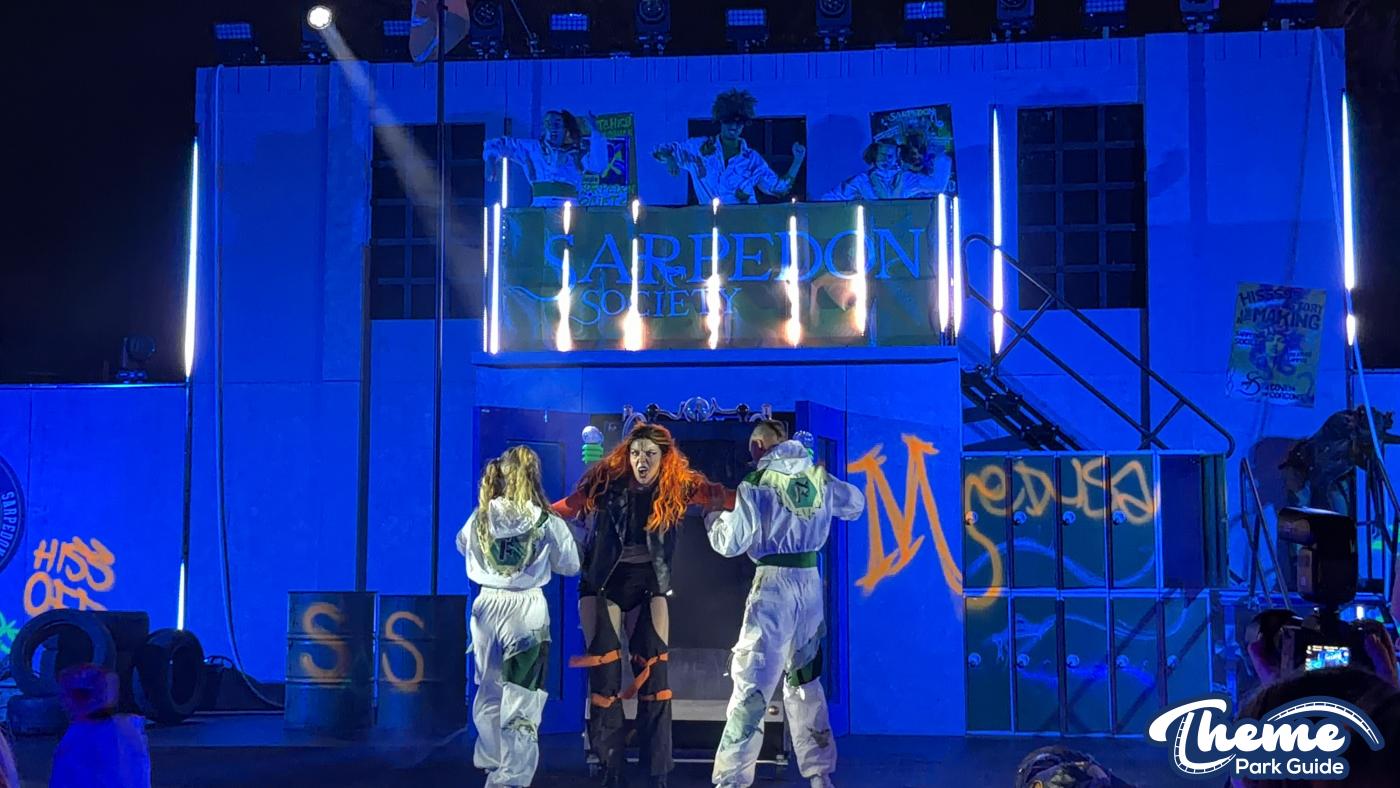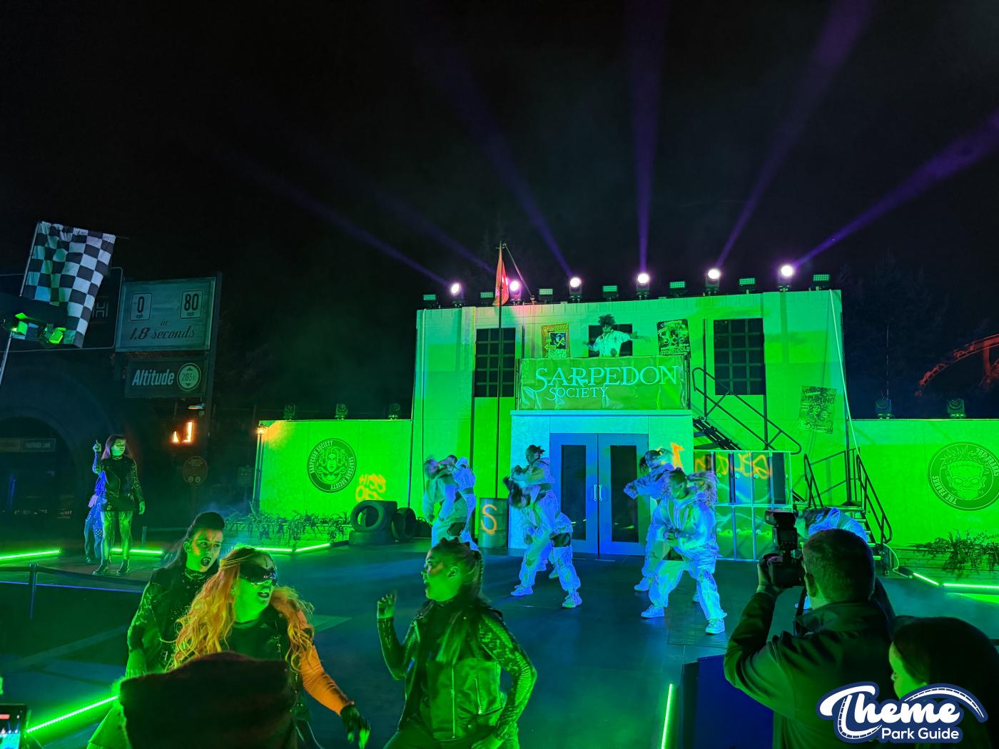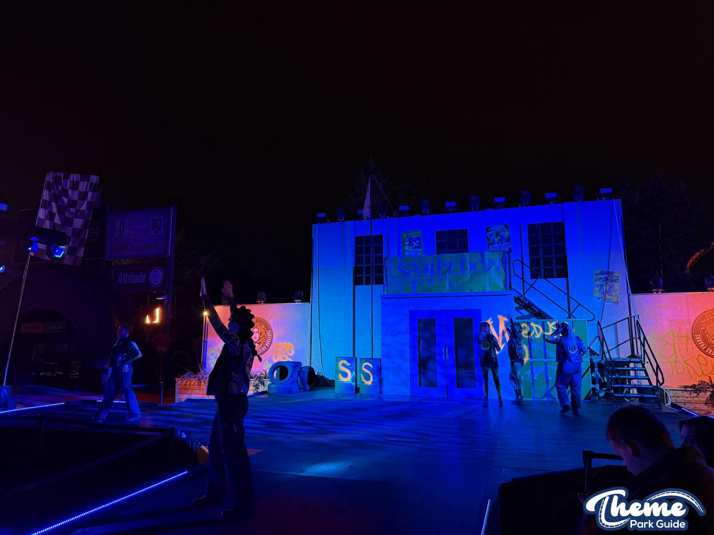 The showpiece of 2025 is undoubtedly Creature Campus: Shock to the System, a reinvention of Thorpe Park’s live entertainment. The stage has been raised, providing excellent sightlines for audiences, and the lighting rig is astonishing – brighter, bolder, and more dynamic than anything seen before at Fright Nights.