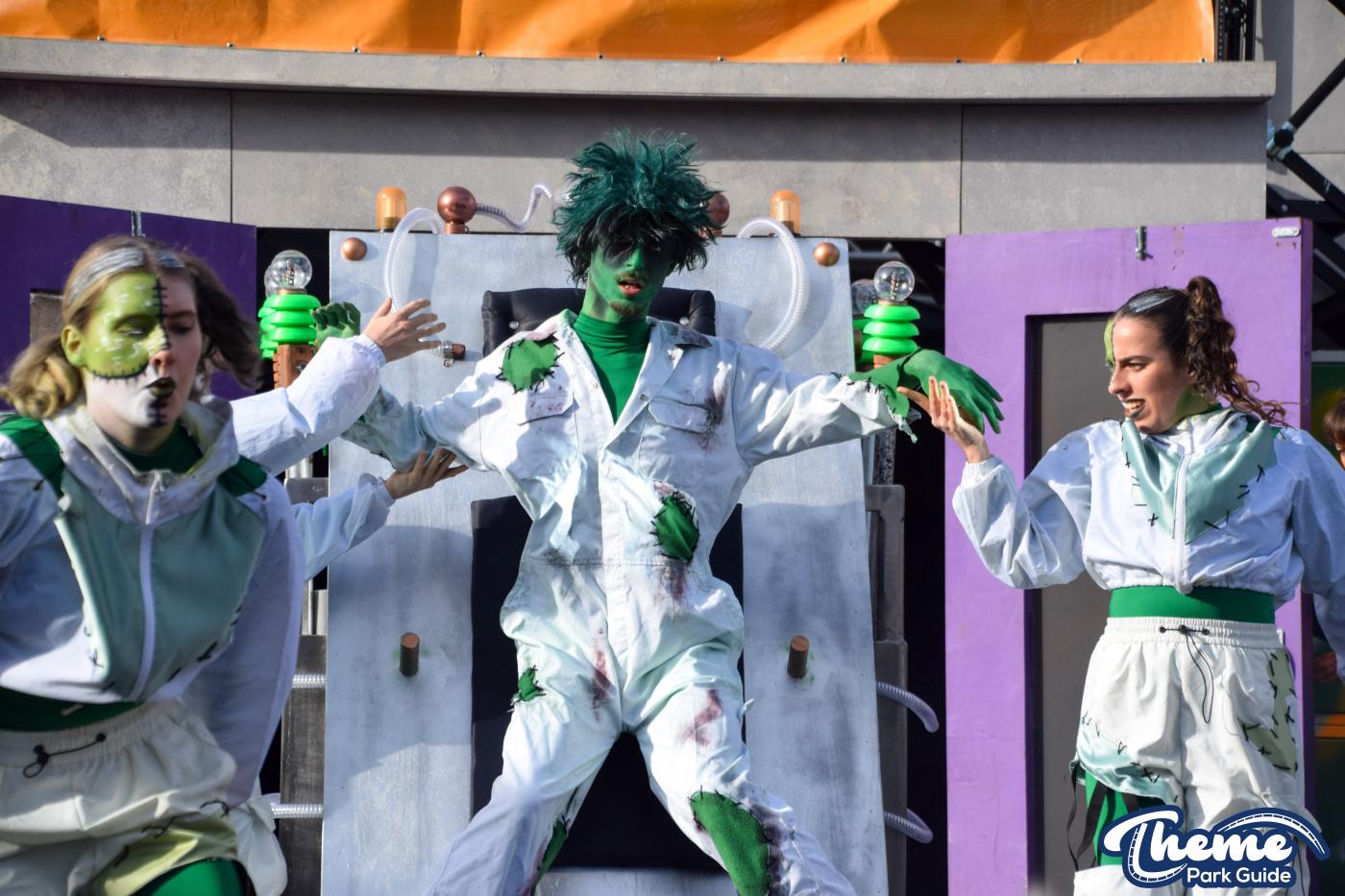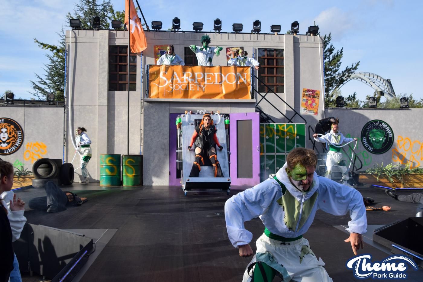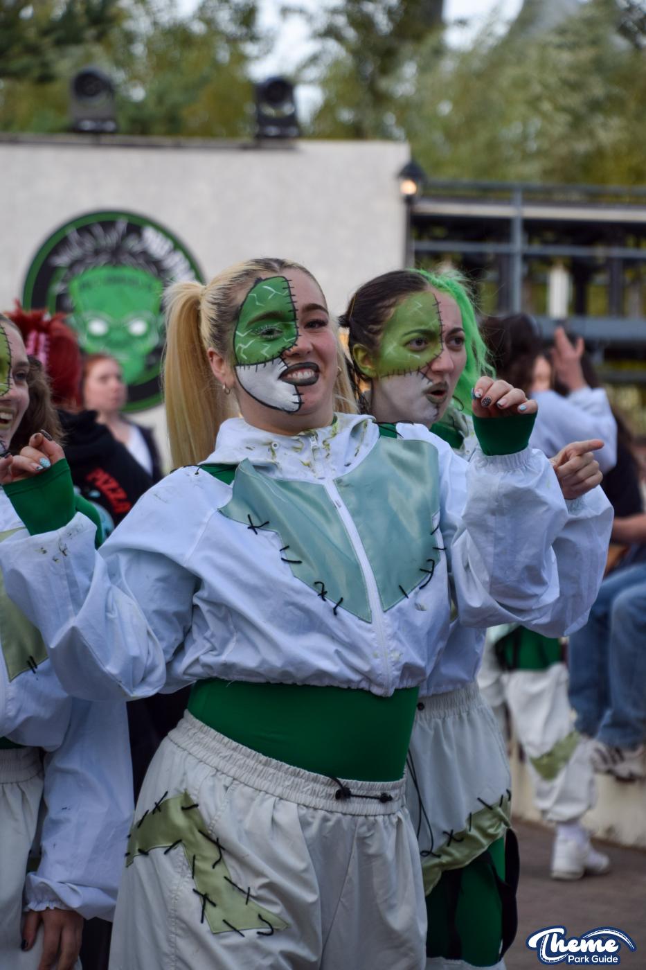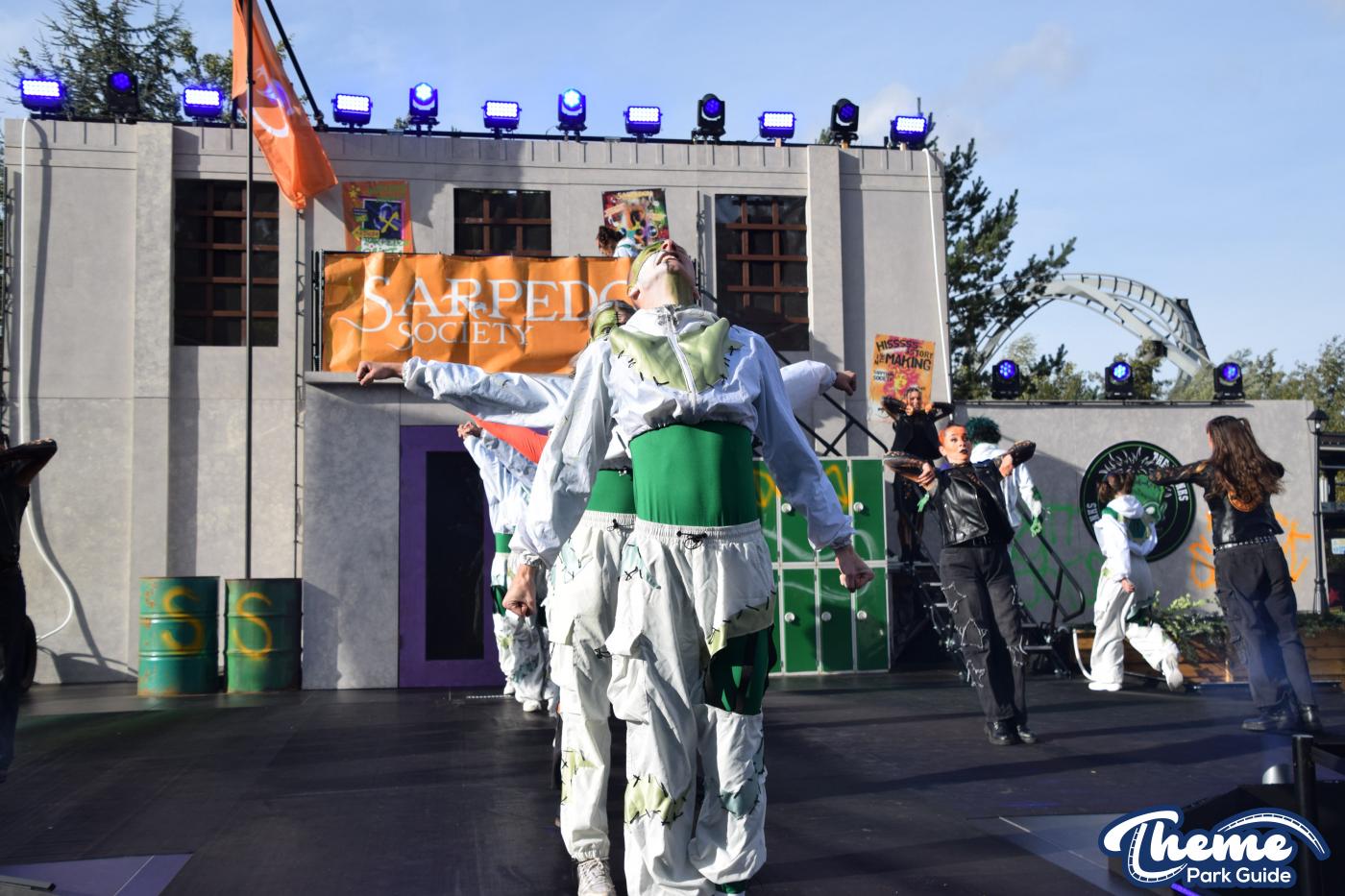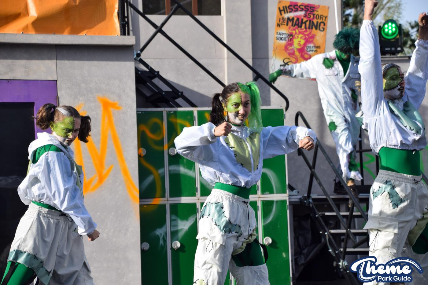The showpiece of 2025 is undoubtedly Creature Campus: Shock to the System, a reinvention of Thorpe Park’s live entertainment. The stage has been raised, providing excellent sightlines for audiences, and the lighting rig is astonishing – brighter, bolder, and more dynamic than anything seen before at Fright Nights.