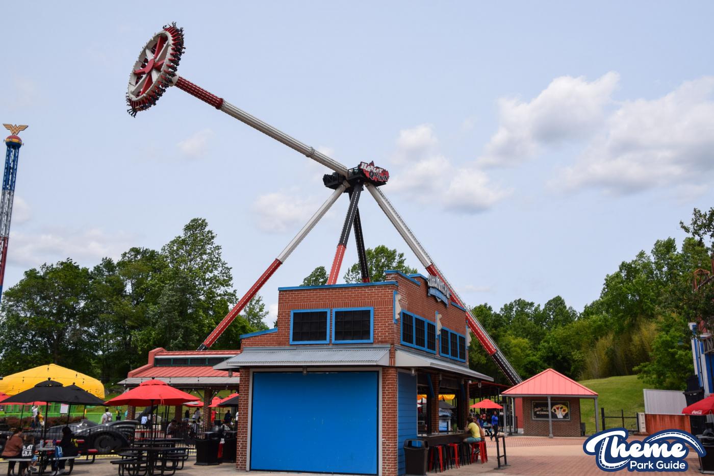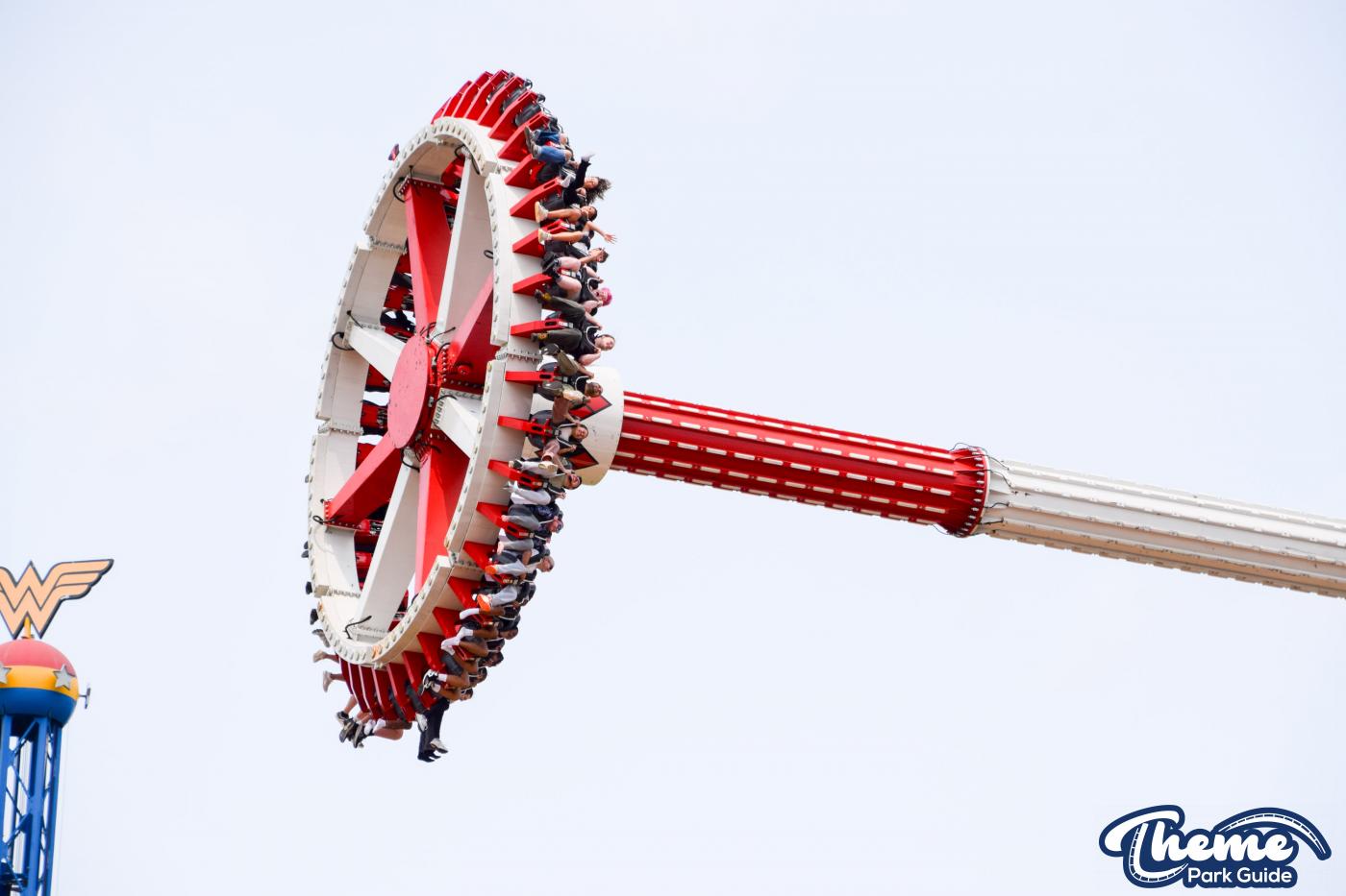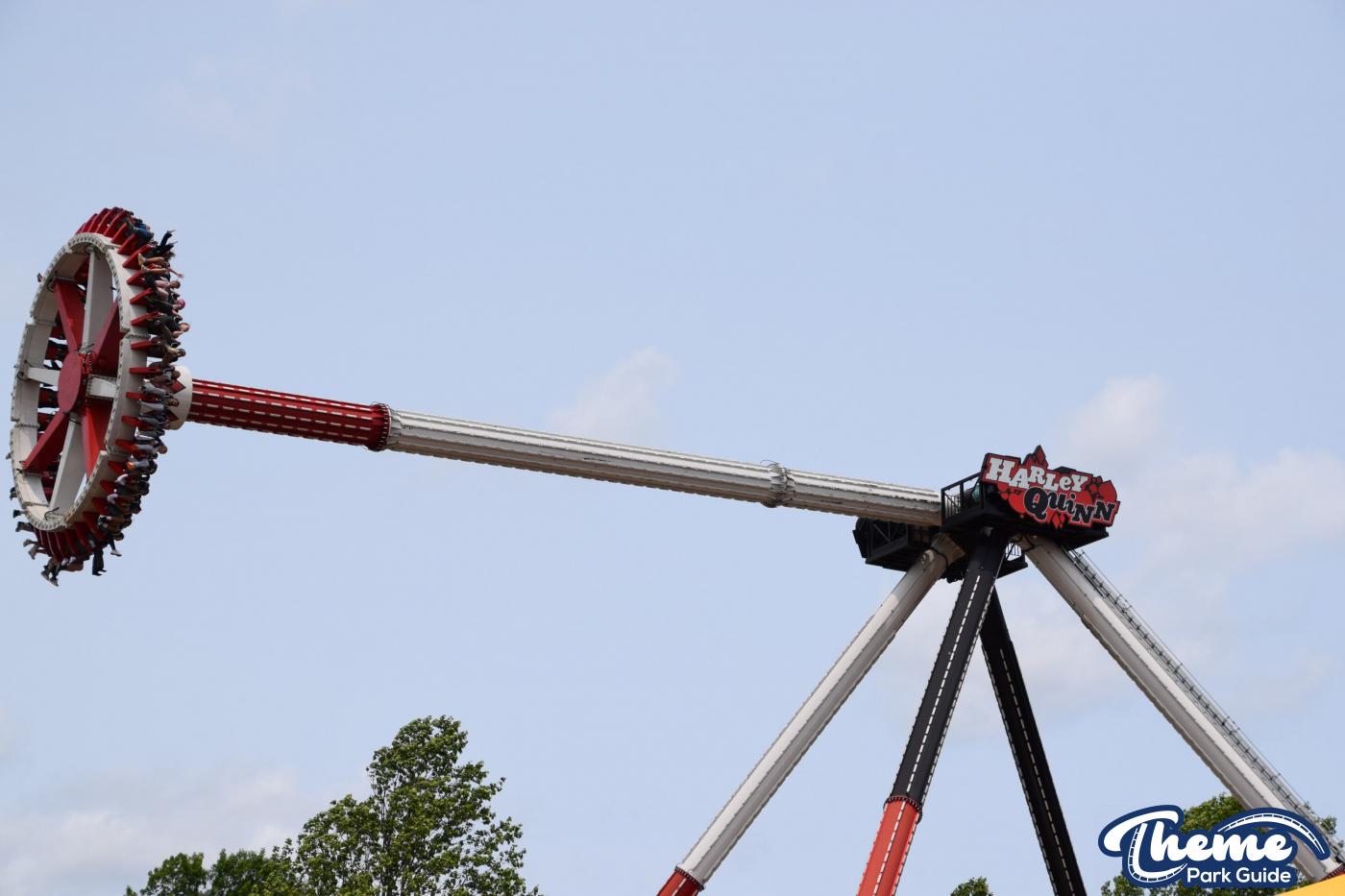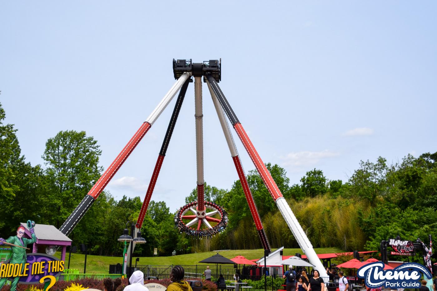 Harley Quinn Spinsanity was one of Six Flags America’s most visually striking thrill rides, located in the Gotham City area. Opened in 2021, the pendulum-style attraction swung riders up to 15 stories in the air while spinning at high speeds—reaching up to 70 mph at the peak of each swing. Manufactured by Zamperla, it seated 40 riders who rotated counter-clockwise as the pendulum arced back and forth, creating intense sensations of weightlessness. The ride was themed to the chaotic DC villain Harley Quinn and stood out as one of the tallest and fastest pendulum rides in the region, adding a new level of thrill to the park’s lineup in its final years.