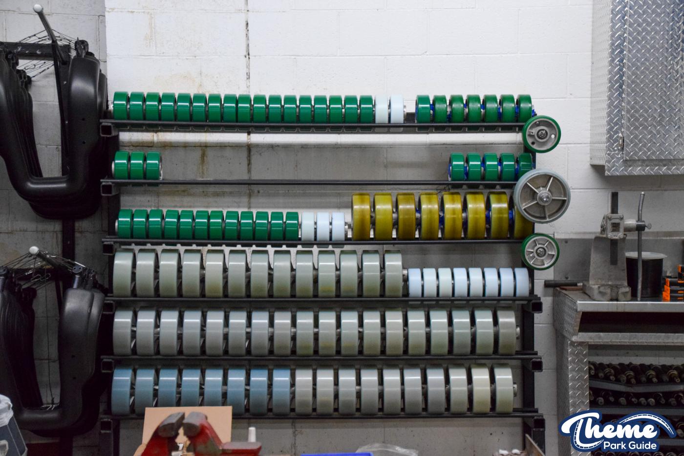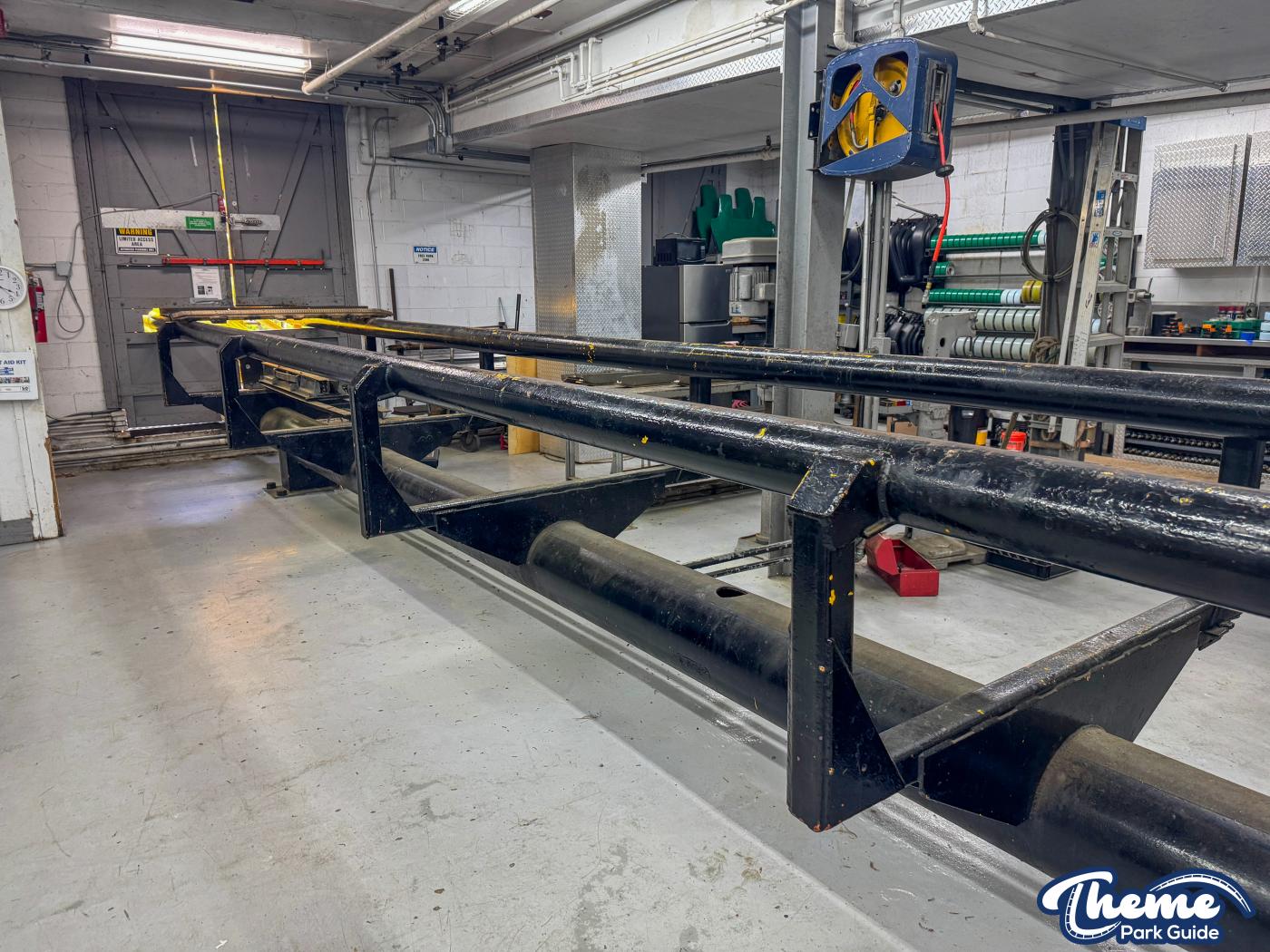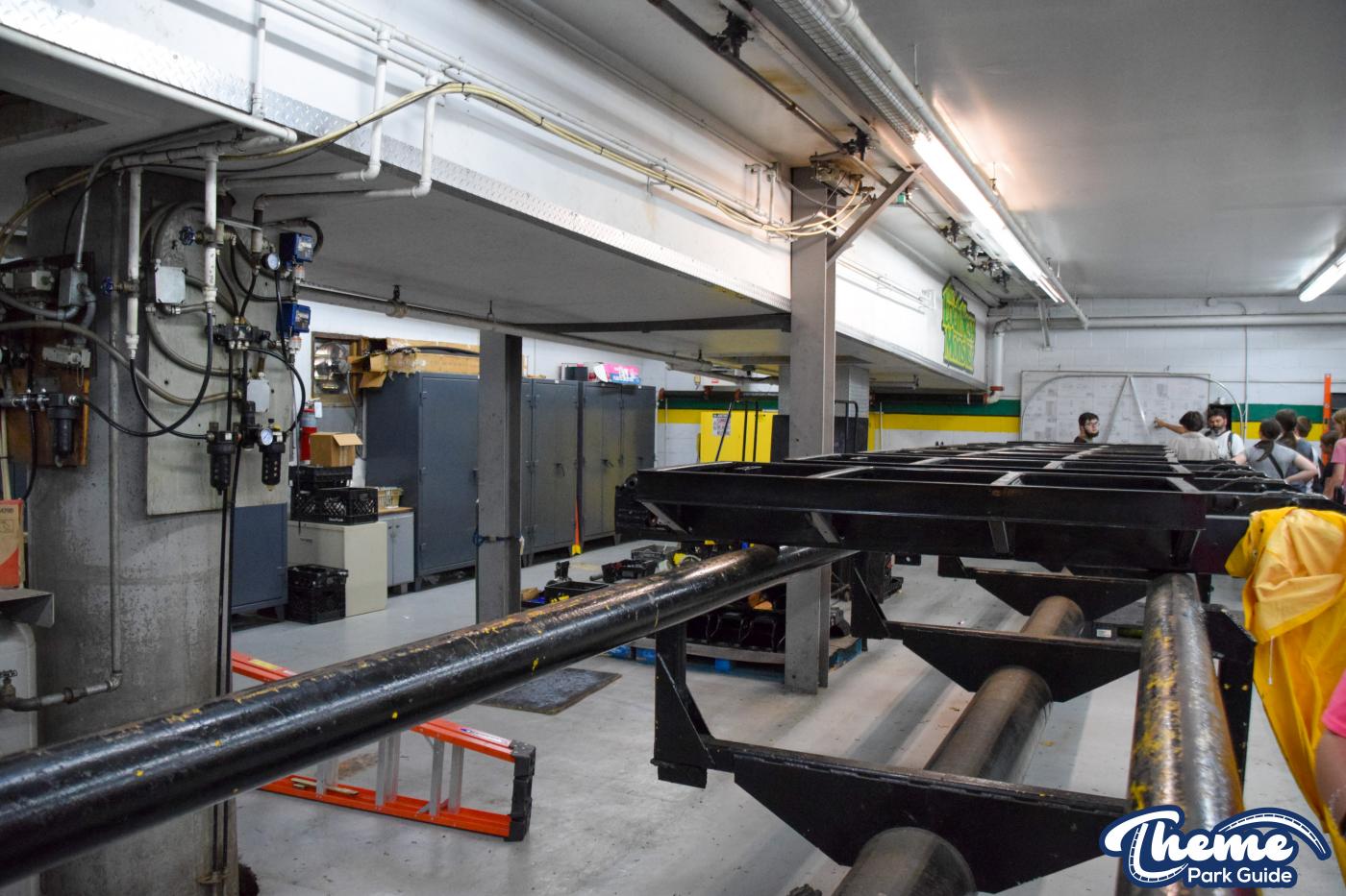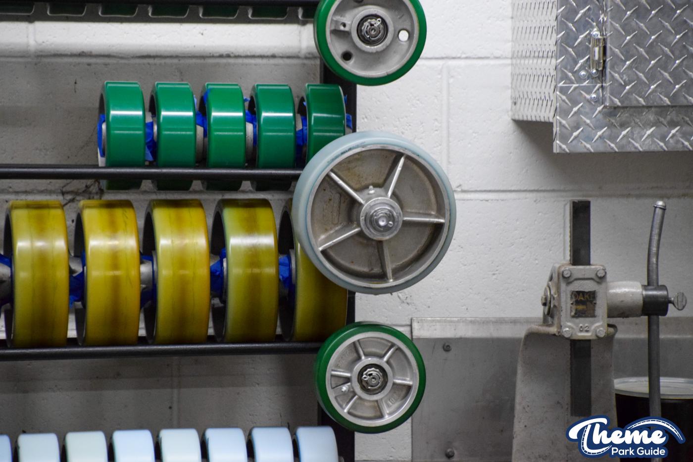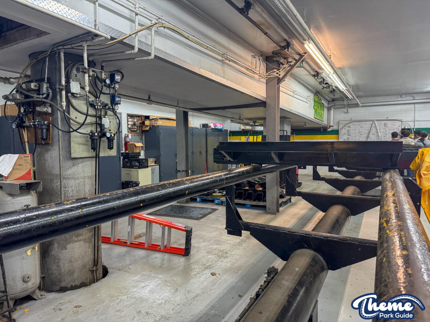 From below, we could also see the mechanisms controlling the air gates in the station above — a rare and intriguing perspective on how the ride operates. Around us were stacks of wheels and other components, ready to be swapped out to keep the coaster running smoothly.