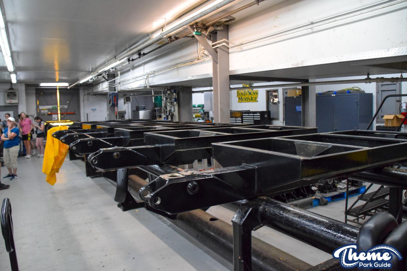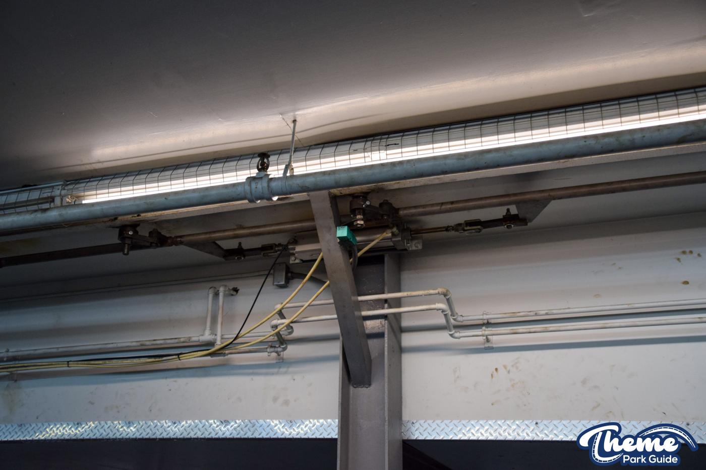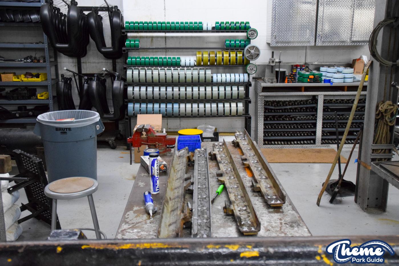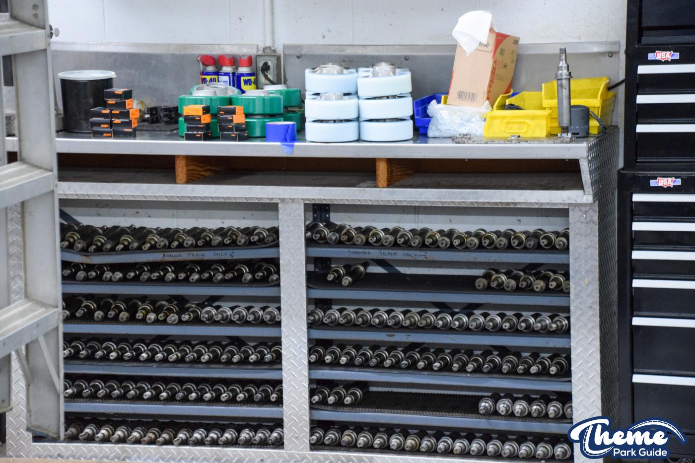 From below, we could also see the mechanisms controlling the air gates in the station above — a rare and intriguing perspective on how the ride operates. Around us were stacks of wheels and other components, ready to be swapped out to keep the coaster running smoothly.