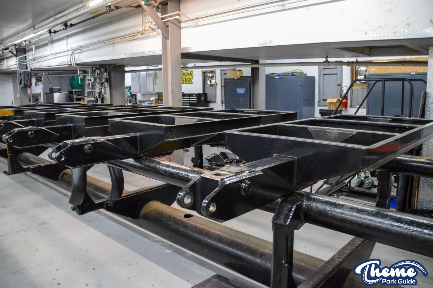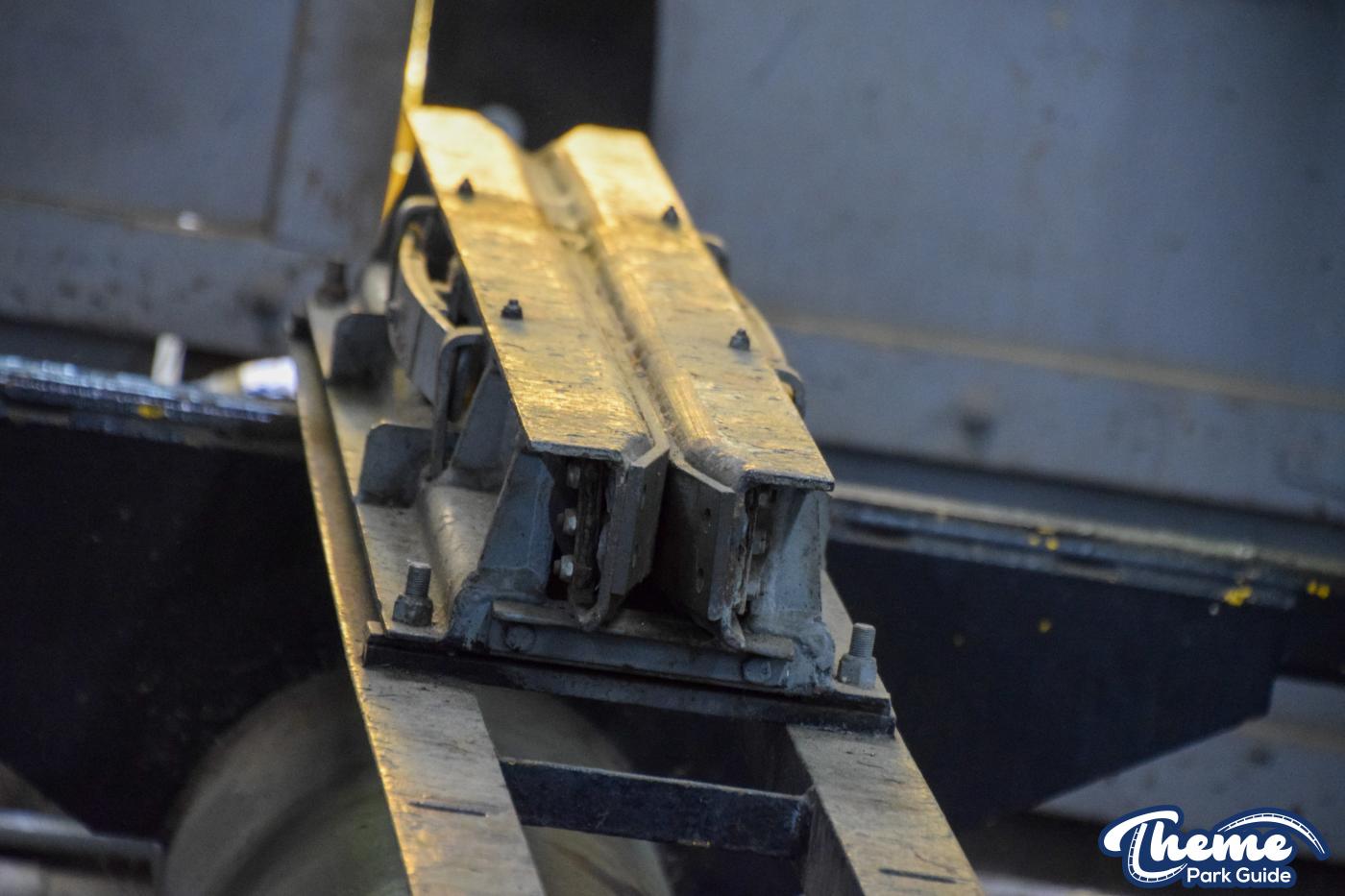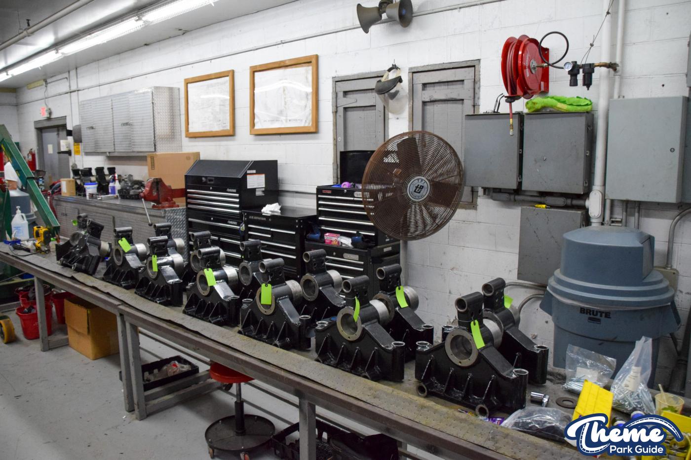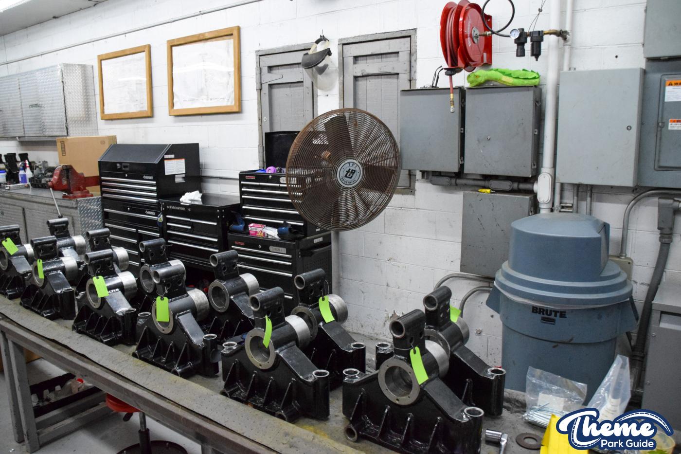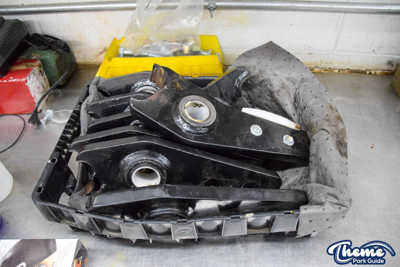 From below, we could also see the mechanisms controlling the air gates in the station above — a rare and intriguing perspective on how the ride operates. Around us were stacks of wheels and other components, ready to be swapped out to keep the coaster running smoothly.