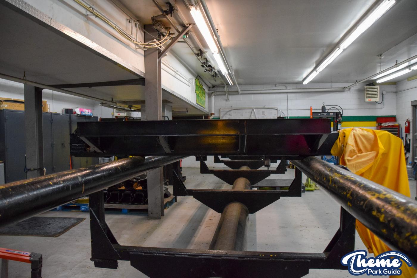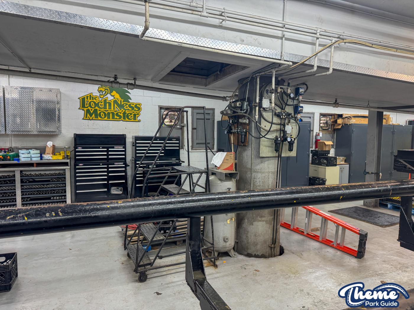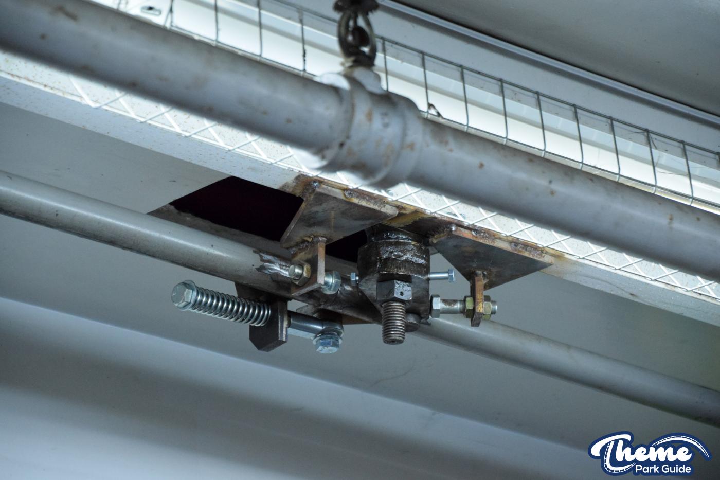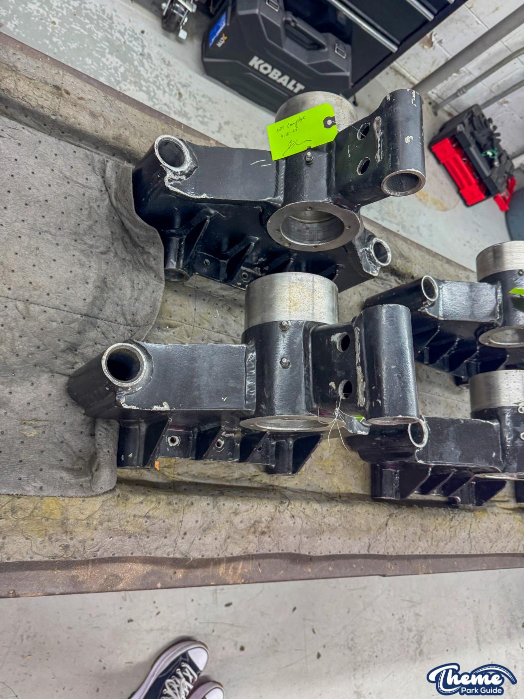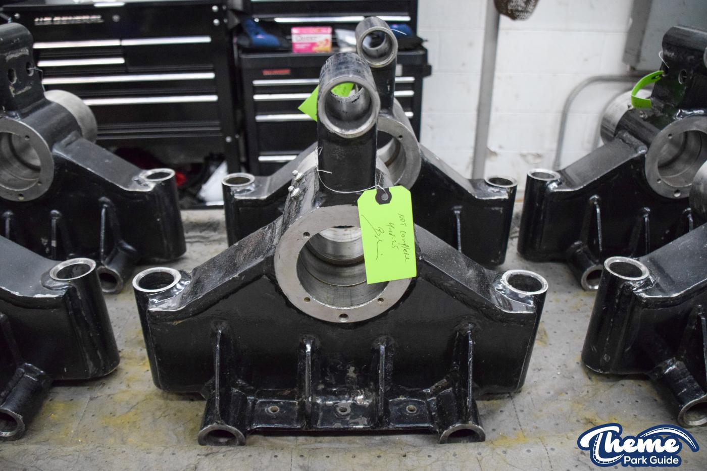 From below, we could also see the mechanisms controlling the air gates in the station above — a rare and intriguing perspective on how the ride operates. Around us were stacks of wheels and other components, ready to be swapped out to keep the coaster running smoothly.