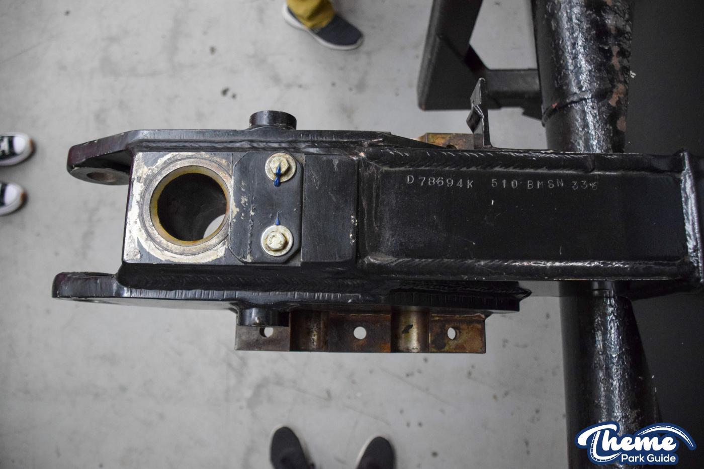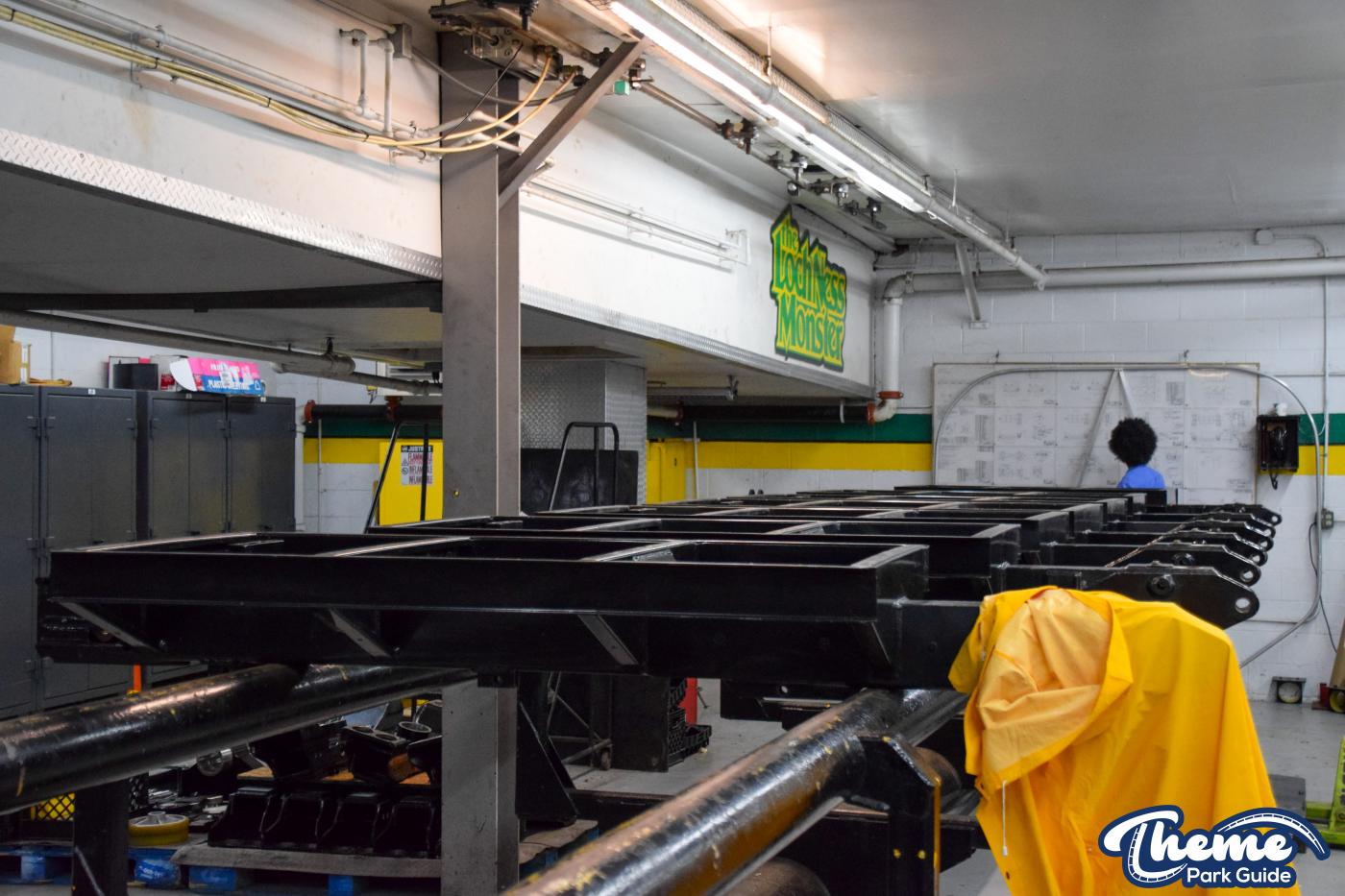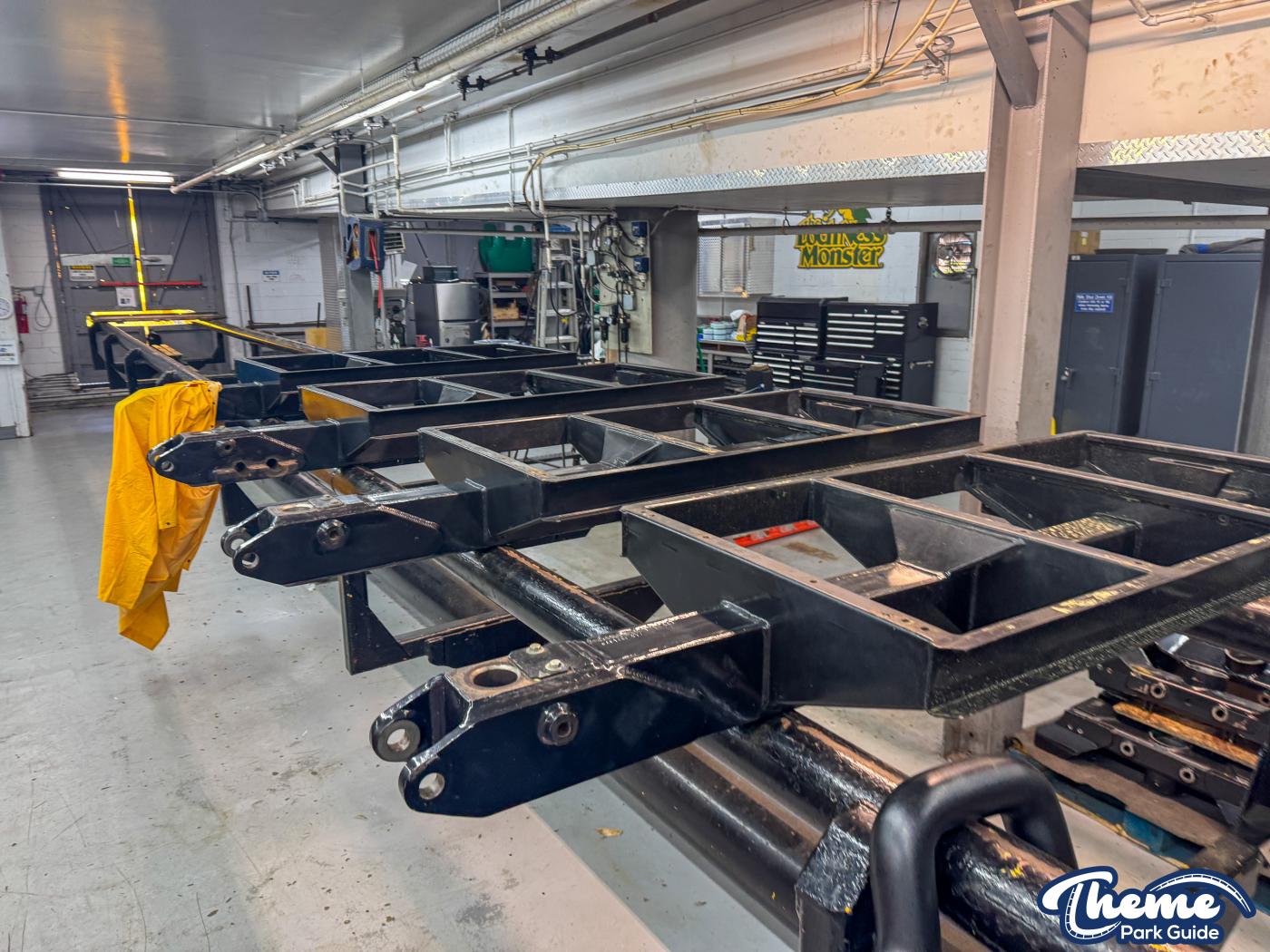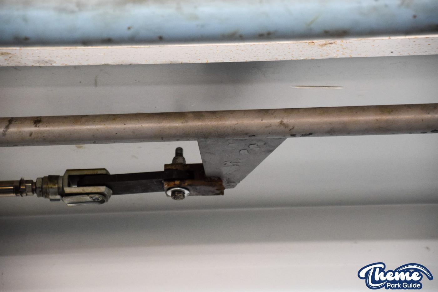 From below, we could also see the mechanisms controlling the air gates in the station above — a rare and intriguing perspective on how the ride operates. Around us were stacks of wheels and other components, ready to be swapped out to keep the coaster running smoothly.