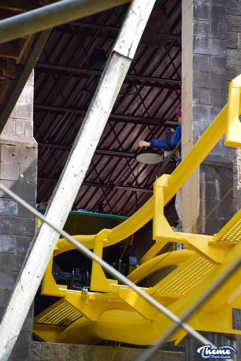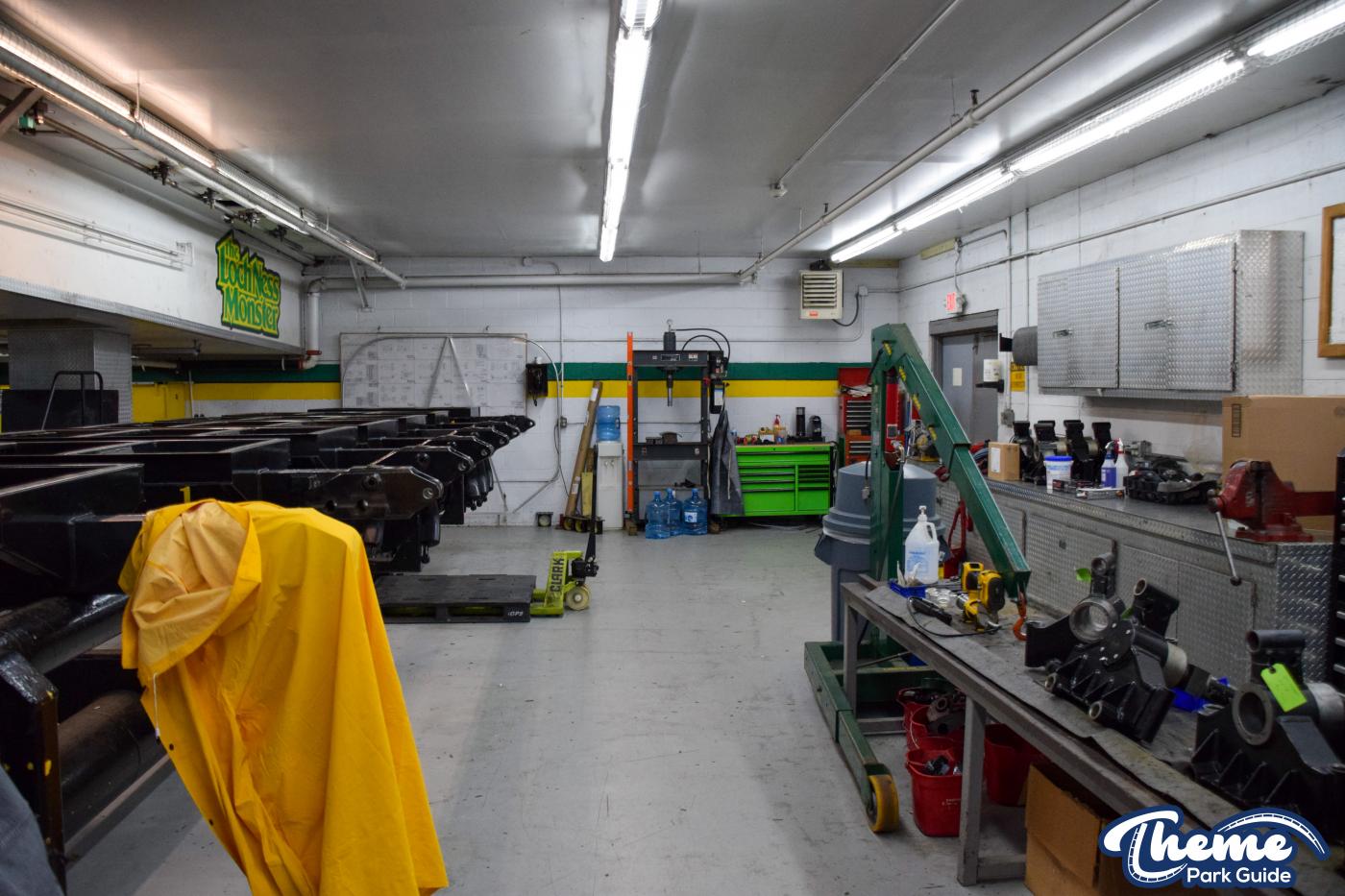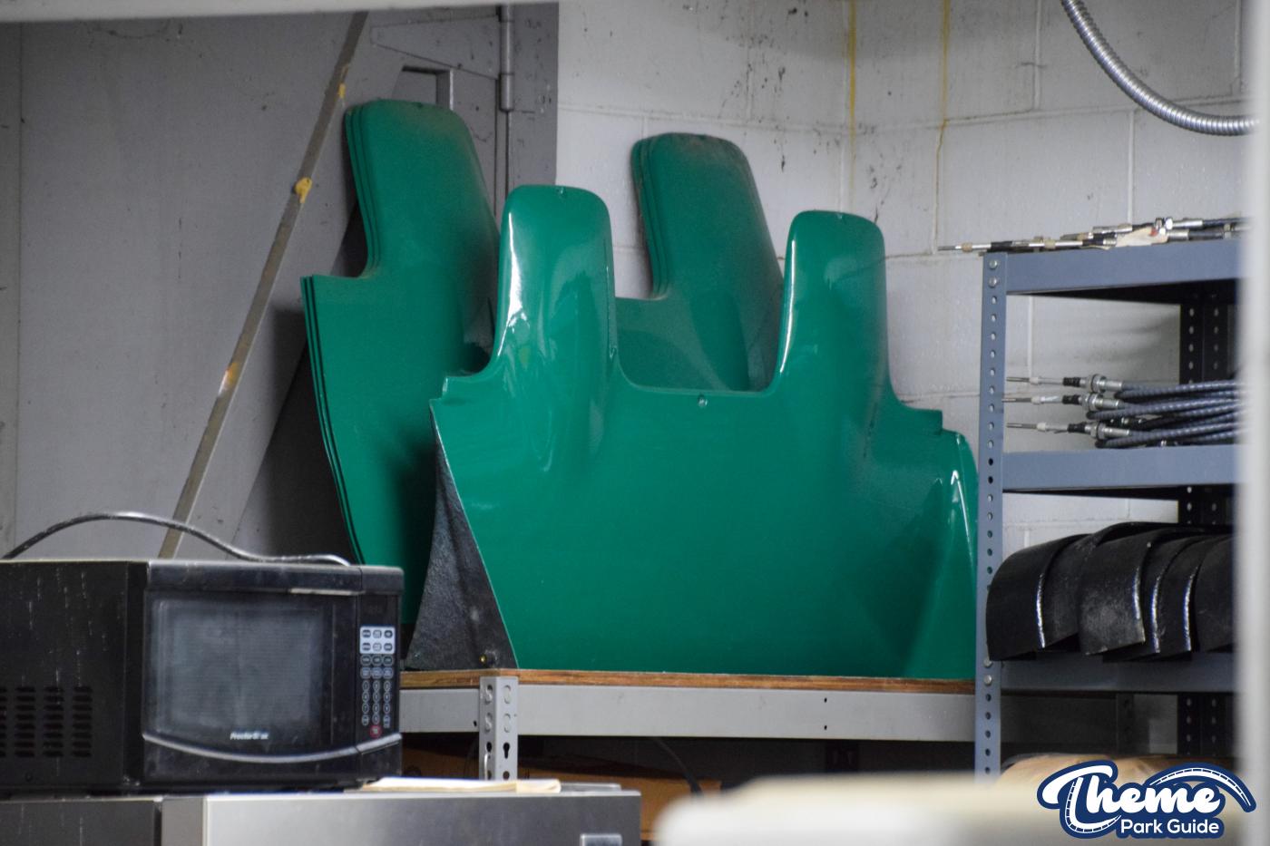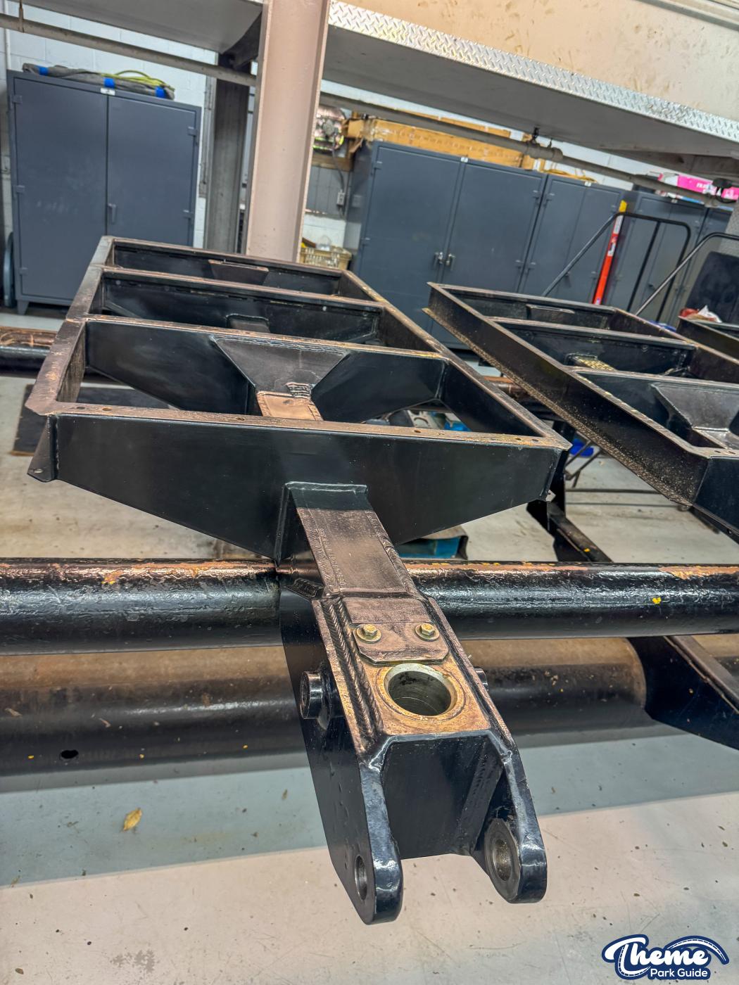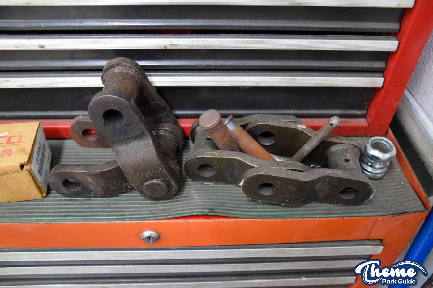 From below, we could also see the mechanisms controlling the air gates in the station above — a rare and intriguing perspective on how the ride operates. Around us were stacks of wheels and other components, ready to be swapped out to keep the coaster running smoothly.