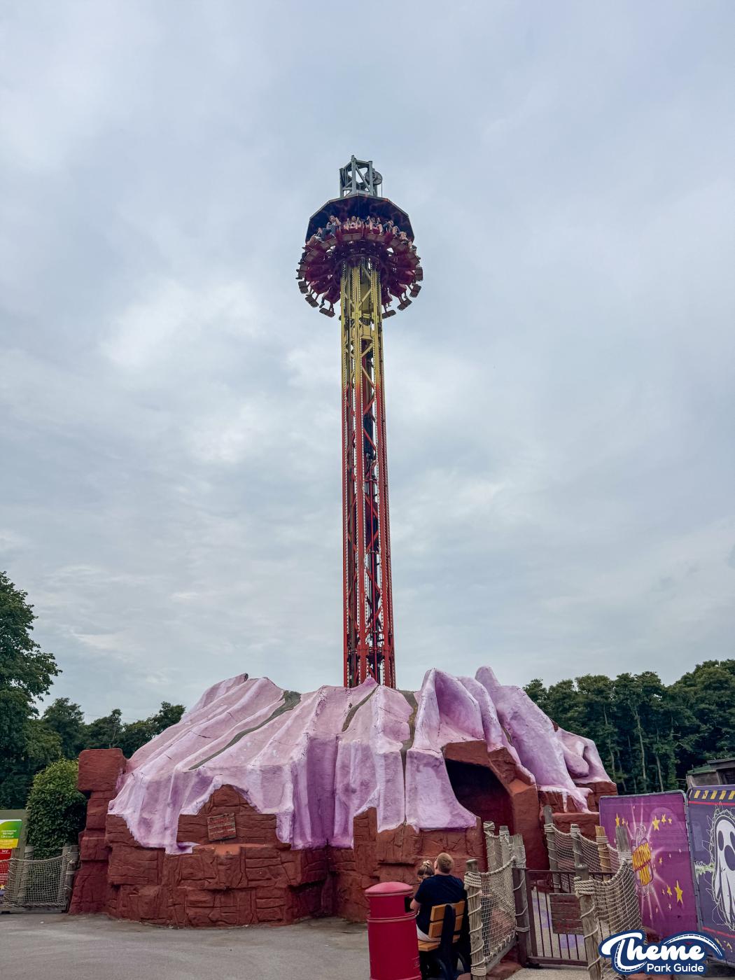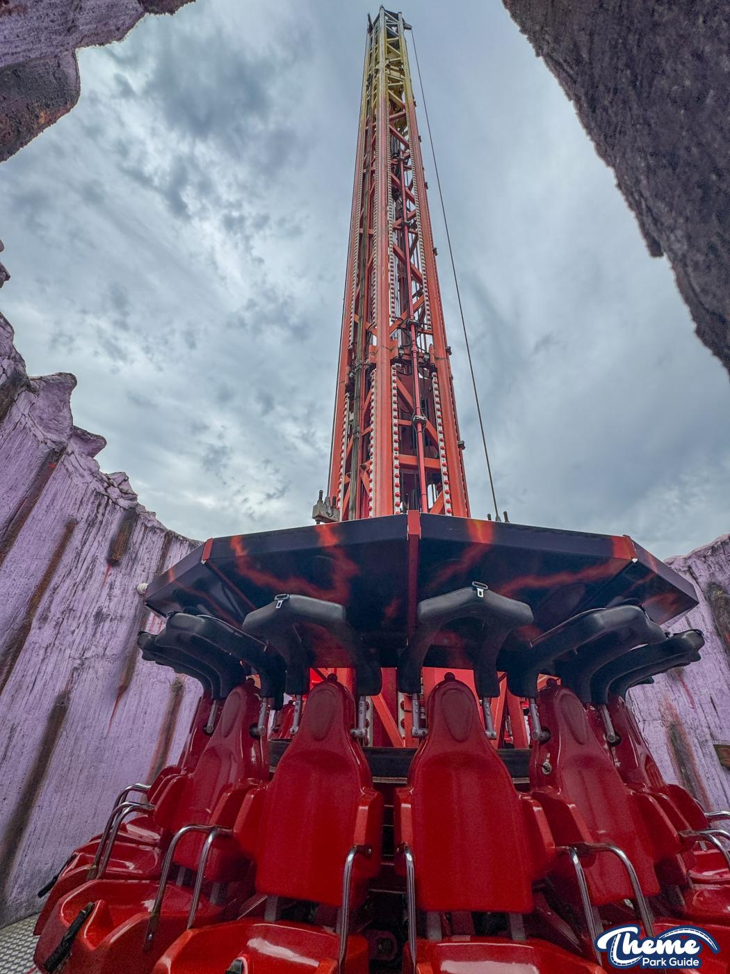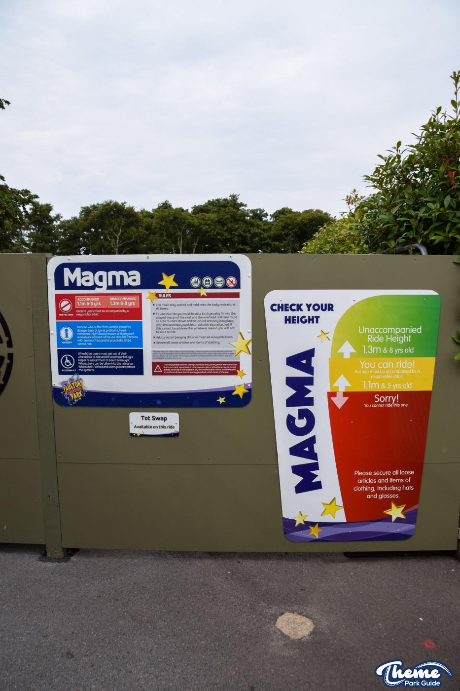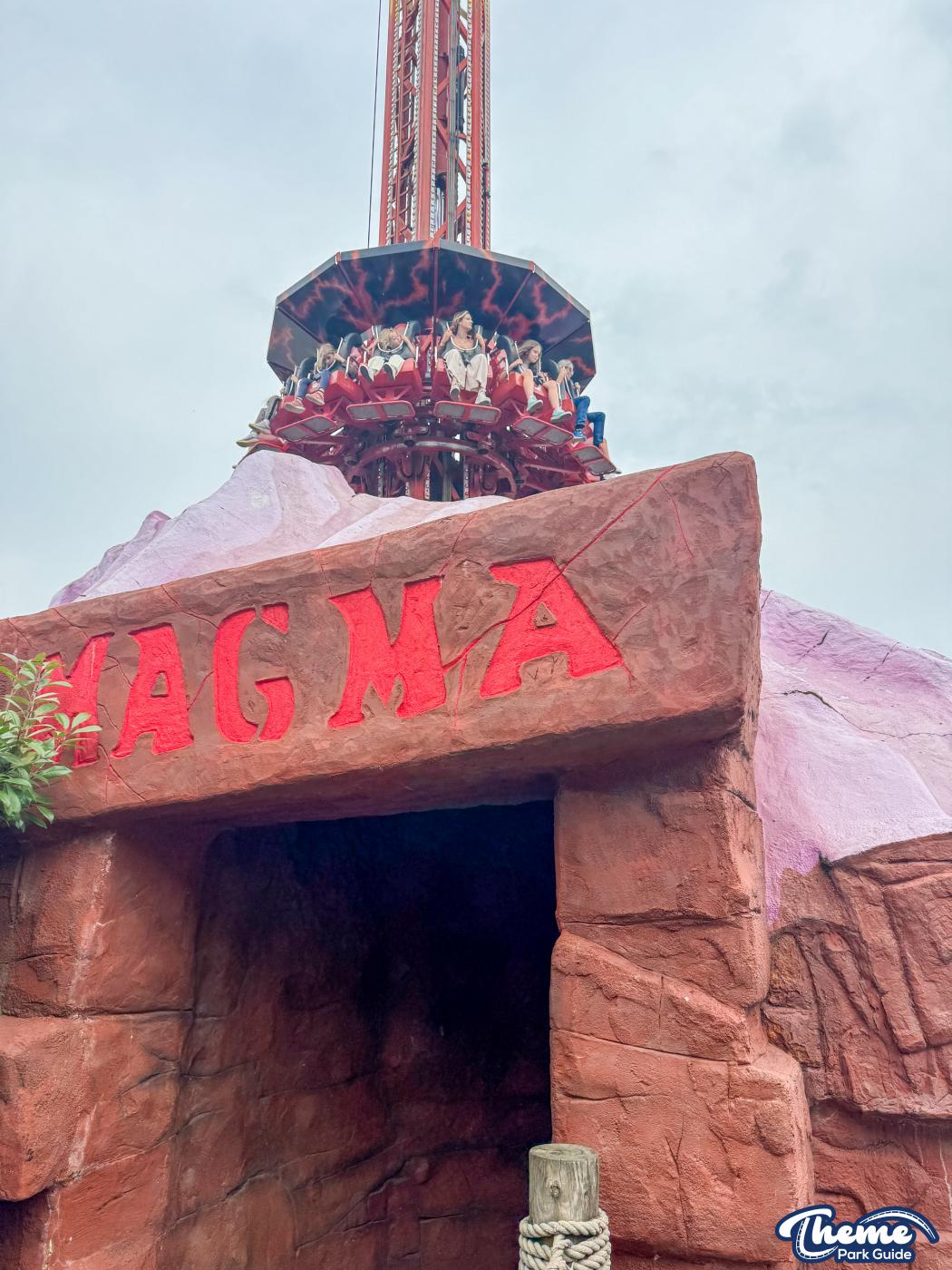 Hidden beneath the silently smoking volcano MAGMA awaits. Only the brave enter the caverns of molten rock and discover the Jurassic secret entombed below. When MAGMA erupts adventurers rise up and spin out from the smoke 25 metres into the clear sky above, only to face a stomach churning plunge back into the fiery heart of the mountain below!
