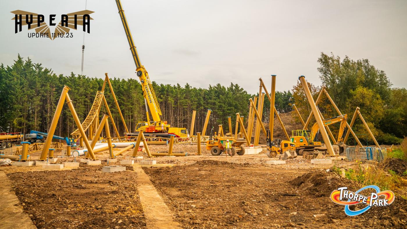 It’s the second day of Hyperia going vertical at Thorpe Park and already the park is making amazing progress with the rollercoaster structure. Mack Rides are on site to help assist with the construction of the new rollercoaster and judging by them previously building Voltron at Europa Park it won’t be long until this ride is towering over the skyline of the park.