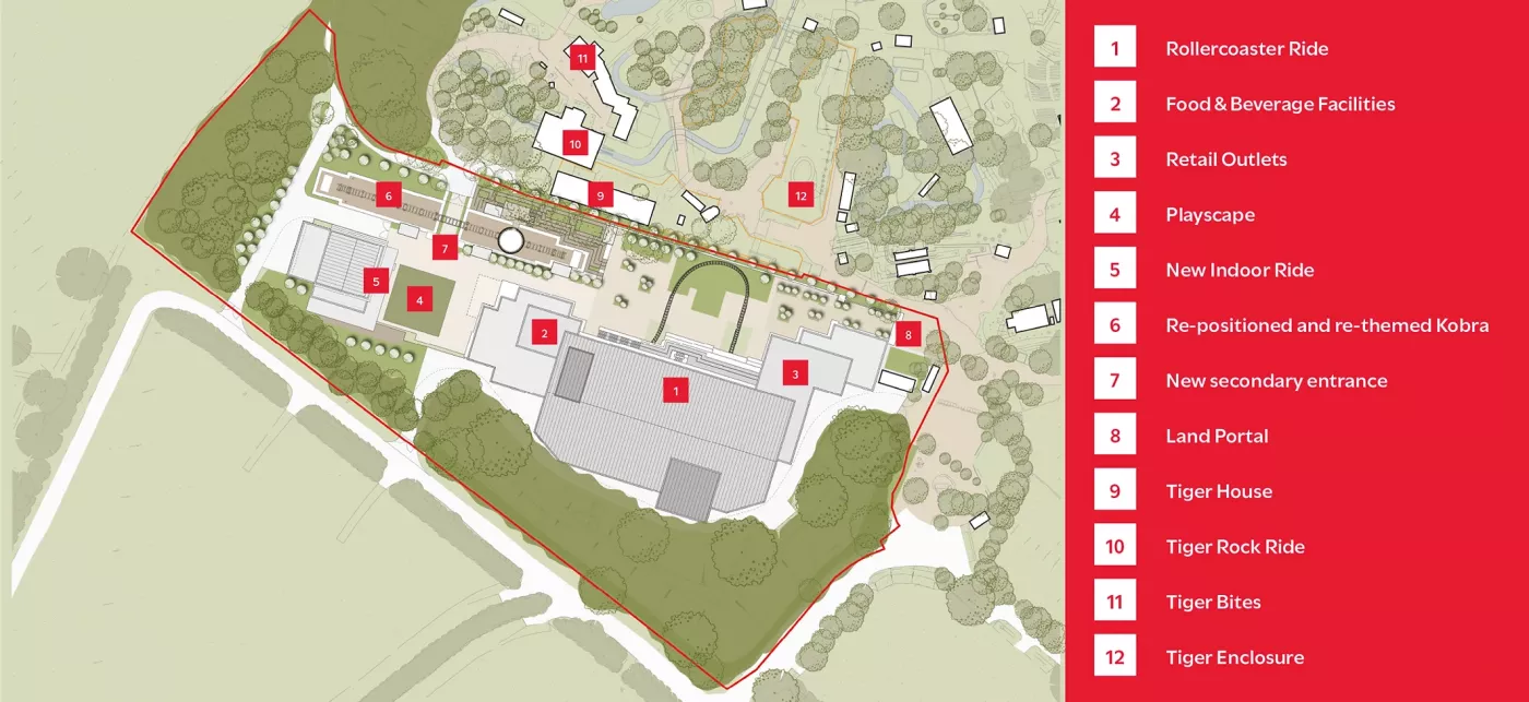 The new themed area replacing Wild Asia will keep the popular spinning ride Kobra, but whether other rides within the area will be relocated or removed is yet to be confirmed. The animals currently housed in Wild Asia will also be relocated to other areas within the park. The new themed area looks to have other new attractions including a new food and beverage unit. In this new area, there will be a new playscape area (a playground), new portal into the area, retail and food unit.