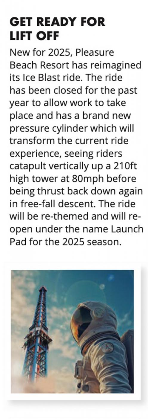 New for 2025, Pleasure Beach Resort has reimagined its Ice Blast ride. The ridehas been closed for the past year to allow work to take place and has a brand new pressure cylinder which will transform the current ride experience, seeing riders catapult vertically up a 210ft high tower at 80mph before being thrust back down again in free-fall descent. The ride will be re-themed and will re- open under the name Launch Pad for the 2025 season."