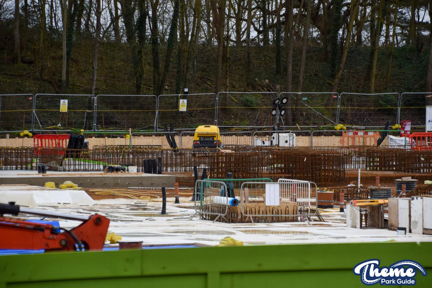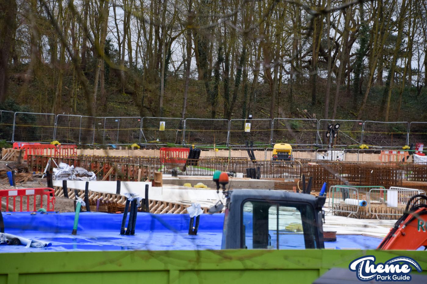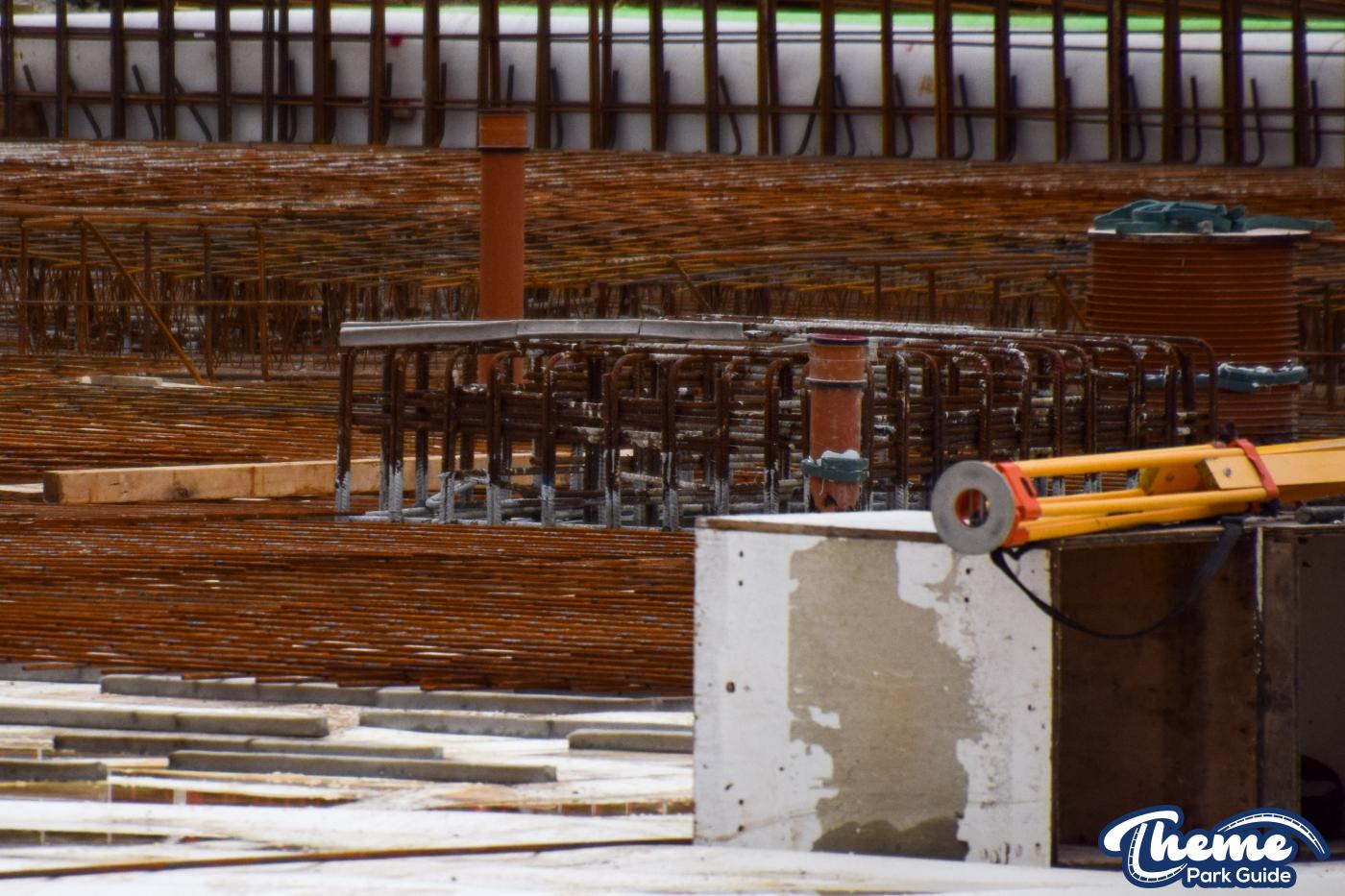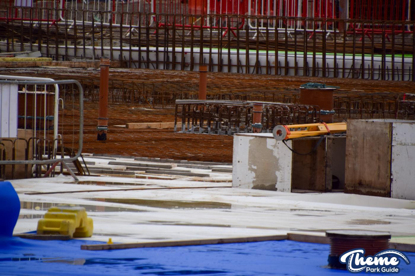 A huge concrete base is currently being poured, with clear forms visible for what are believed to be the coaster’s footings, ready for future track installation. Across the site, large quantities of metal rebar can be seen stacked and prepared, waiting to be installed to reinforce the upcoming foundations.