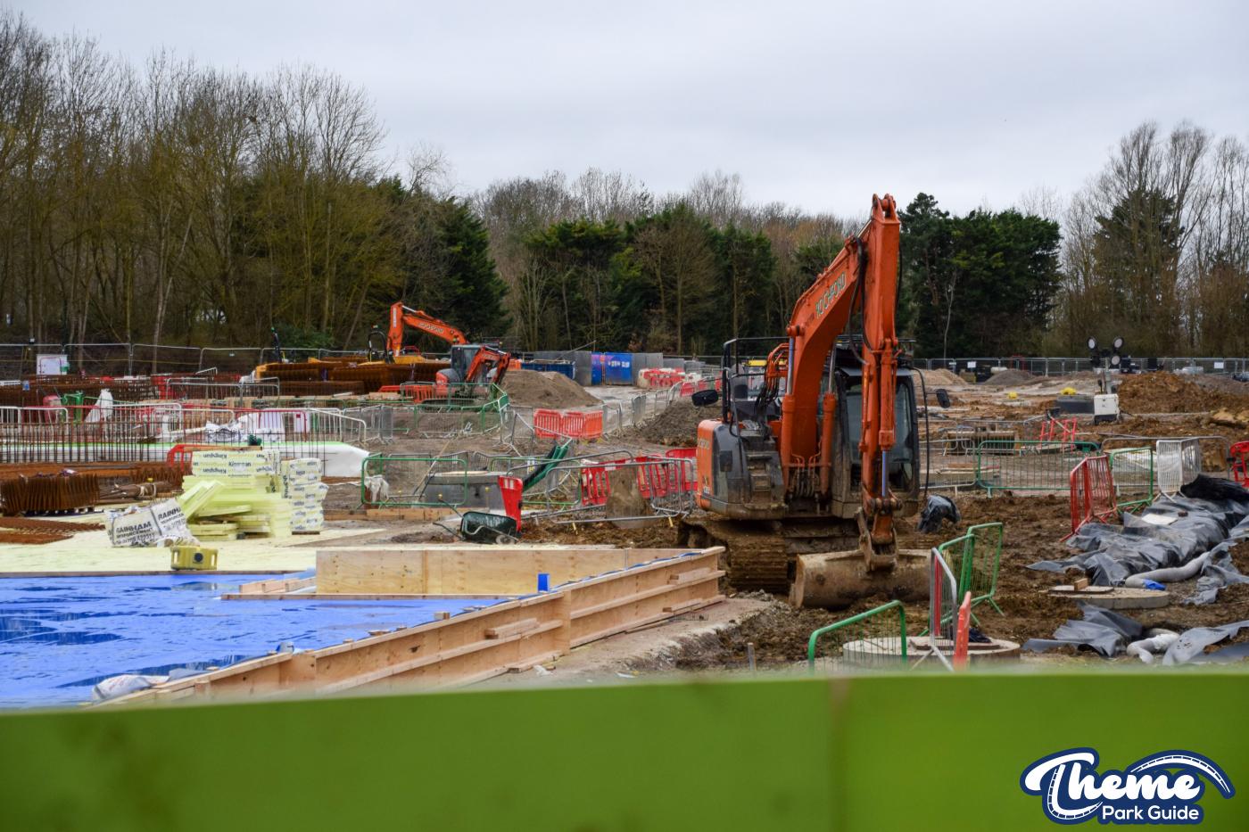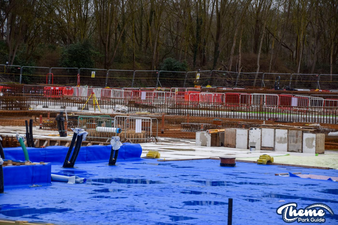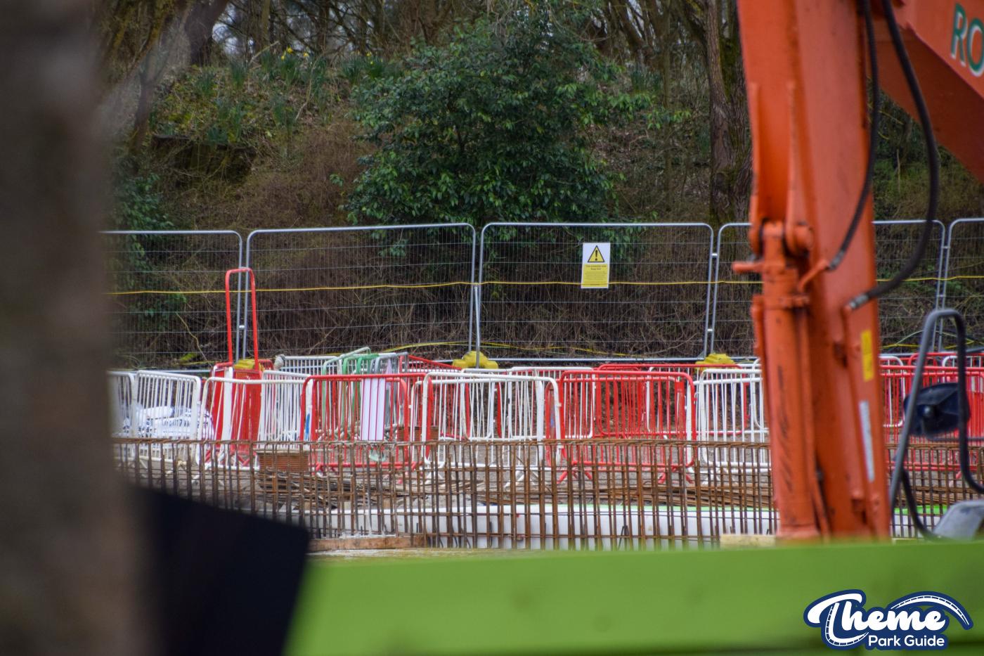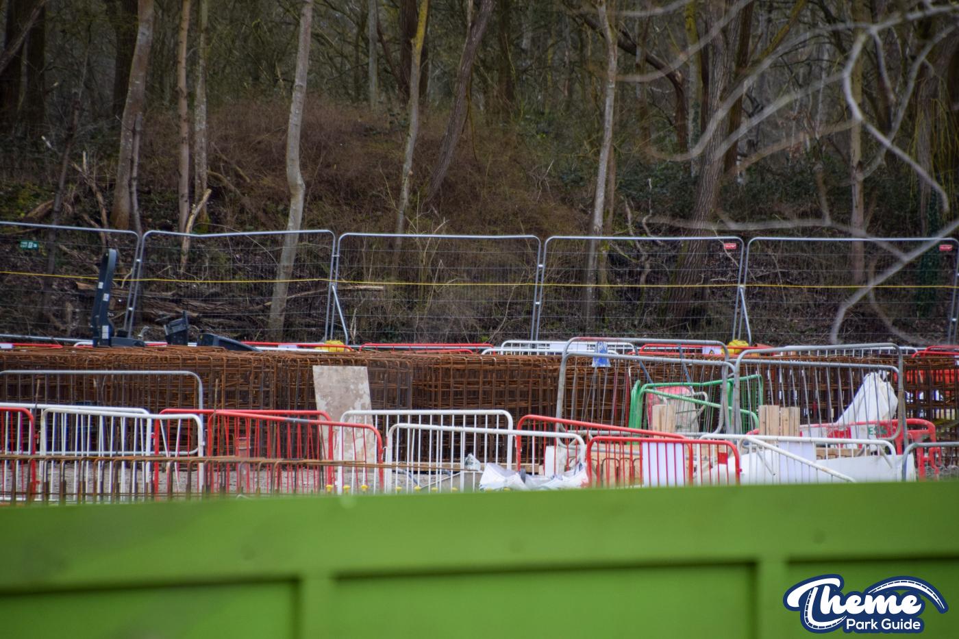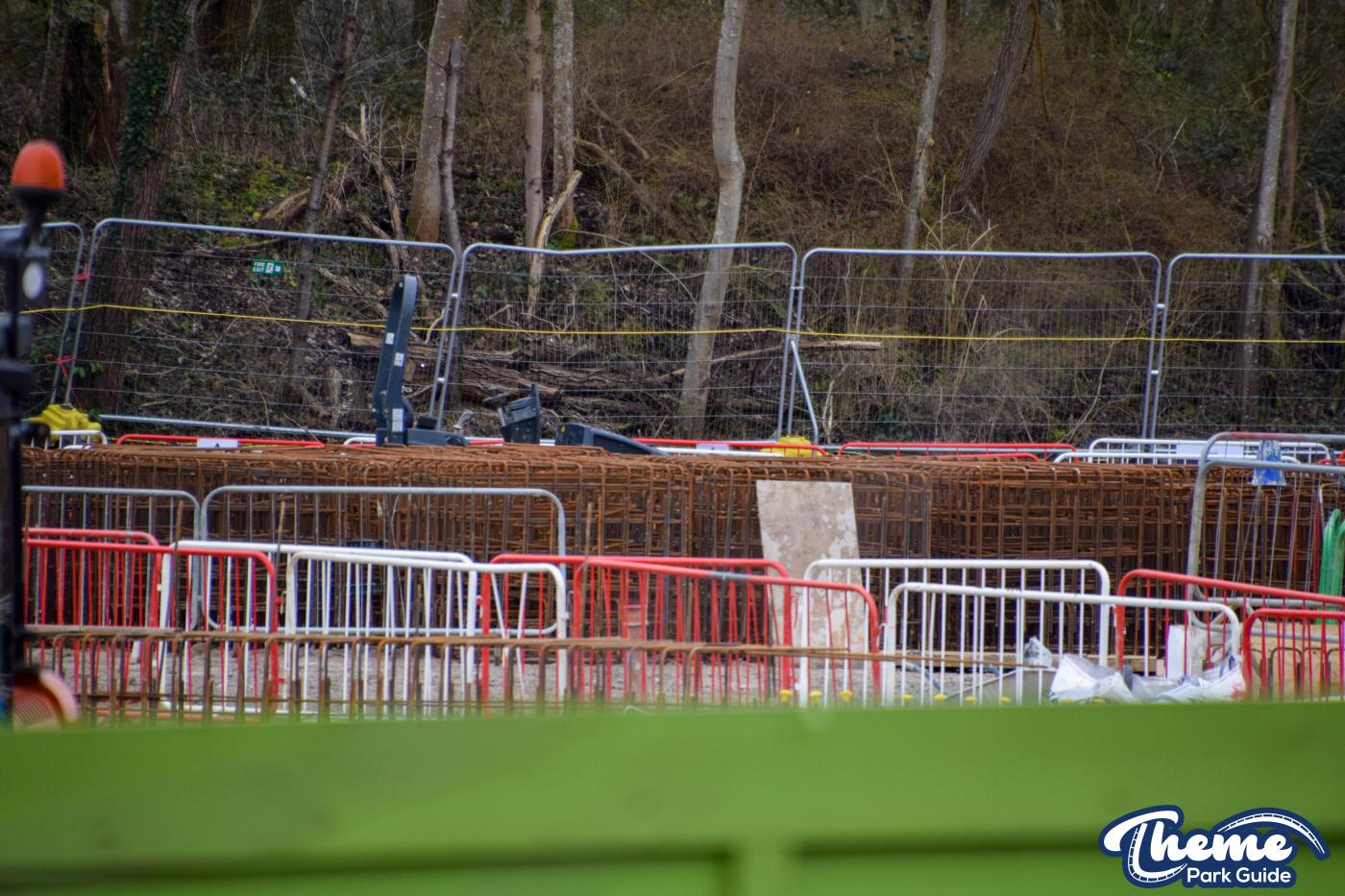 A huge concrete base is currently being poured, with clear forms visible for what are believed to be the coaster’s footings, ready for future track installation. Across the site, large quantities of metal rebar can be seen stacked and prepared, waiting to be installed to reinforce the upcoming foundations.