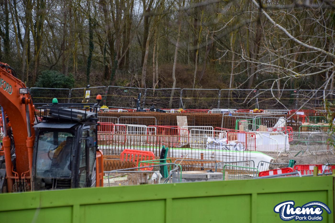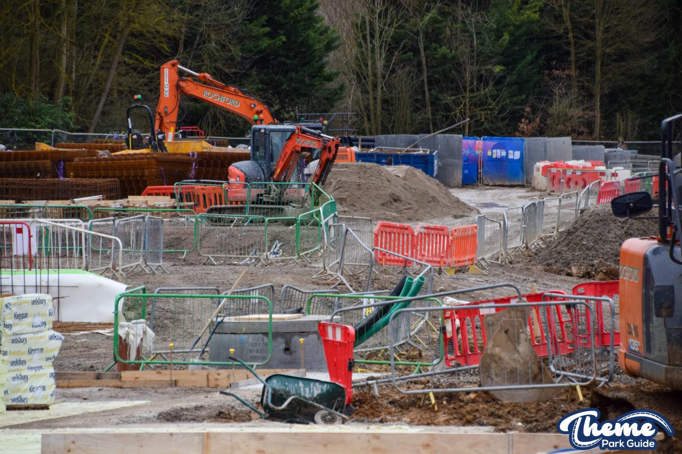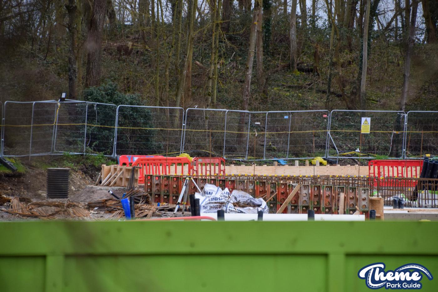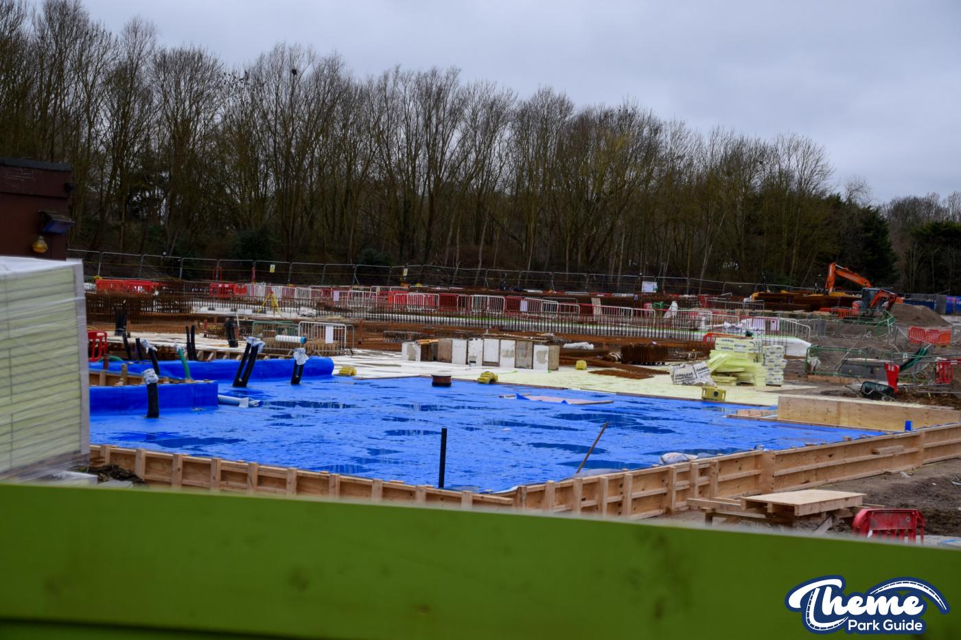 A huge concrete base is currently being poured, with clear forms visible for what are believed to be the coaster’s footings, ready for future track installation. Across the site, large quantities of metal rebar can be seen stacked and prepared, waiting to be installed to reinforce the upcoming foundations.