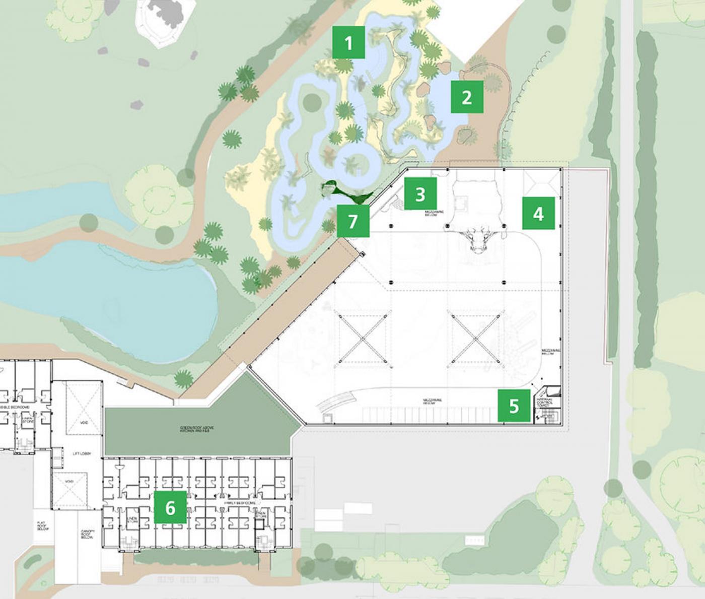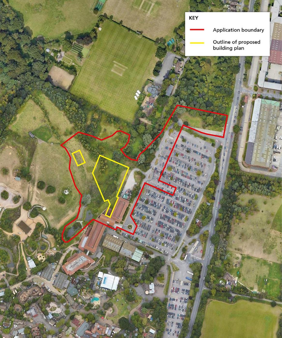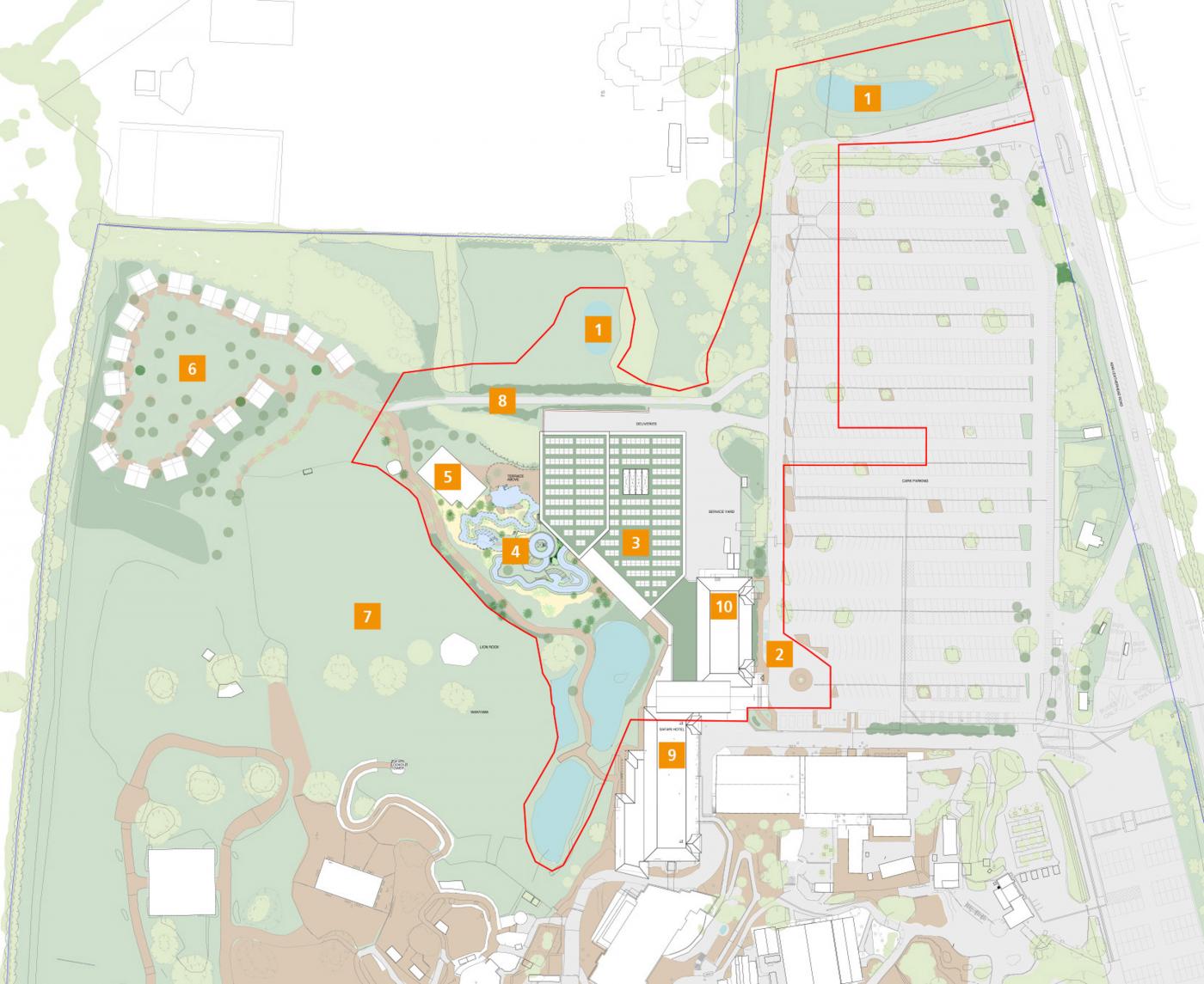 "The application site comprises part of the ‘22 Acre Field’ and Safari Hotel located within the north west part of the Resort. To the immediate south of the site are the other parts of the Safari and Azteca Hotel, to the east is the north car park and to the west is the Wanyama Reserve and Safari Lodges accommodation site. Further north west of the Safari Hotel is predominantly landscaping. The site is well screened by trees along the boundary to the west and north."