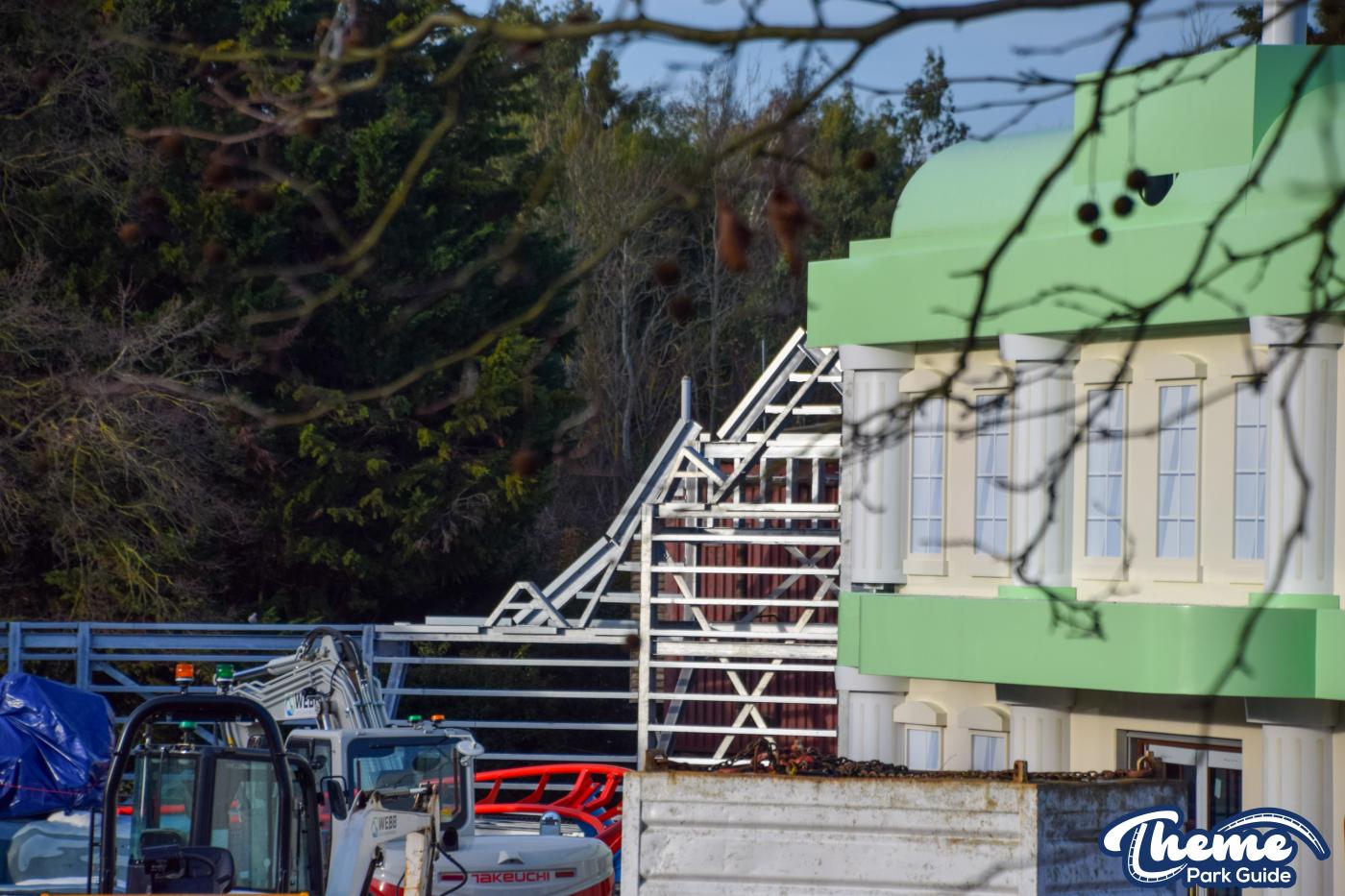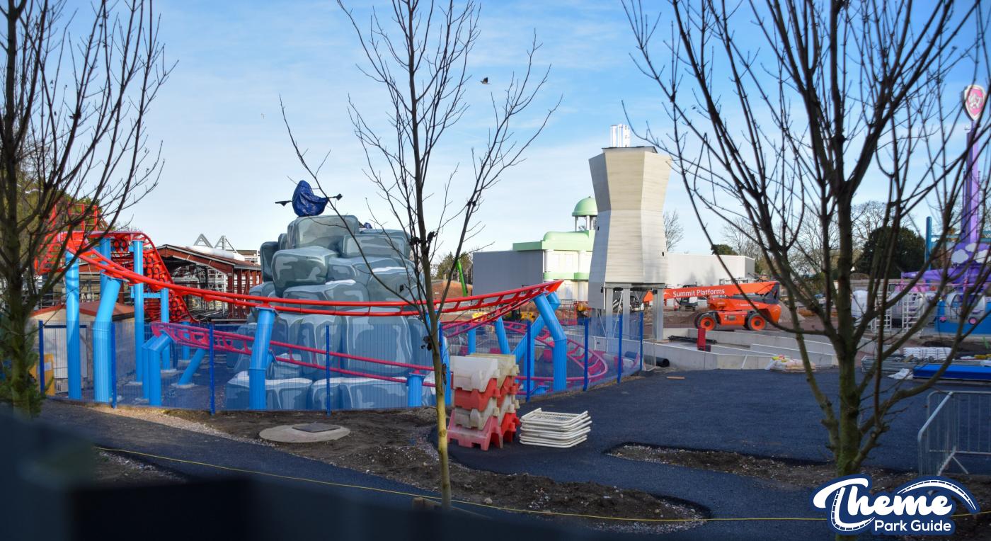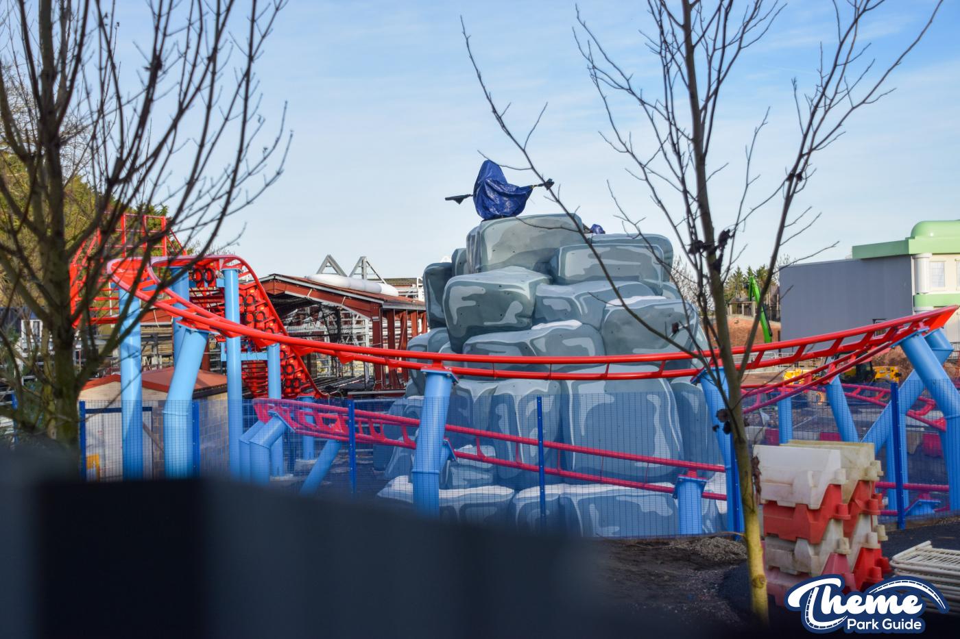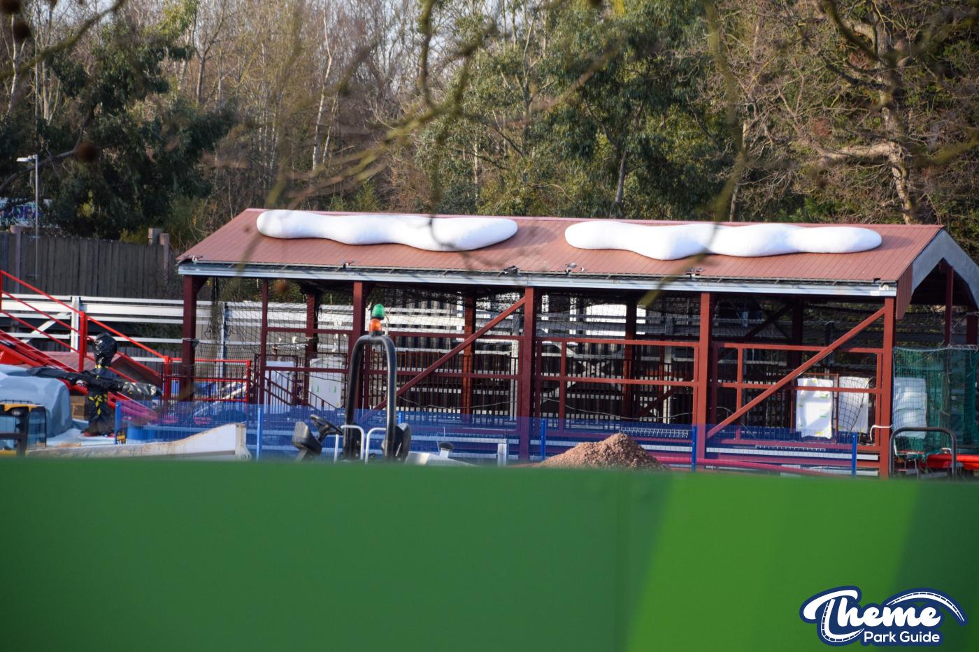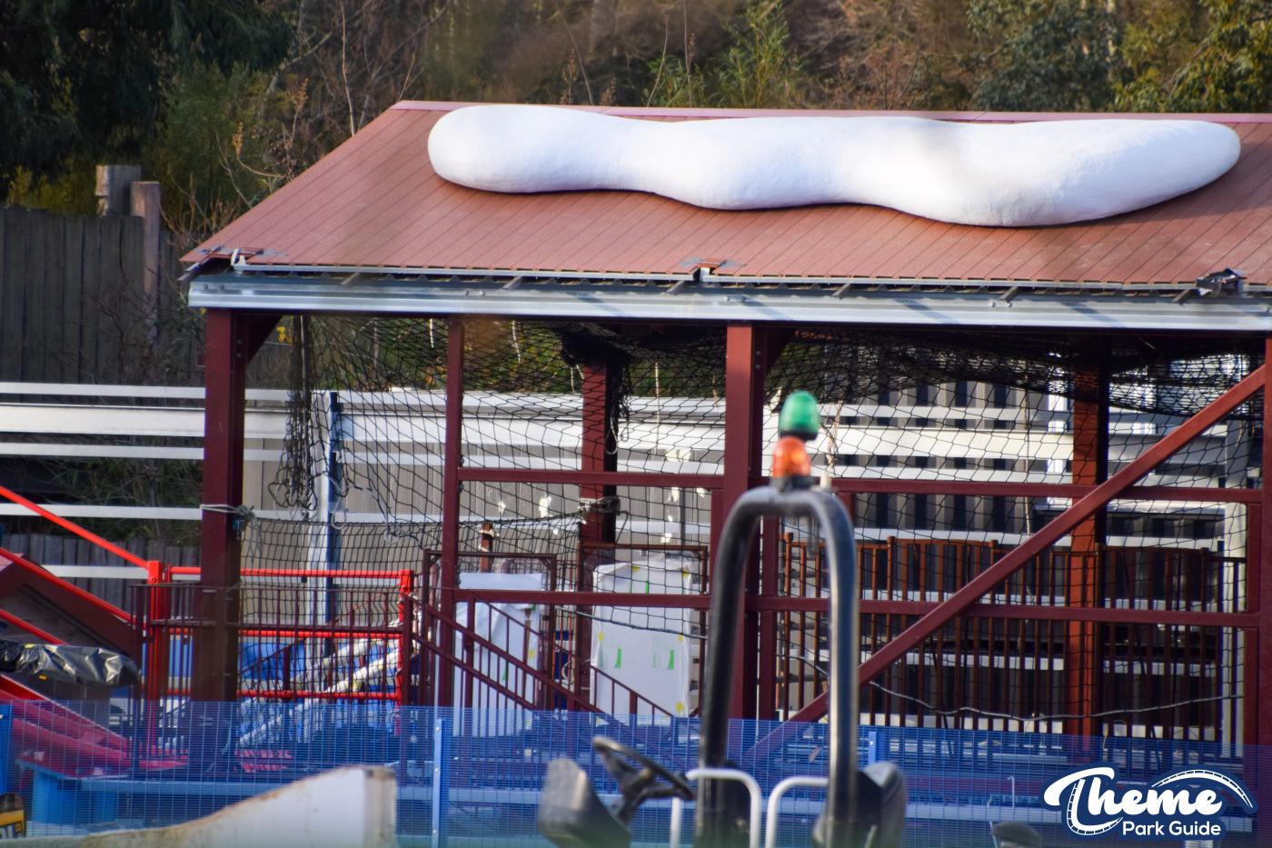 The area is starting to look amazing now. With theming elements being installed across the area such as the blue bridge, characters on the mountains, and a roof has now been installed on the rollercoaster station with fake snow on top of it.
