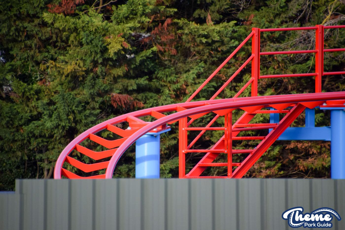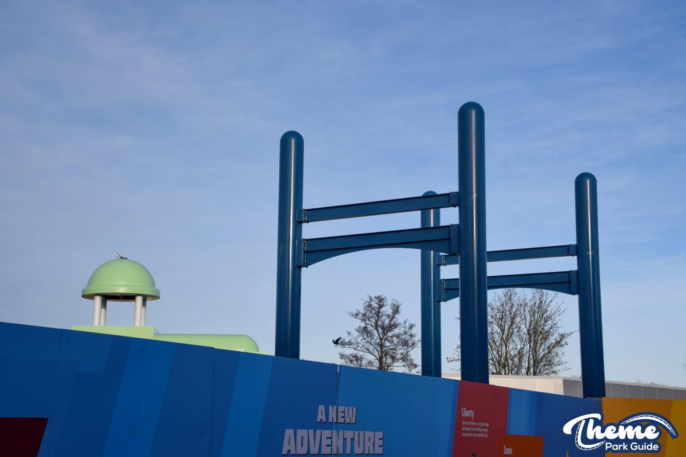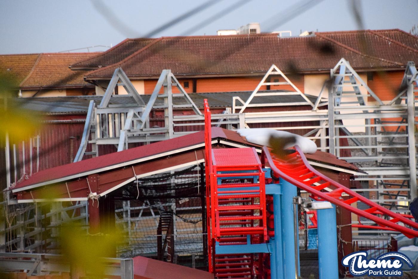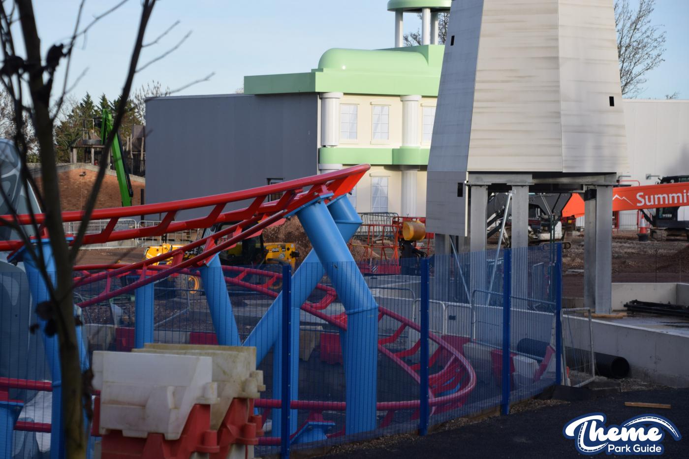 The area is starting to look amazing now. With theming elements being installed across the area such as the blue bridge, characters on the mountains, and a roof has now been installed on the rollercoaster station with fake snow on top of it.