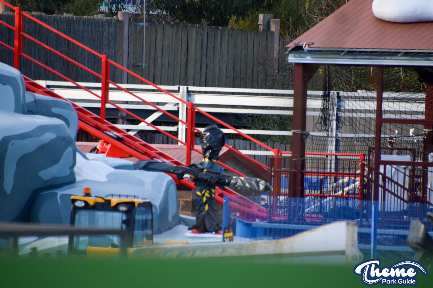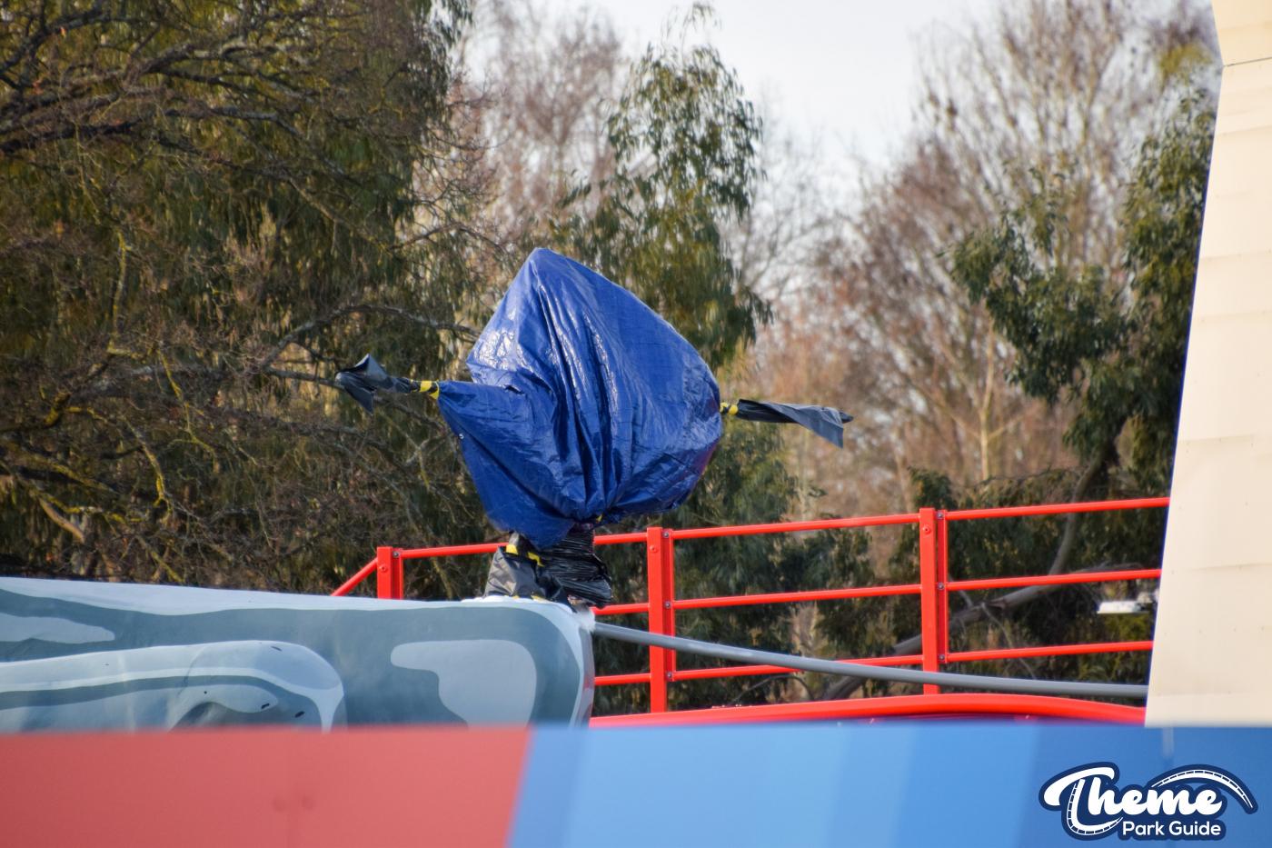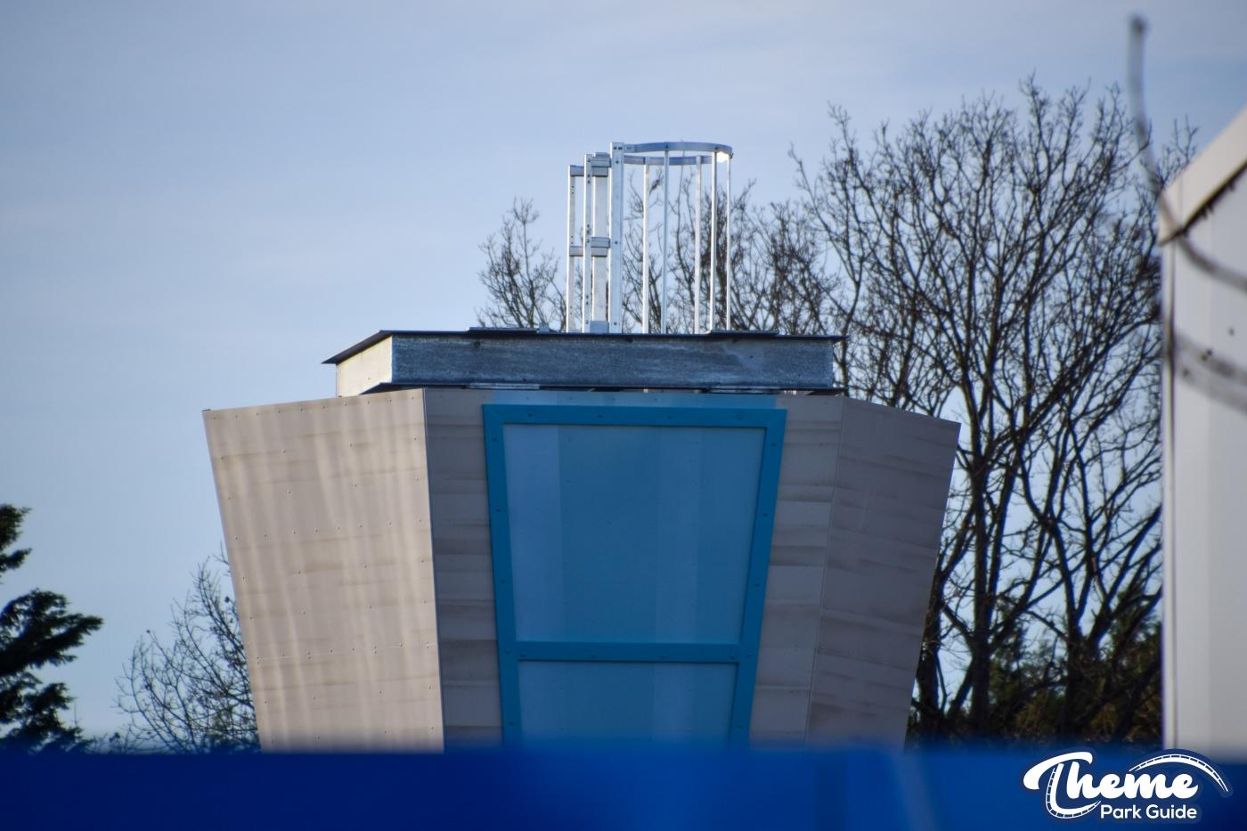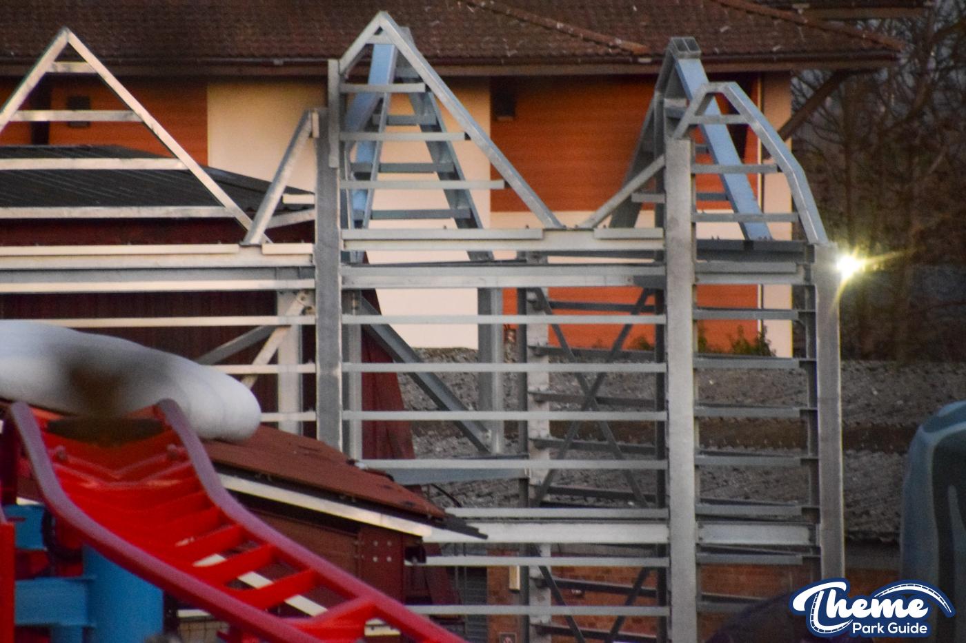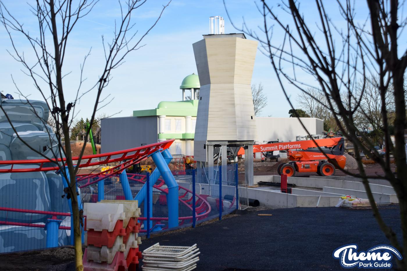 The area is starting to look amazing now. With theming elements being installed across the area such as the blue bridge, characters on the mountains, and a roof has now been installed on the rollercoaster station with fake snow on top of it.