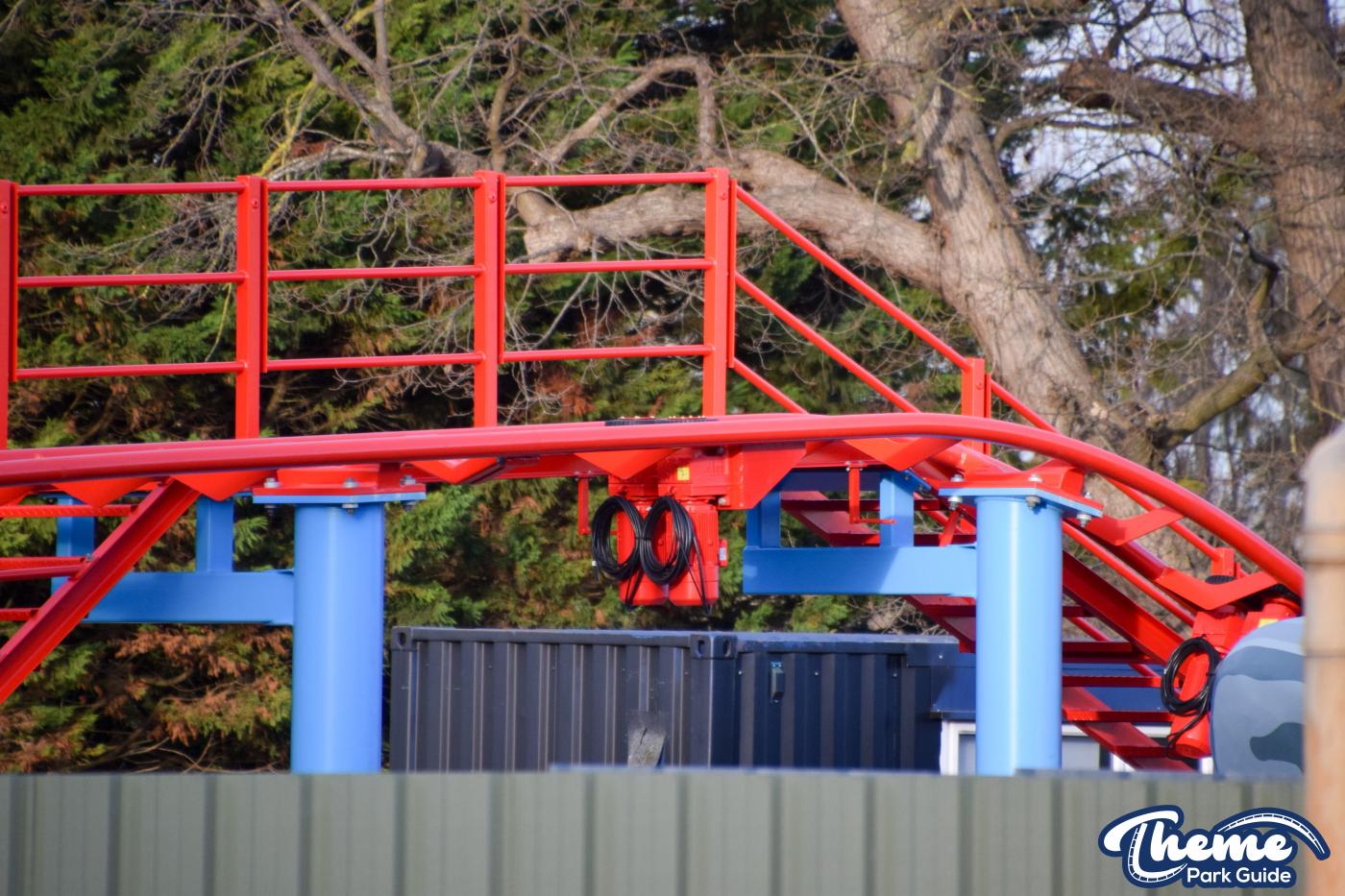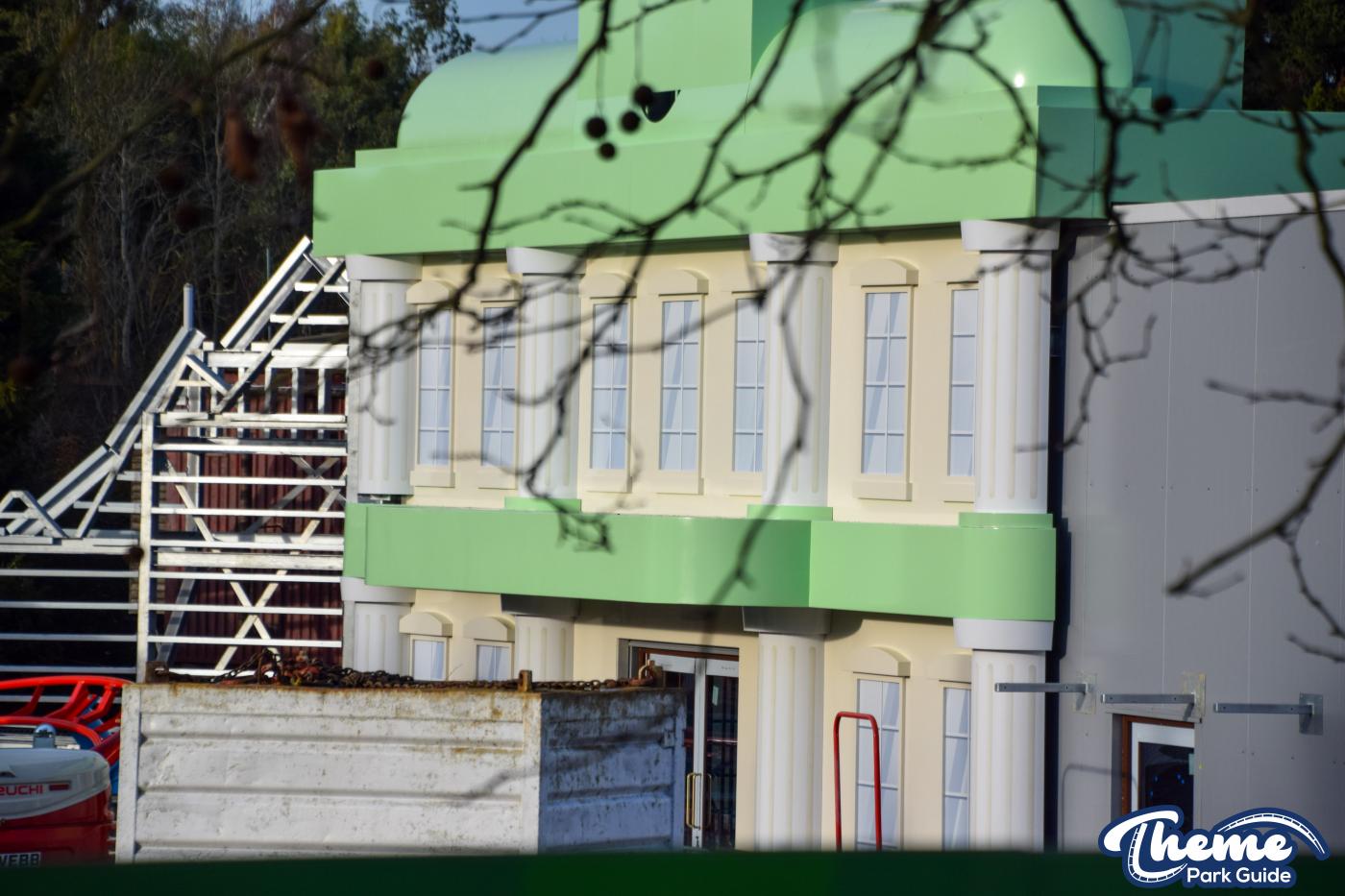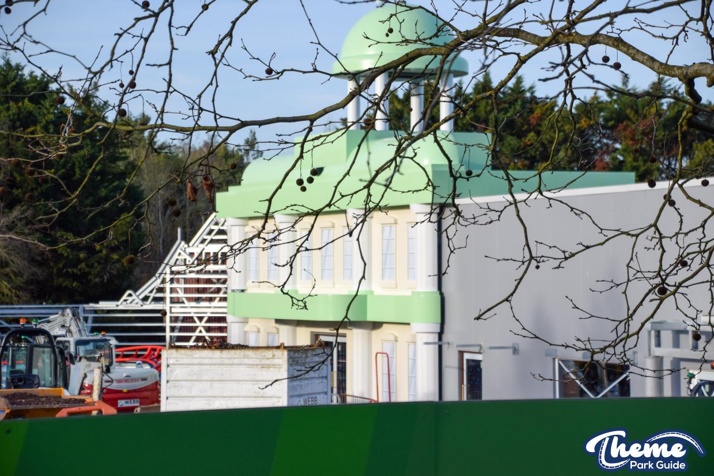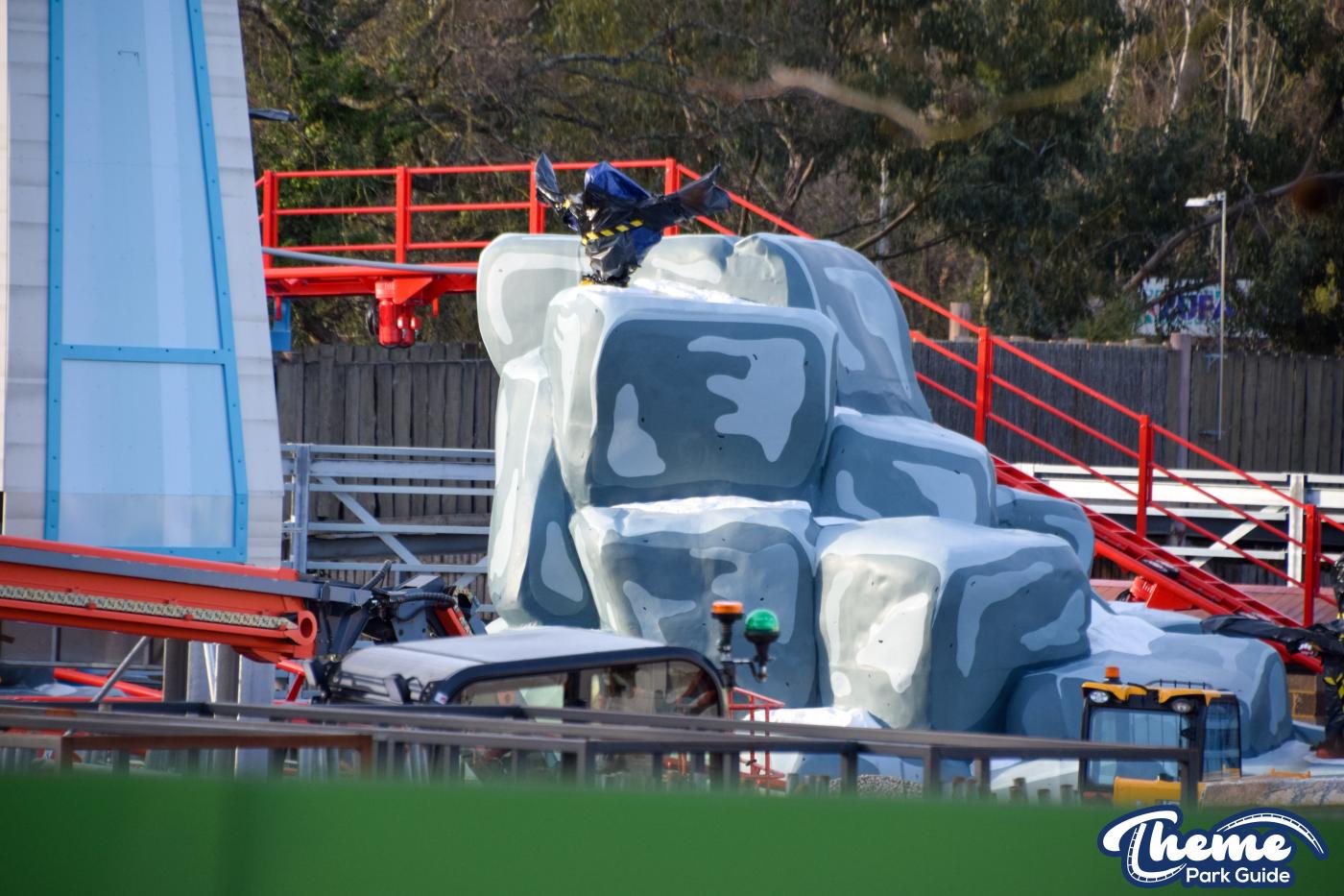 The area is starting to look amazing now. With theming elements being installed across the area such as the blue bridge, characters on the mountains, and a roof has now been installed on the rollercoaster station with fake snow on top of it.