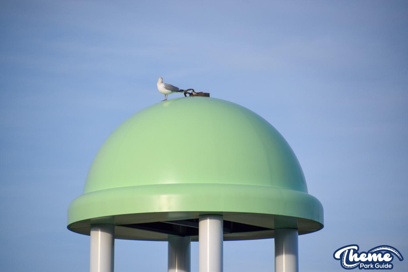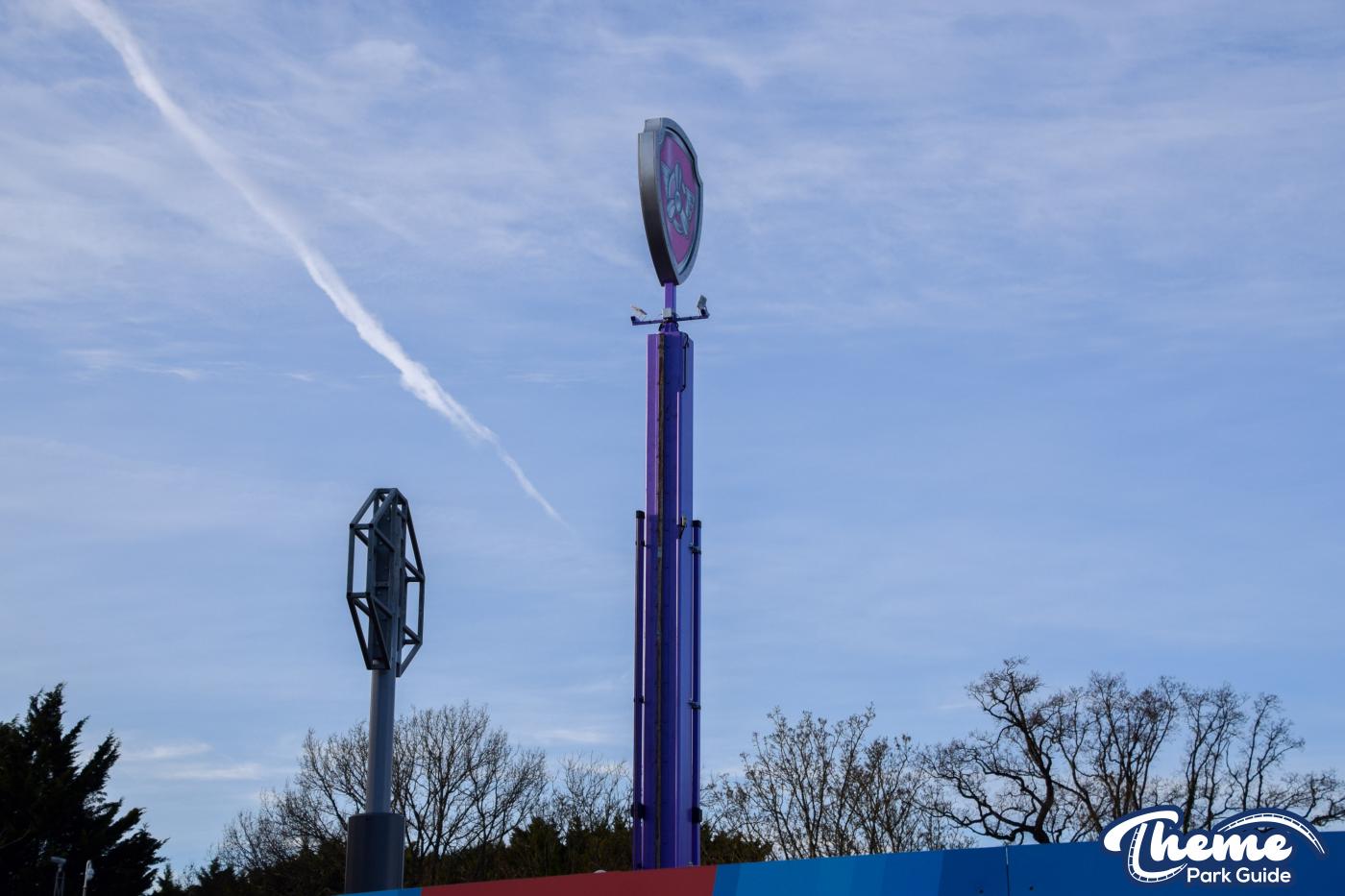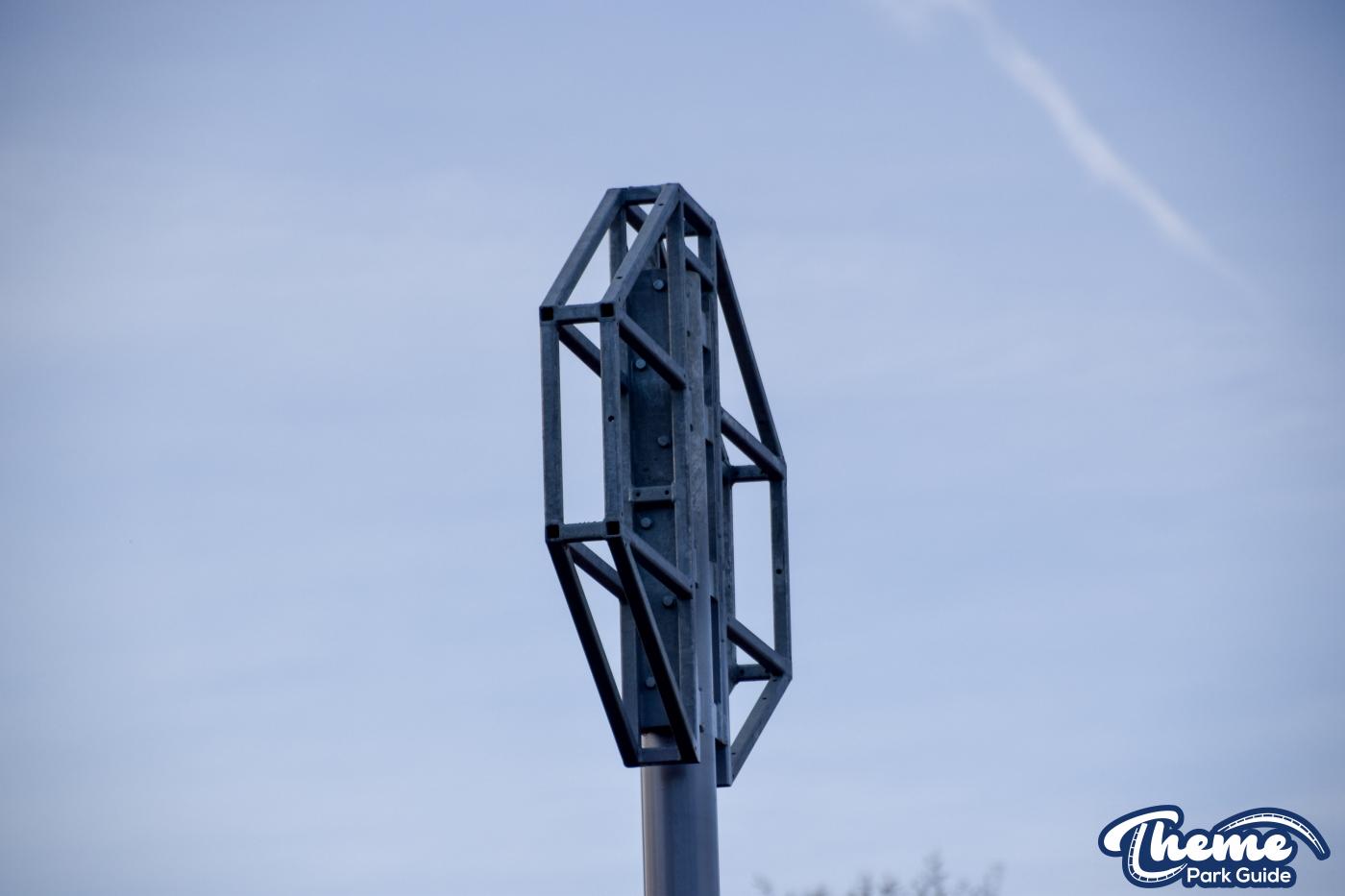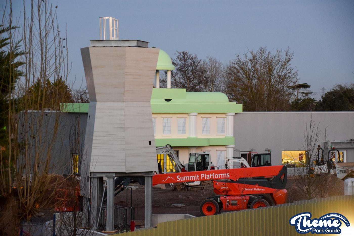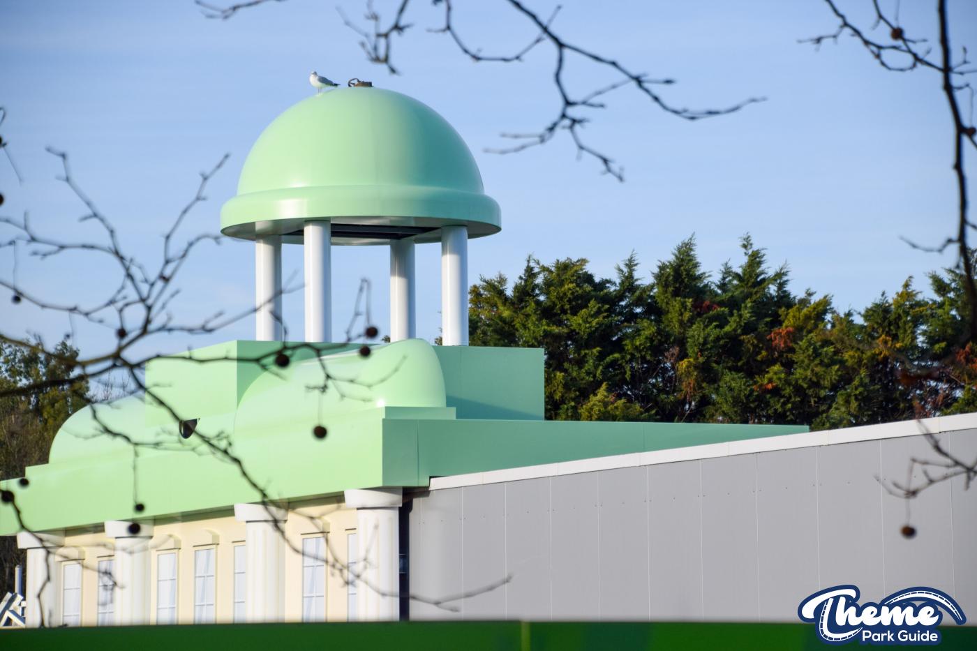 The area is starting to look amazing now. With theming elements being installed across the area such as the blue bridge, characters on the mountains, and a roof has now been installed on the rollercoaster station with fake snow on top of it.