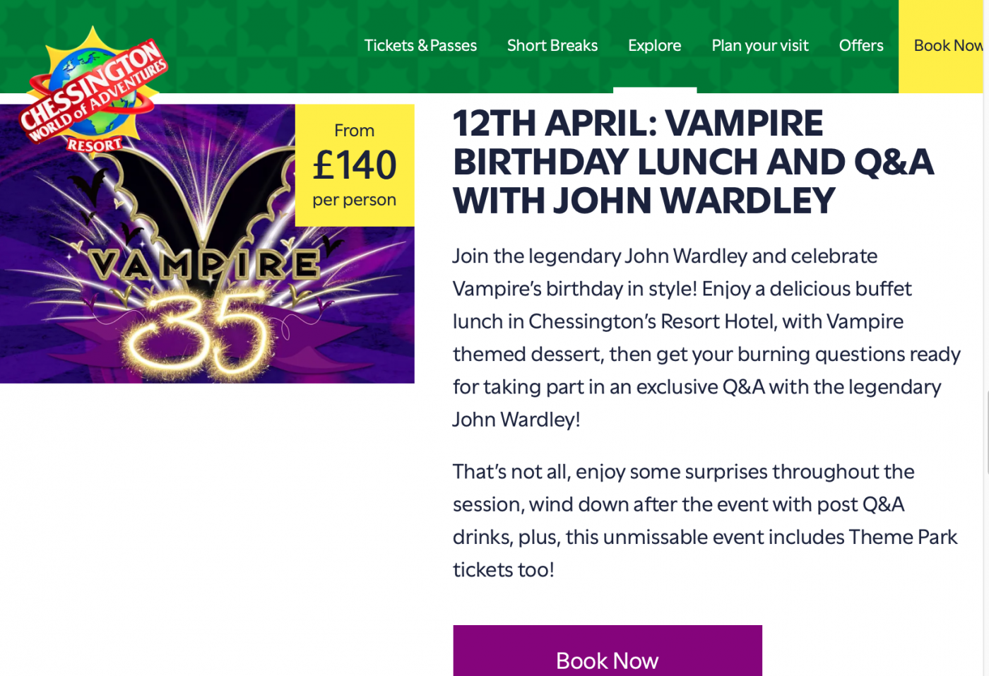 Celebrate Vampire's 35th birthday with a special buffet lunch at Chessington’s Resort Hotel. Indulge in a Vampire-themed dessert and then join a Q&A session with the legendary John Wardley himself! Get insights into the design and history of Vampire, along with some surprises throughout the session. The event includes Theme Park tickets, plus you can unwind with post-Q&A drinks. This is the perfect opportunity to hear from the legend behind the coaster!