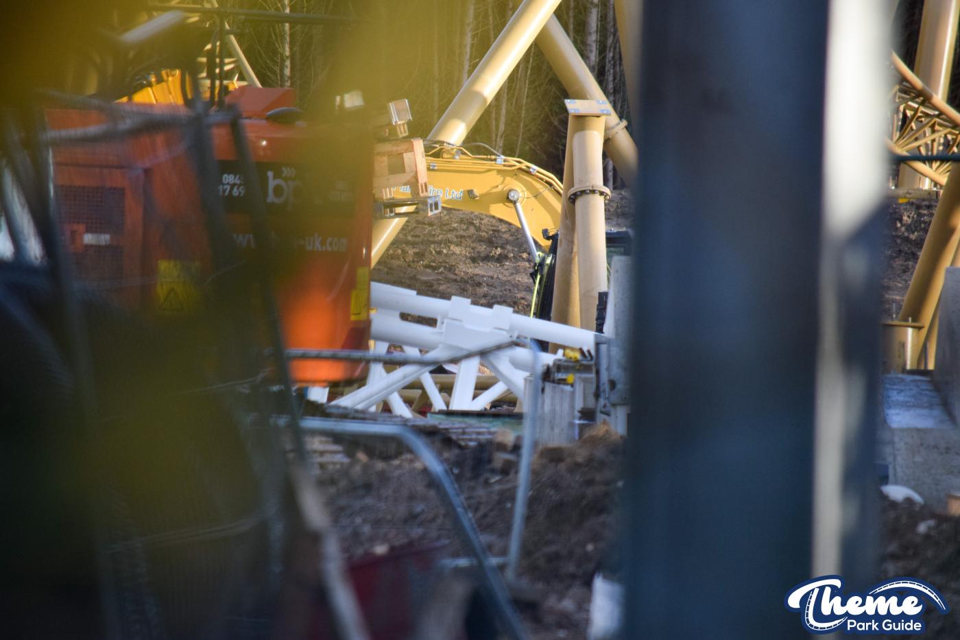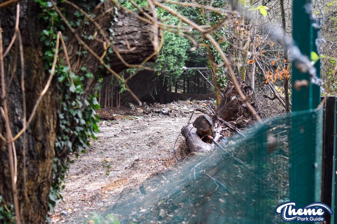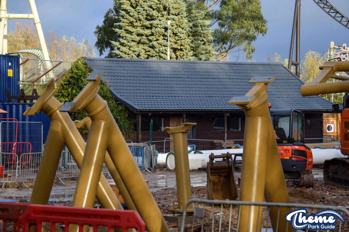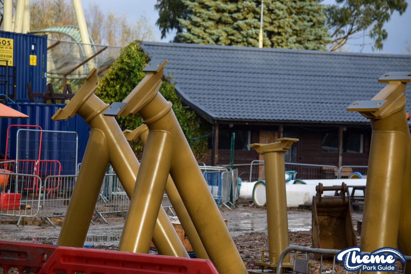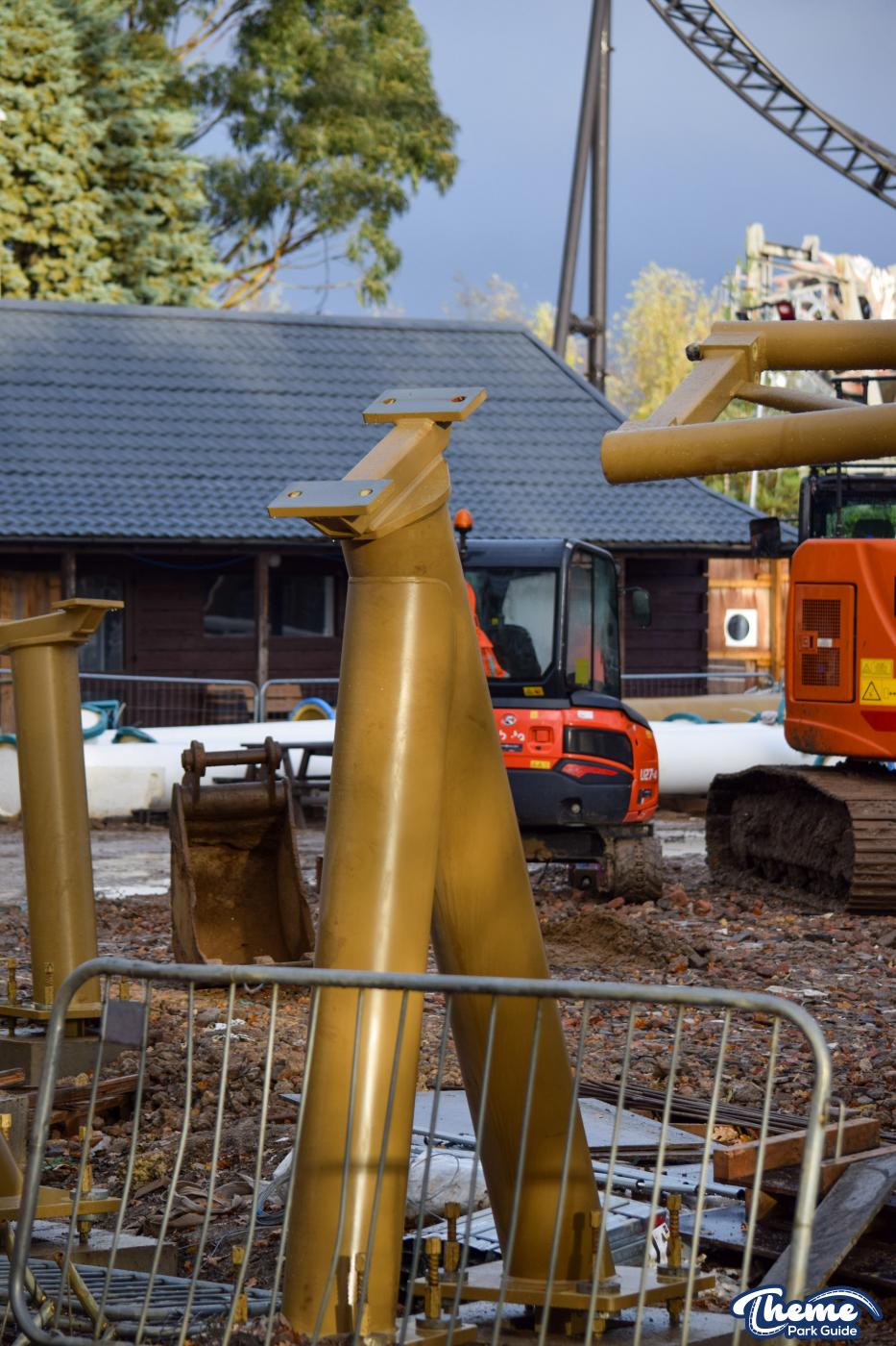 Walking down monks walk back to our car we also spotted lots of supports and track on the island behind The Swarm. With all the leaves falling, visibility into the storage area is slowly opening up. There are lots of sections of track and supports left to be installed over the next few months. Scaffolding around the maintenance shed has also been removed since our last look at the site last weekend.