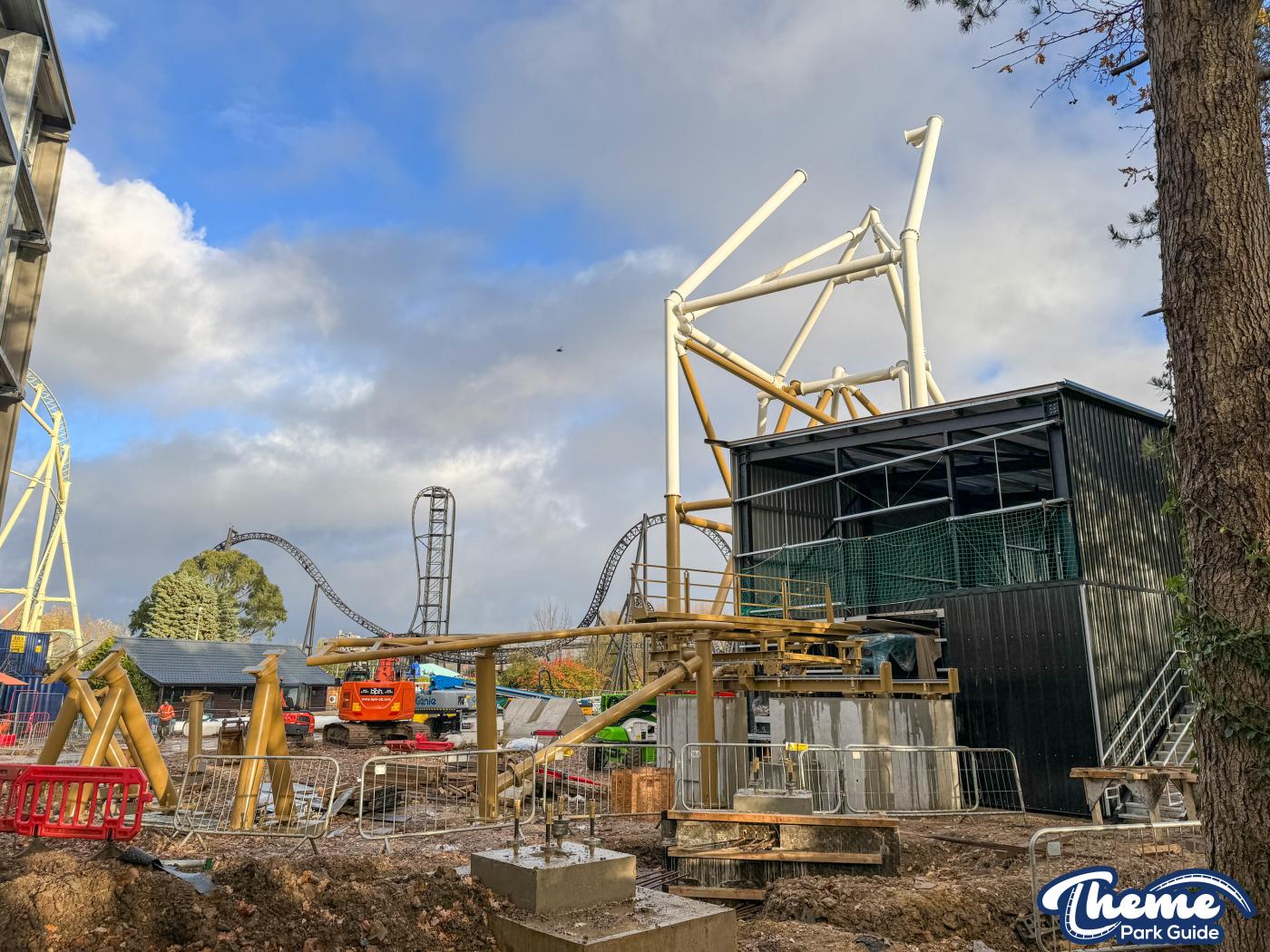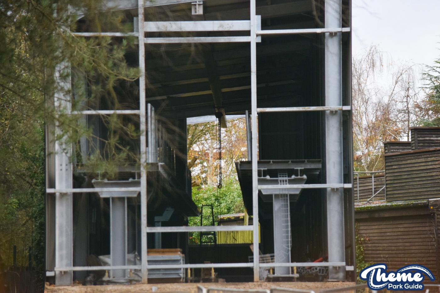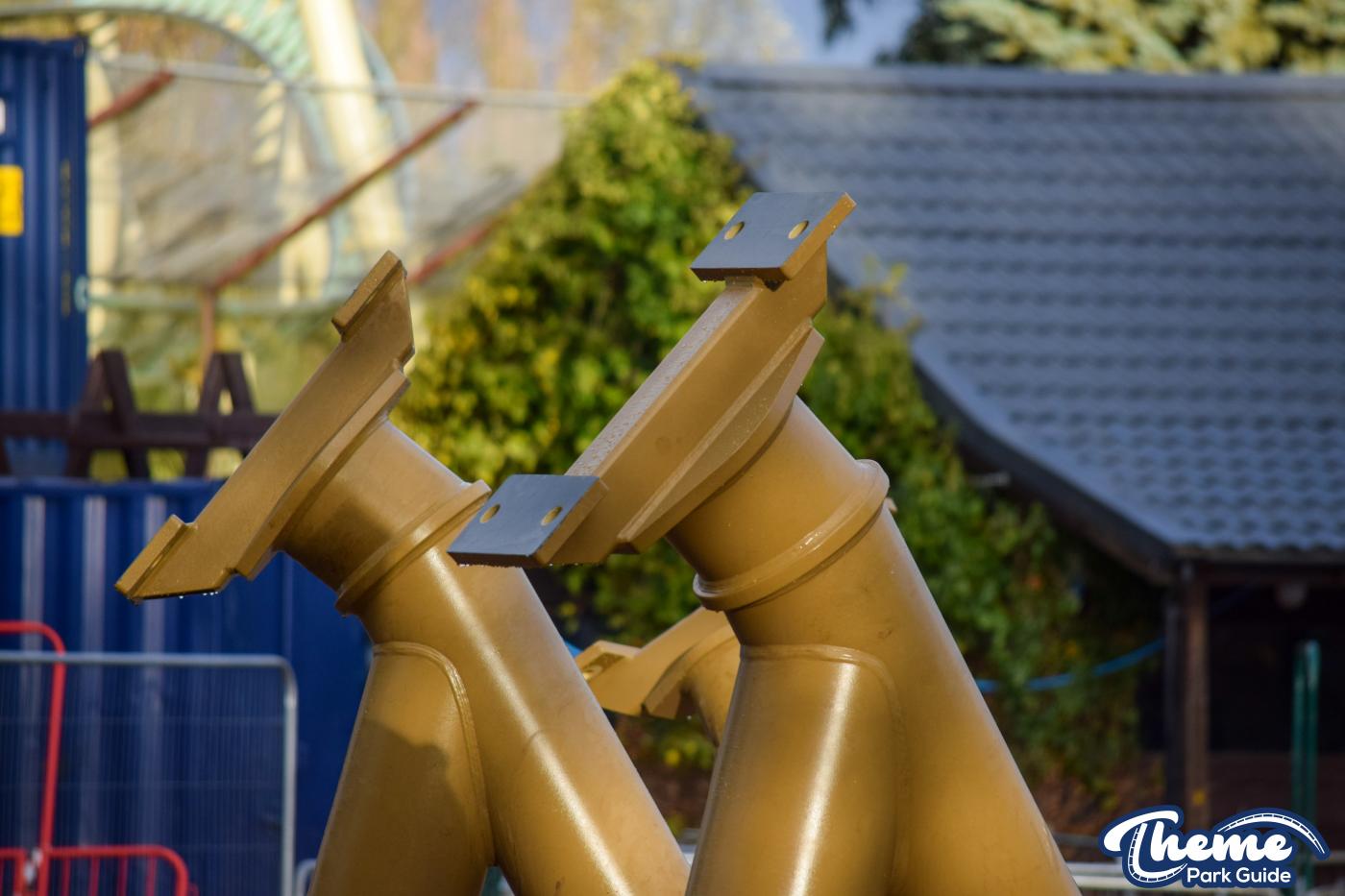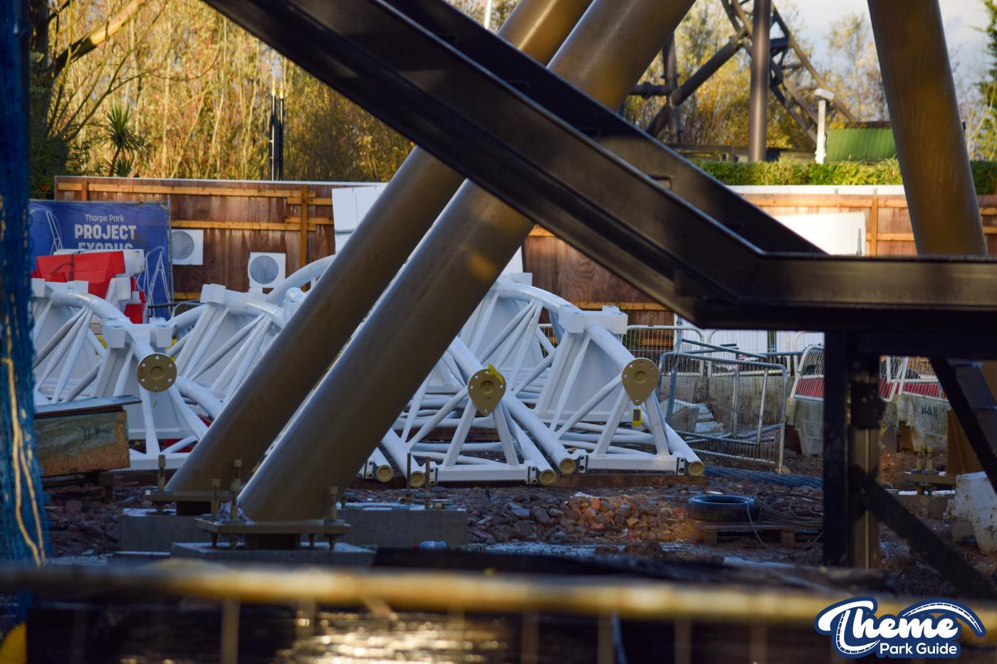 Walking down monks walk back to our car we also spotted lots of supports and track on the island behind The Swarm. With all the leaves falling, visibility into the storage area is slowly opening up. There are lots of sections of track and supports left to be installed over the next few months. Scaffolding around the maintenance shed has also been removed since our last look at the site last weekend.