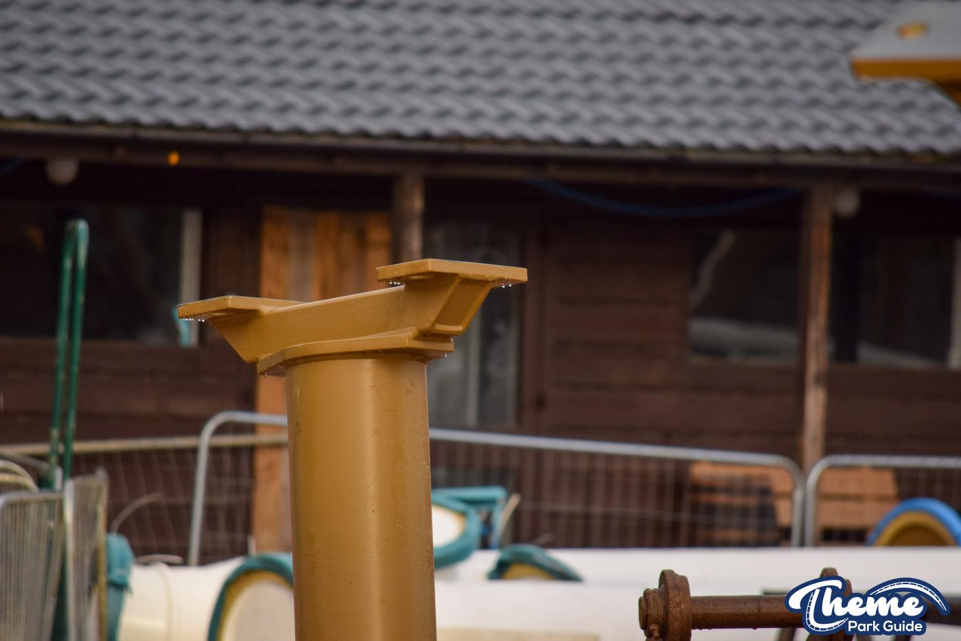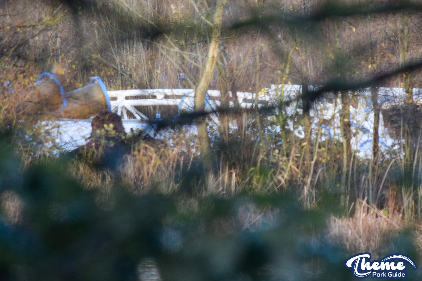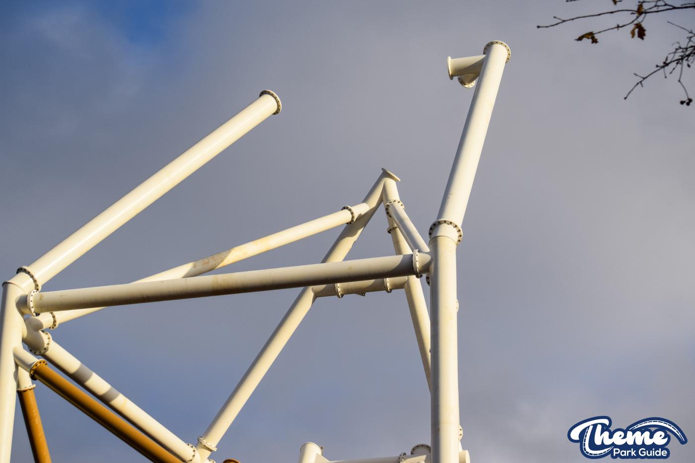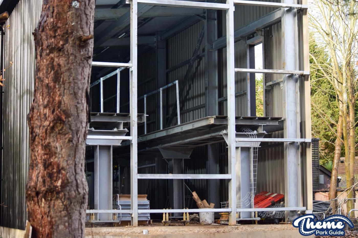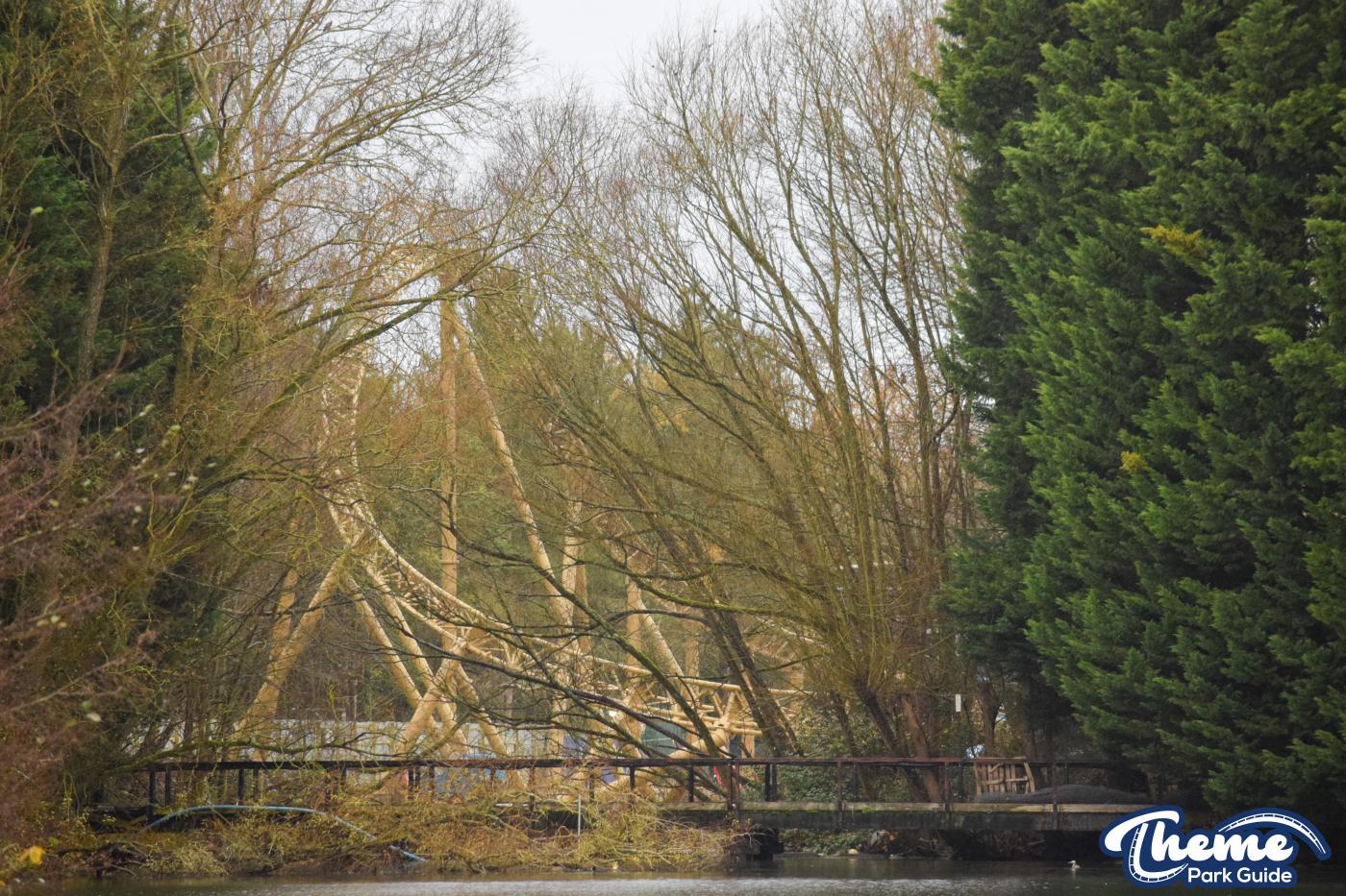 Walking down monks walk back to our car we also spotted lots of supports and track on the island behind The Swarm. With all the leaves falling, visibility into the storage area is slowly opening up. There are lots of sections of track and supports left to be installed over the next few months. Scaffolding around the maintenance shed has also been removed since our last look at the site last weekend.