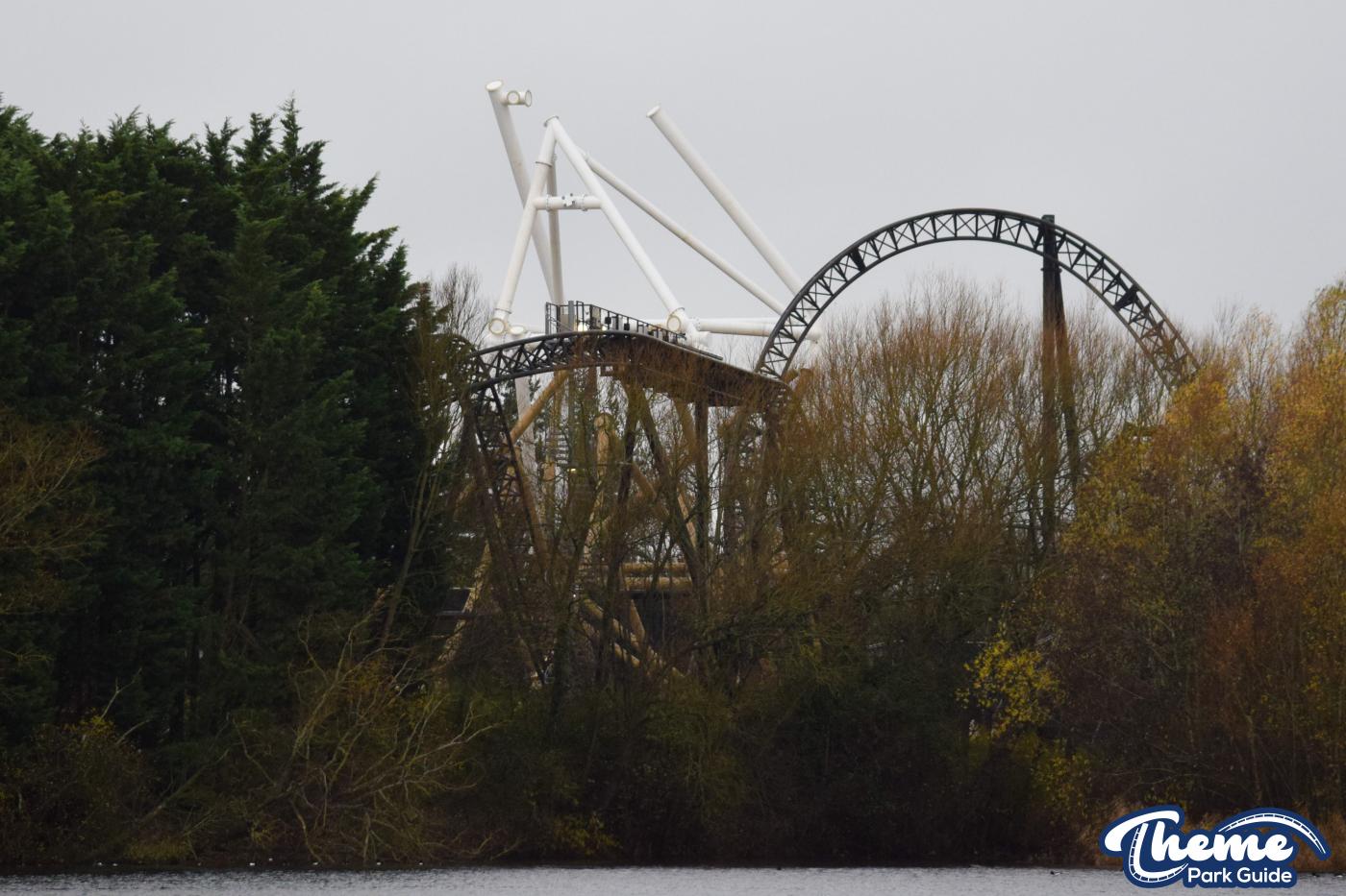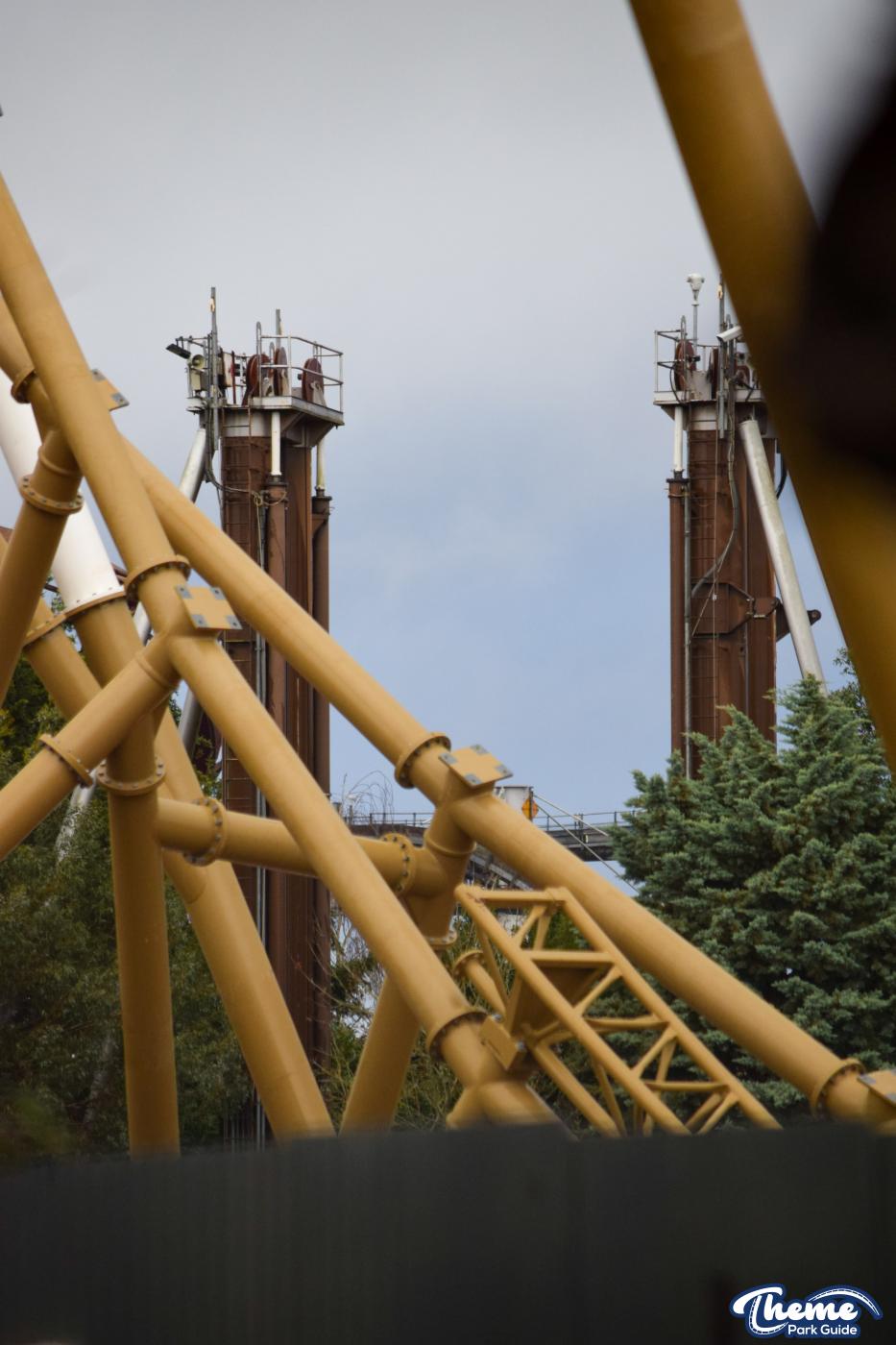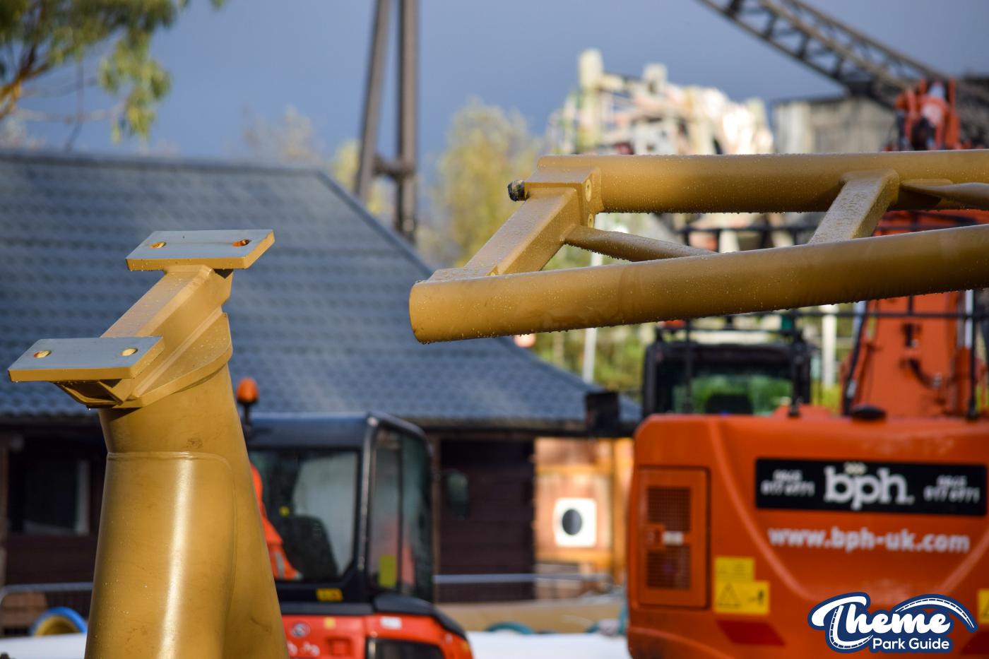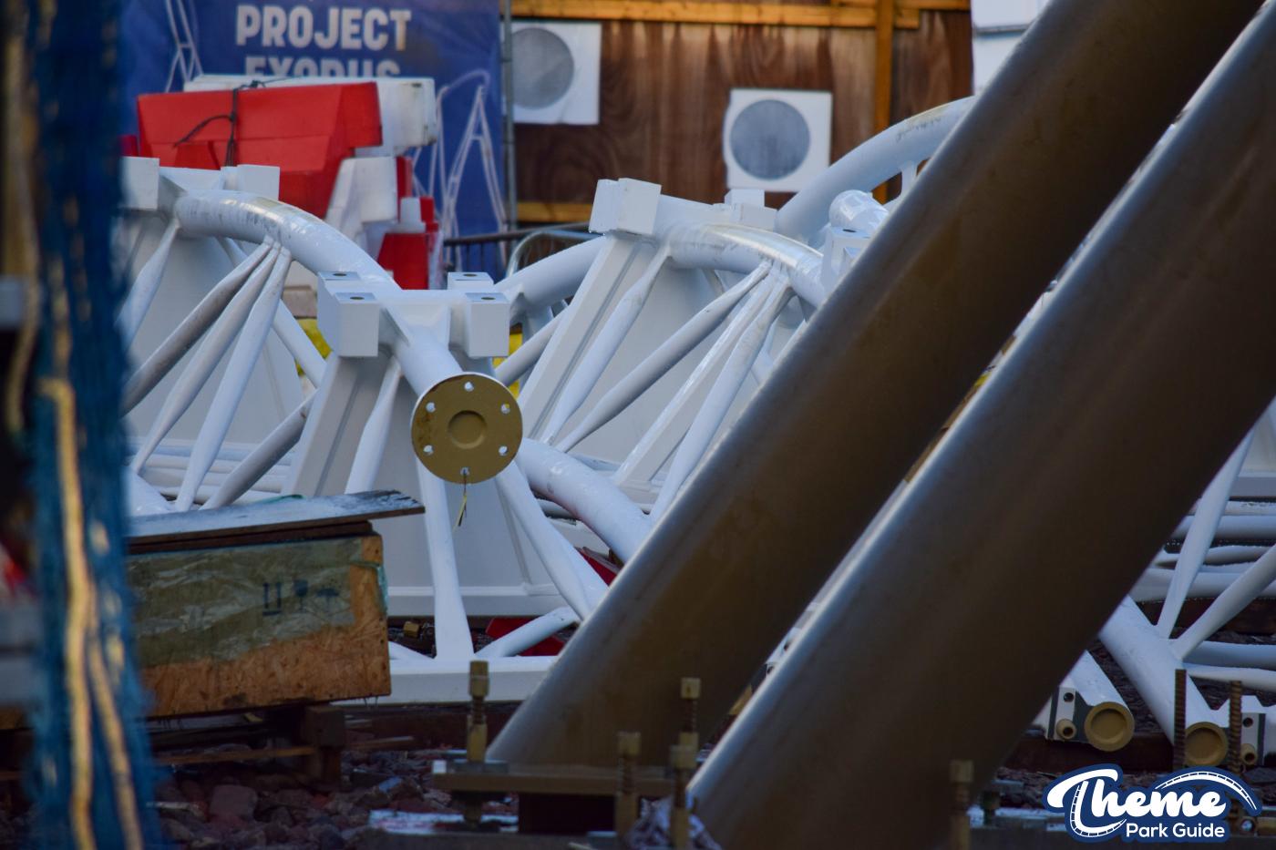 Walking down monks walk back to our car we also spotted lots of supports and track on the island behind The Swarm. With all the leaves falling, visibility into the storage area is slowly opening up. There are lots of sections of track and supports left to be installed over the next few months. Scaffolding around the maintenance shed has also been removed since our last look at the site last weekend.