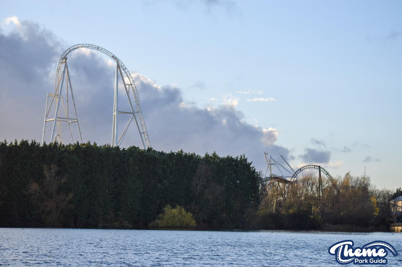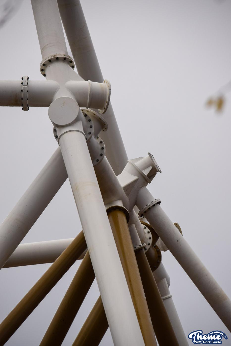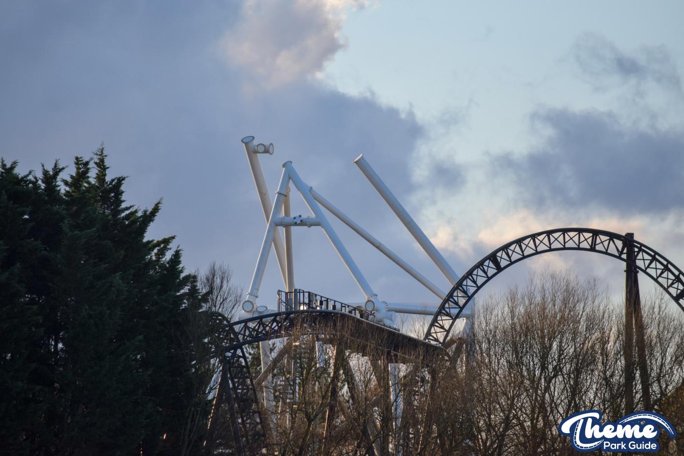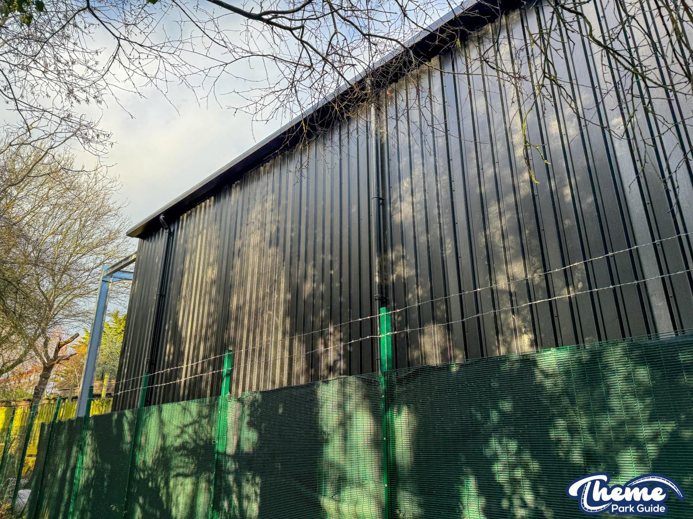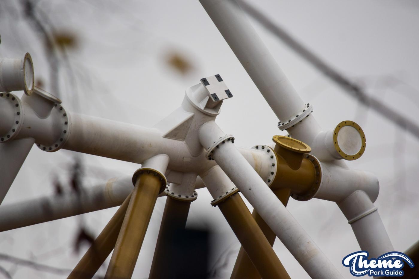 Walking down monks walk back to our car we also spotted lots of supports and track on the island behind The Swarm. With all the leaves falling, visibility into the storage area is slowly opening up. There are lots of sections of track and supports left to be installed over the next few months. Scaffolding around the maintenance shed has also been removed since our last look at the site last weekend.