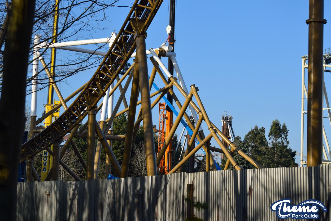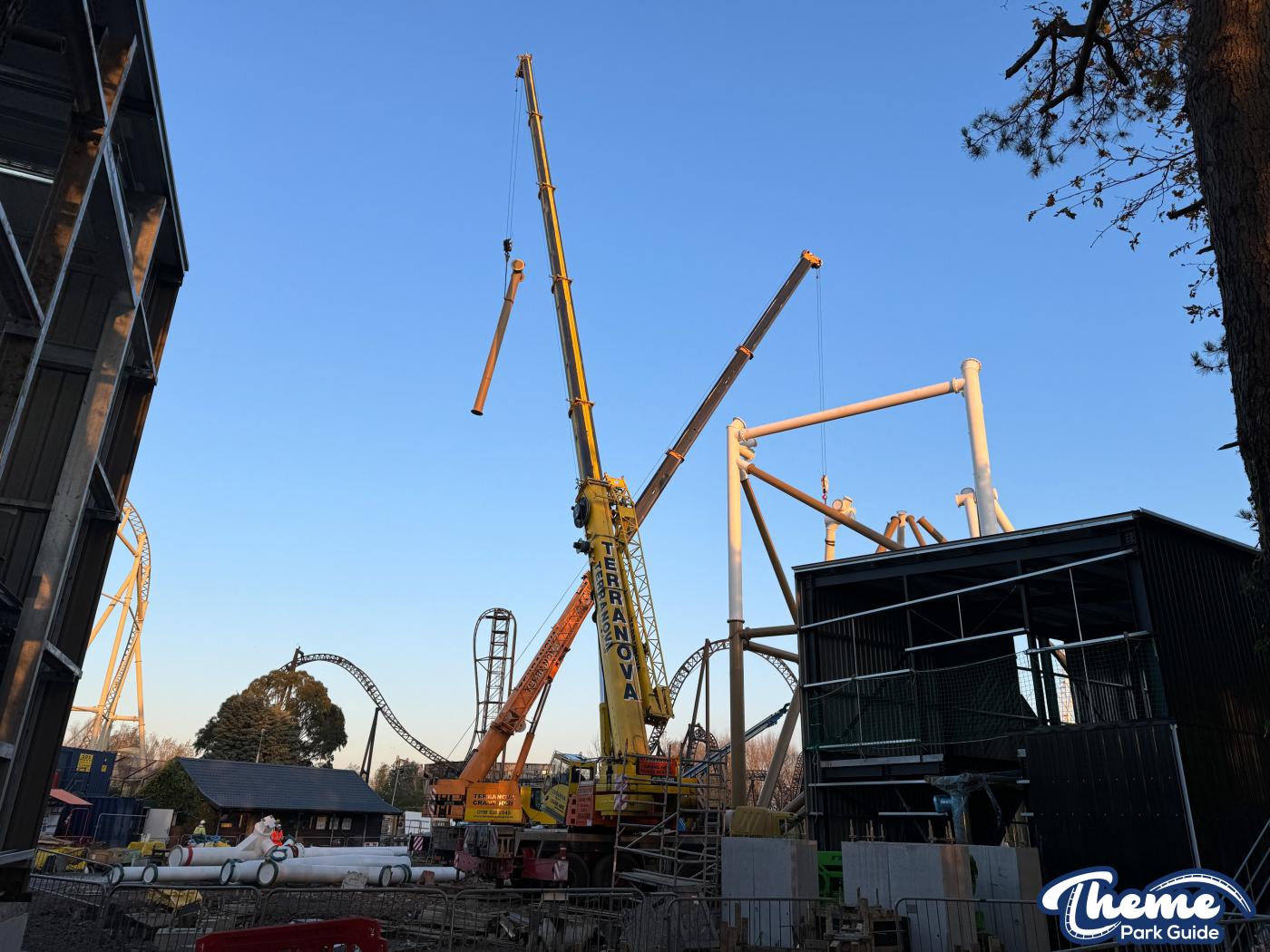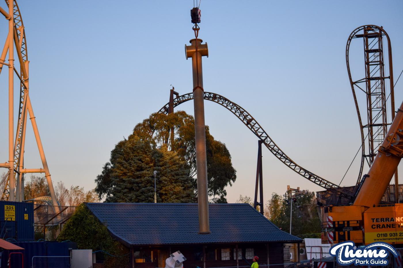 Work on building the tower for the inversion and also continues to rise into the Thorpe Park skyline. Viewing it from across the lake it won't be long until it breaks into the skyline and the skyline of the park changes more. Walking across the bridge into the park last night for the Night With Imascrore event the view doesn't look very different however more track is visible from the bridge now.