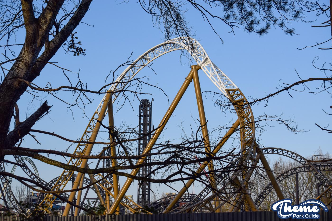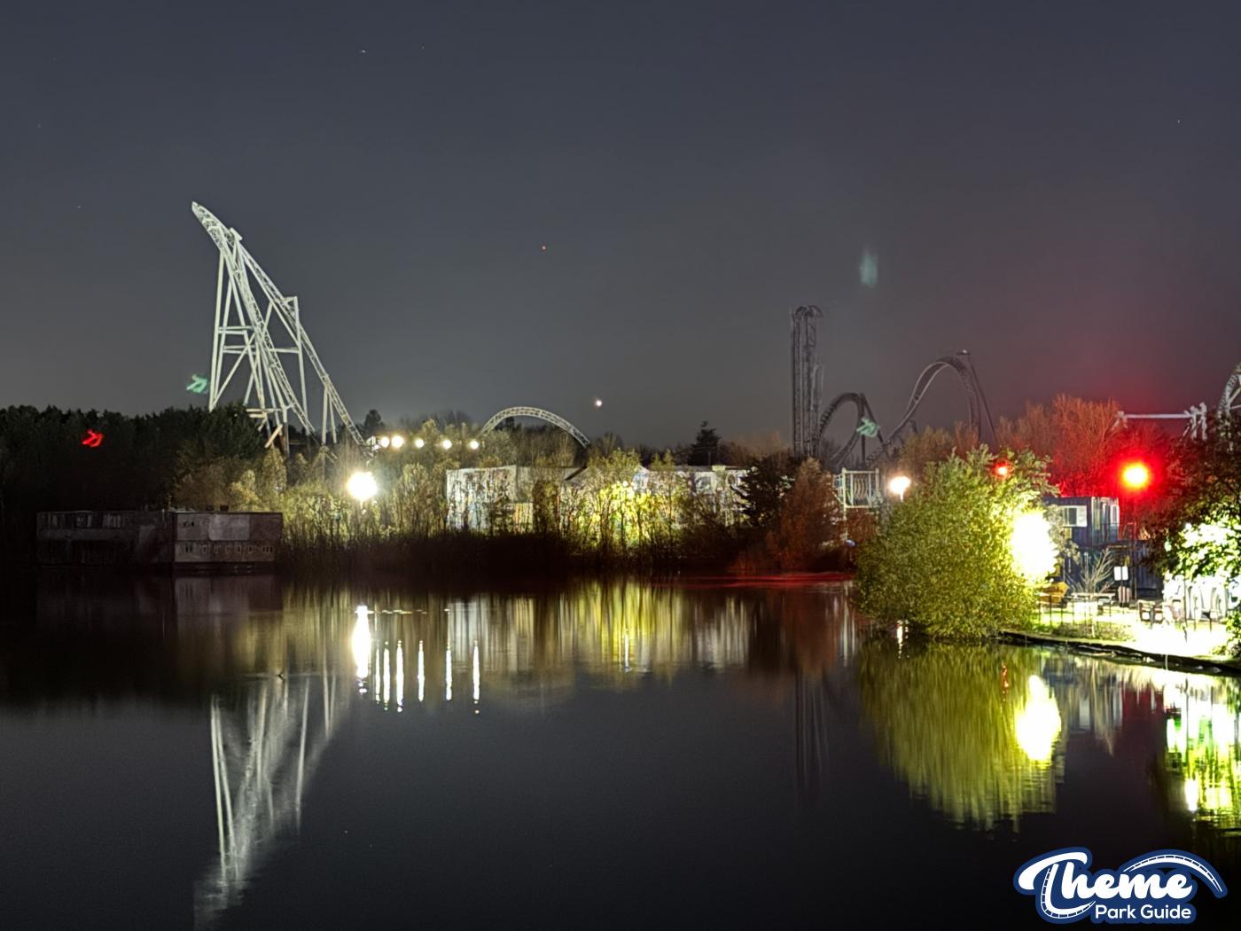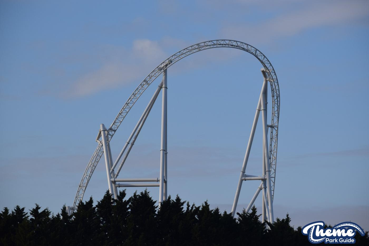 Work on building the tower for the inversion and also continues to rise into the Thorpe Park skyline. Viewing it from across the lake it won't be long until it breaks into the skyline and the skyline of the park changes more. Walking across the bridge into the park last night for the Night With Imascrore event the view doesn't look very different however more track is visible from the bridge now.