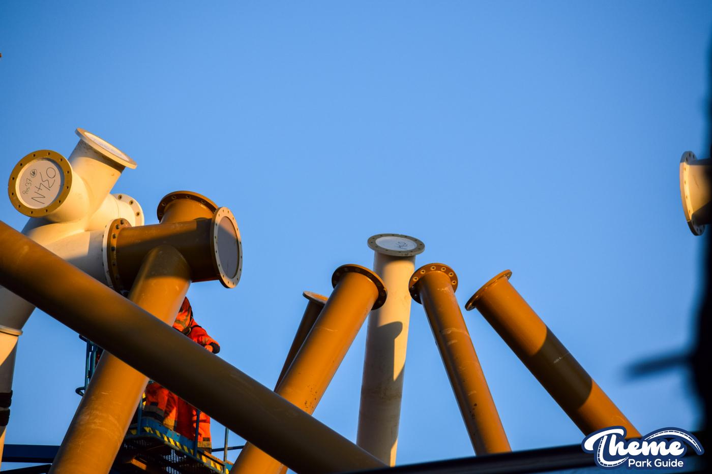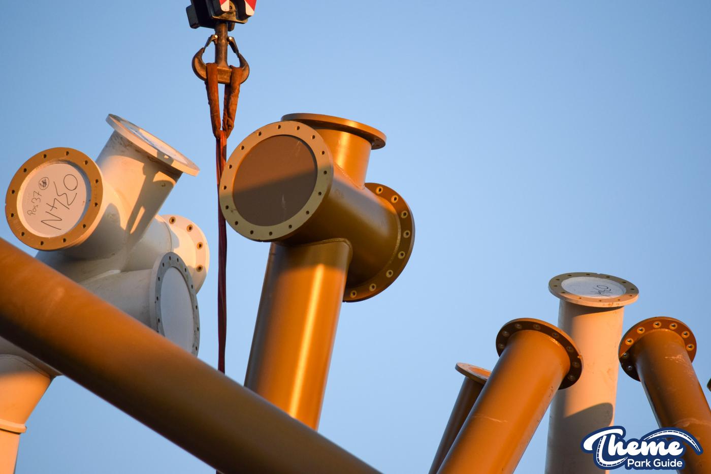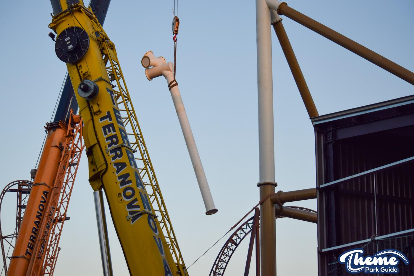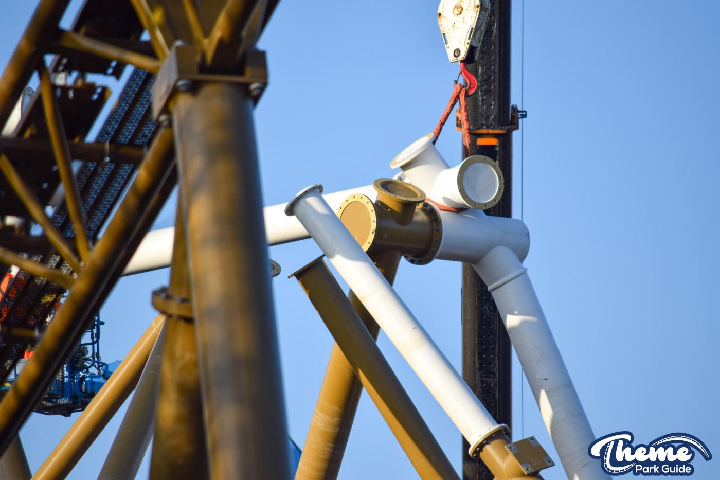 The track for the splash-down section of the rollercoaster has been installed, and the track leading into the break run has been completed. The final 15 seconds of the ride looks insane and we can't wait to ride it very soon.