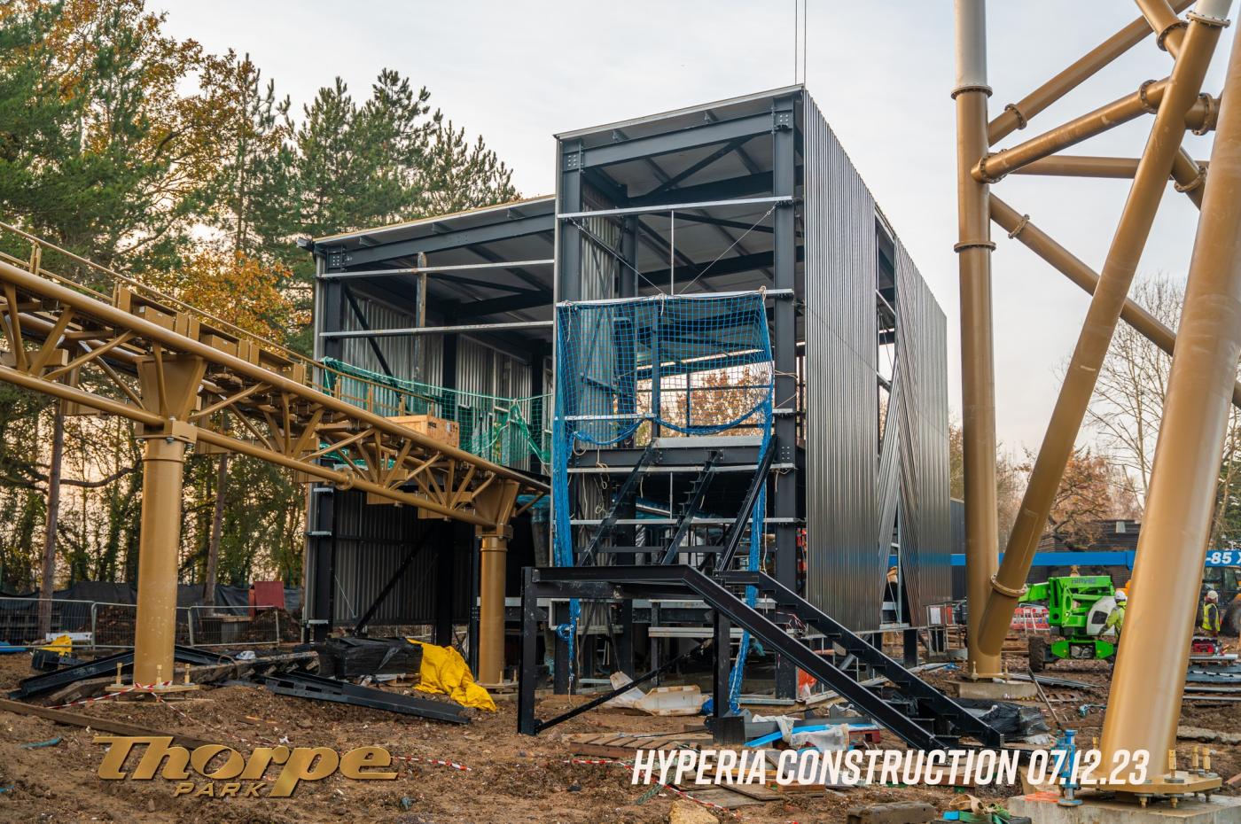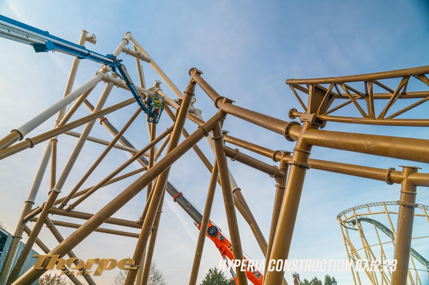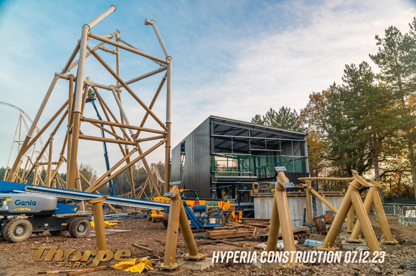 Hyperia is progressing fast and the first section of track outside the station has been installed. The beginning of the outward banked turn has been installed along with the transfer track to move trains from the station to the maintenance shed.