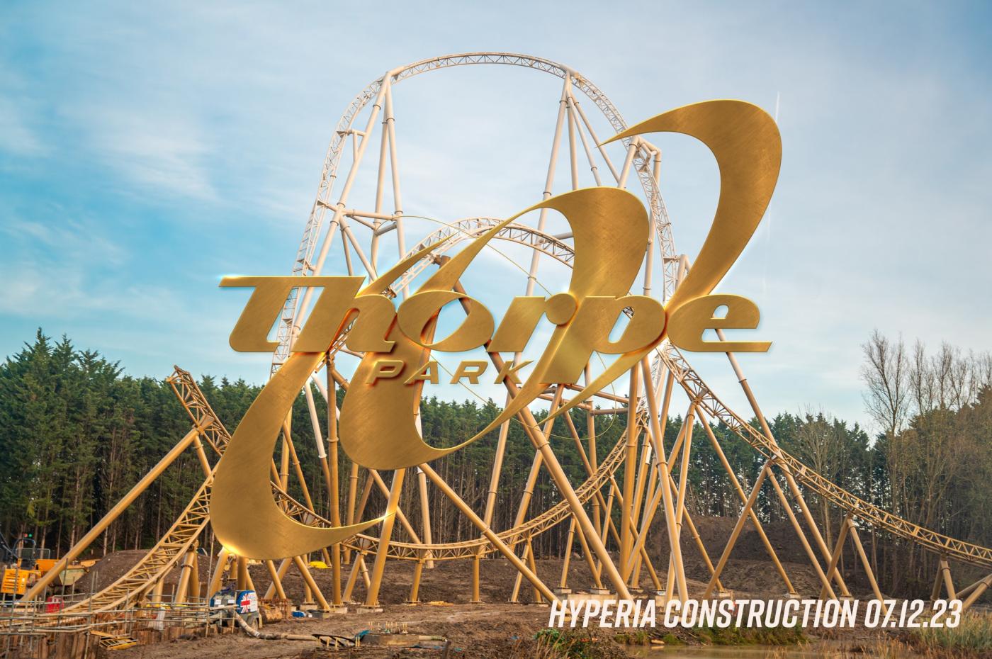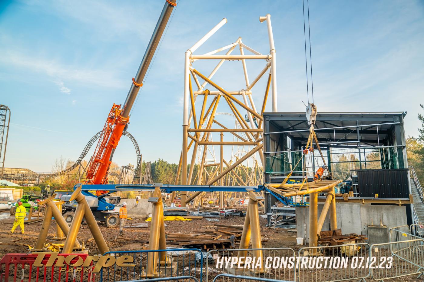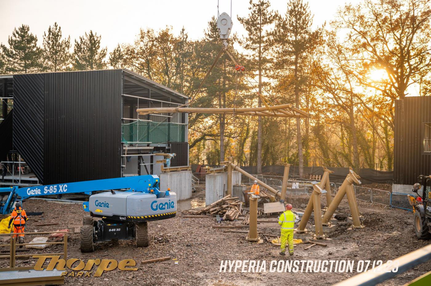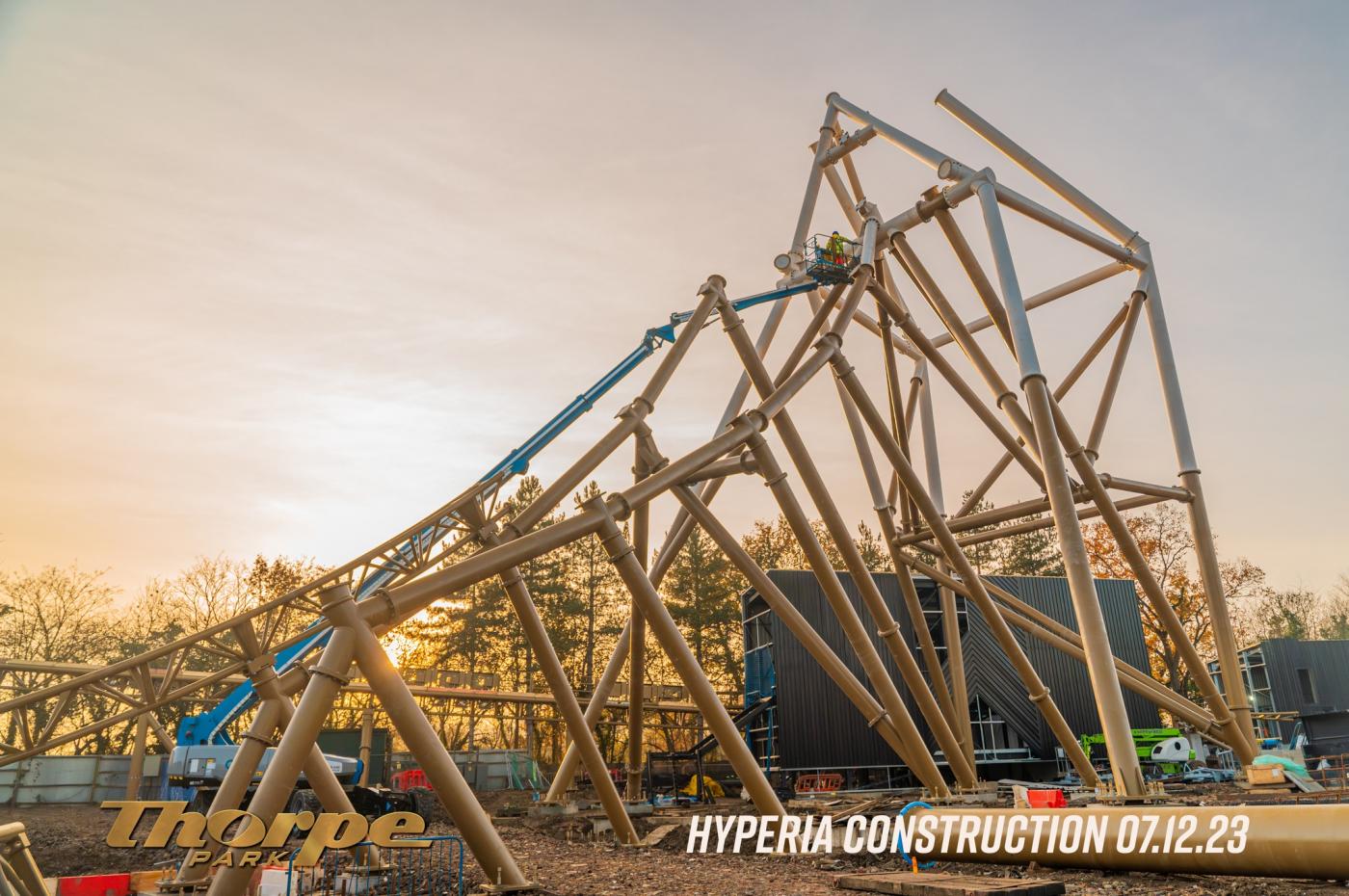 Hyperia is progressing fast and the first section of track outside the station has been installed. The beginning of the outward banked turn has been installed along with the transfer track to move trains from the station to the maintenance shed.
