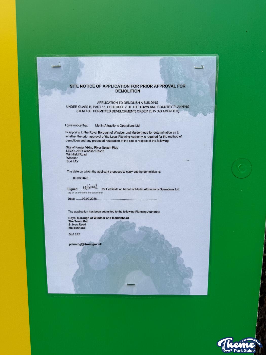 LEGOLAND Windsor has submitted a site notice of application for prior approval for demolition. The application seeks a determination from the local planning authority regarding the method of demolition and any proposed restoration of the former Vikings’ River Splash ride.