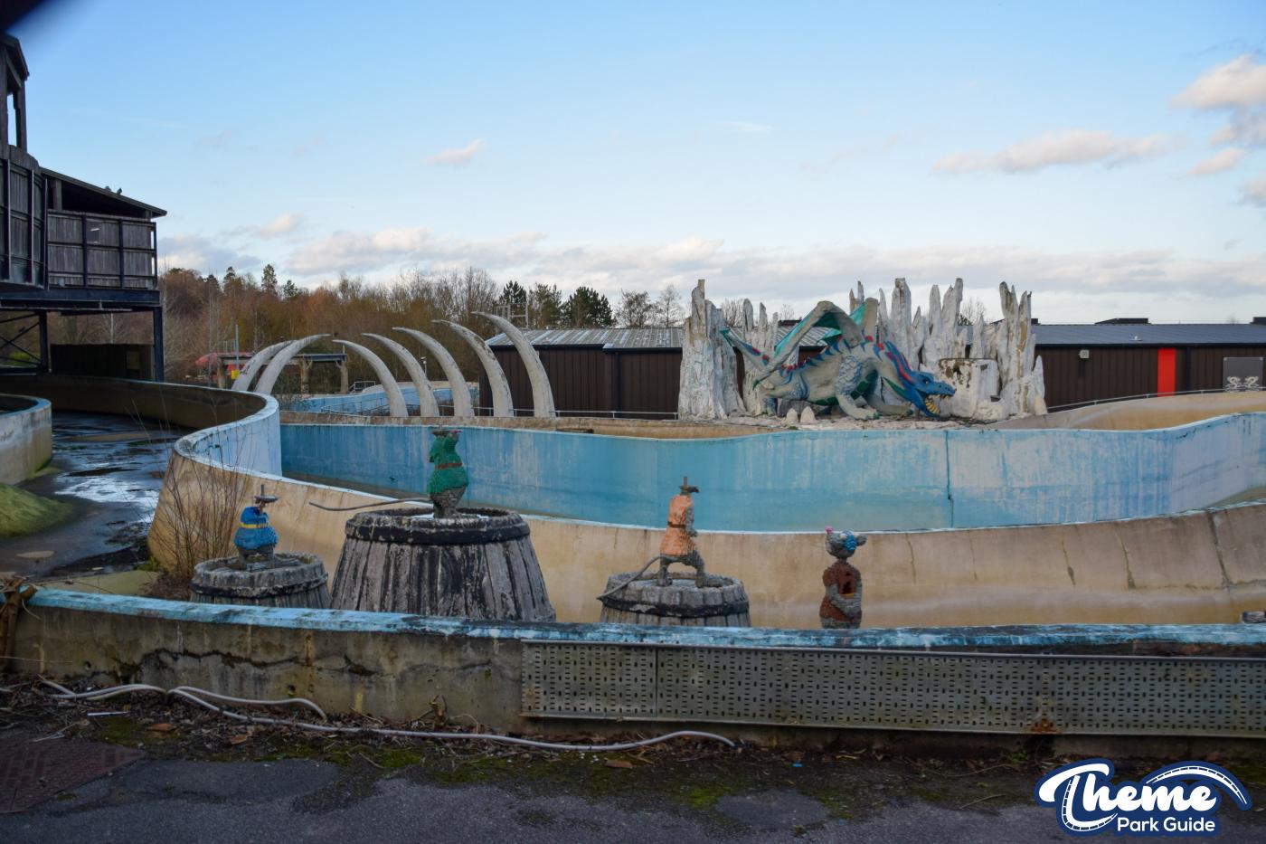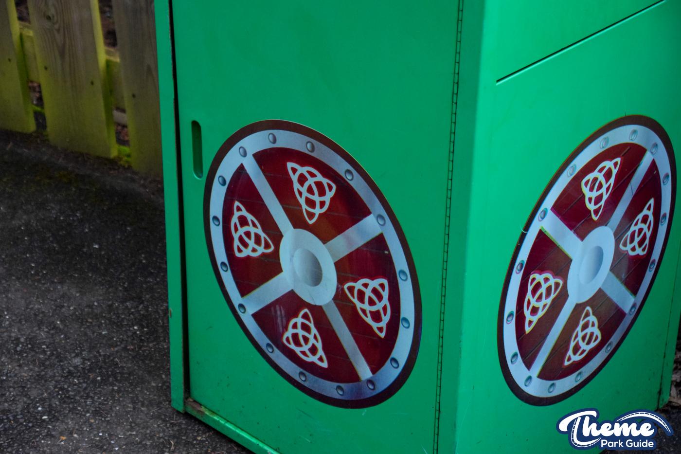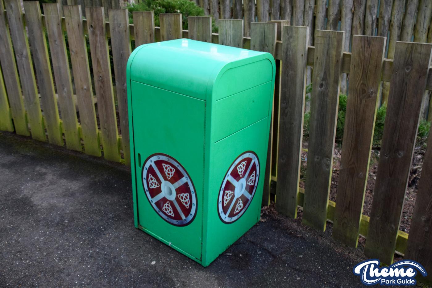 The queue line and entrance structure have mostly been dismantled, and the huge red dragon that once stood proudly is now missing from its original location. Meanwhile, a classic Vikings’ River Splash bin still stands, vinyl panels intact, serving as a small but nostalgic reminder of the ride’s history.