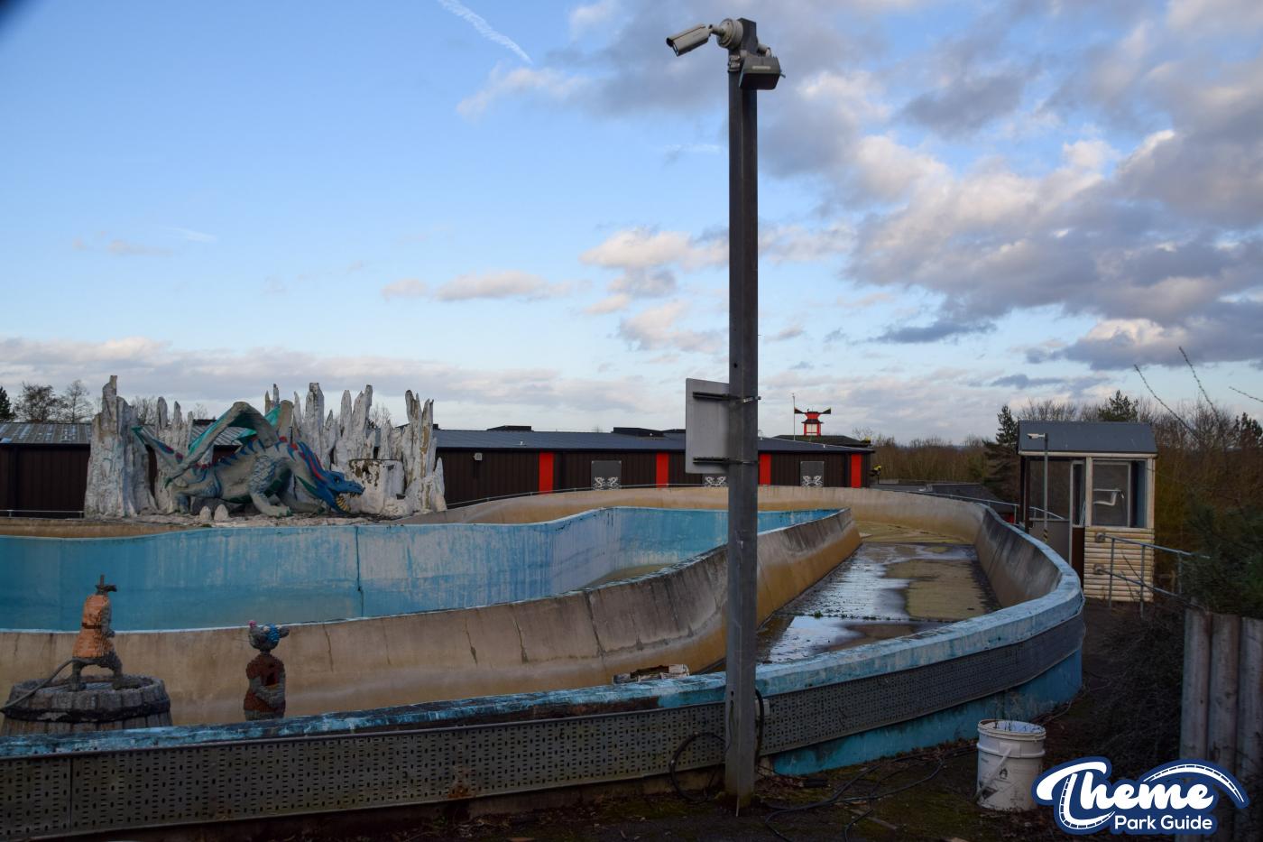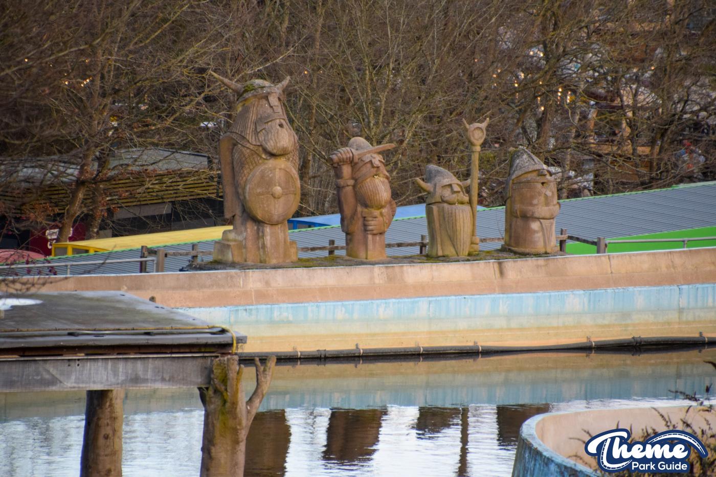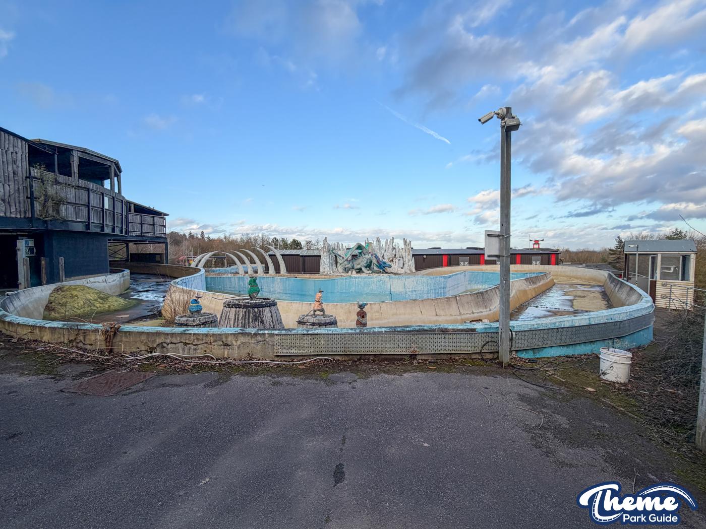 The queue line and entrance structure have mostly been dismantled, and the huge red dragon that once stood proudly is now missing from its original location. Meanwhile, a classic Vikings’ River Splash bin still stands, vinyl panels intact, serving as a small but nostalgic reminder of the ride’s history.