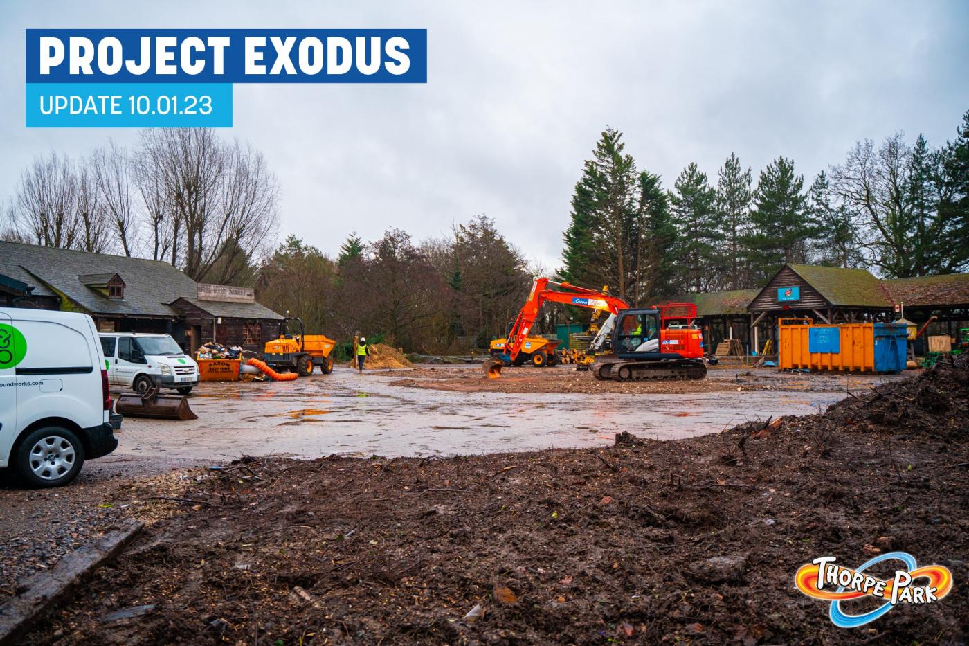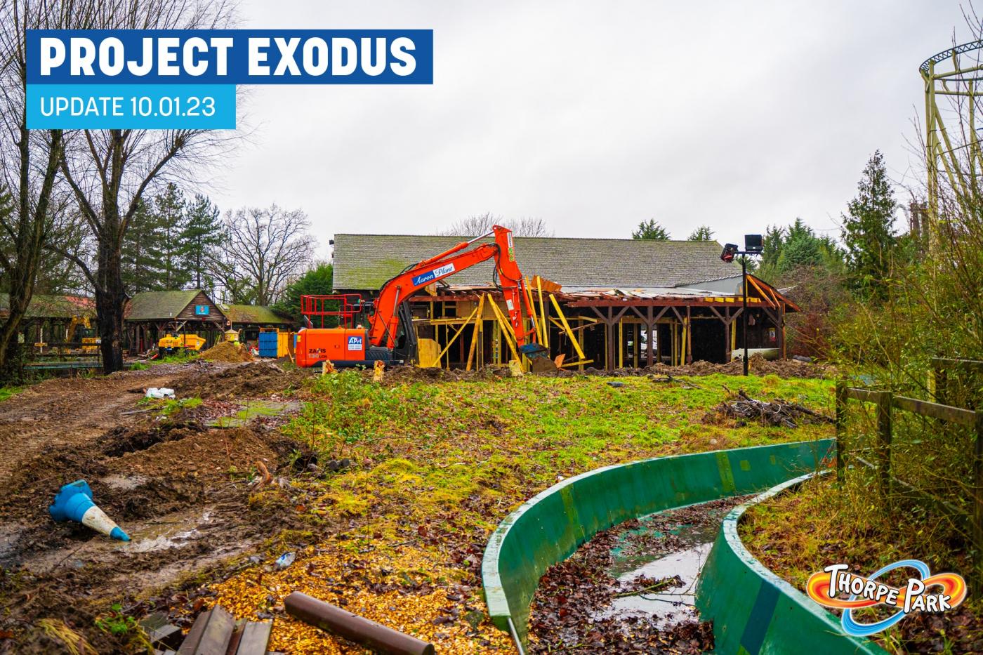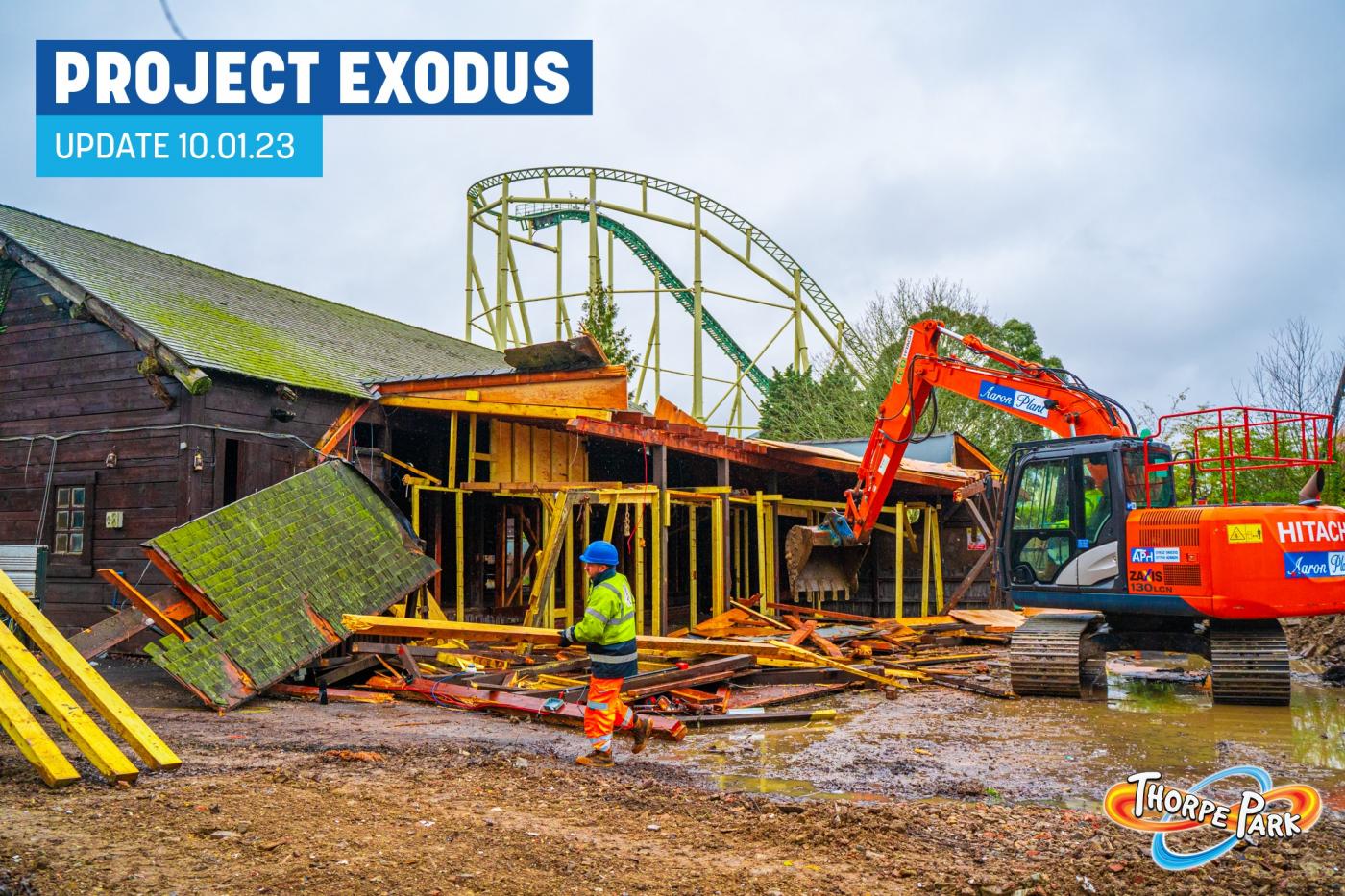 The Loggers Leap station and Creek Freak Massacre maze is no more! Work on demolishing the station and queue line has begun, photos shared on Thorpe Park Passholder Group show the roof of the covered queue line being ripped off by a digger.