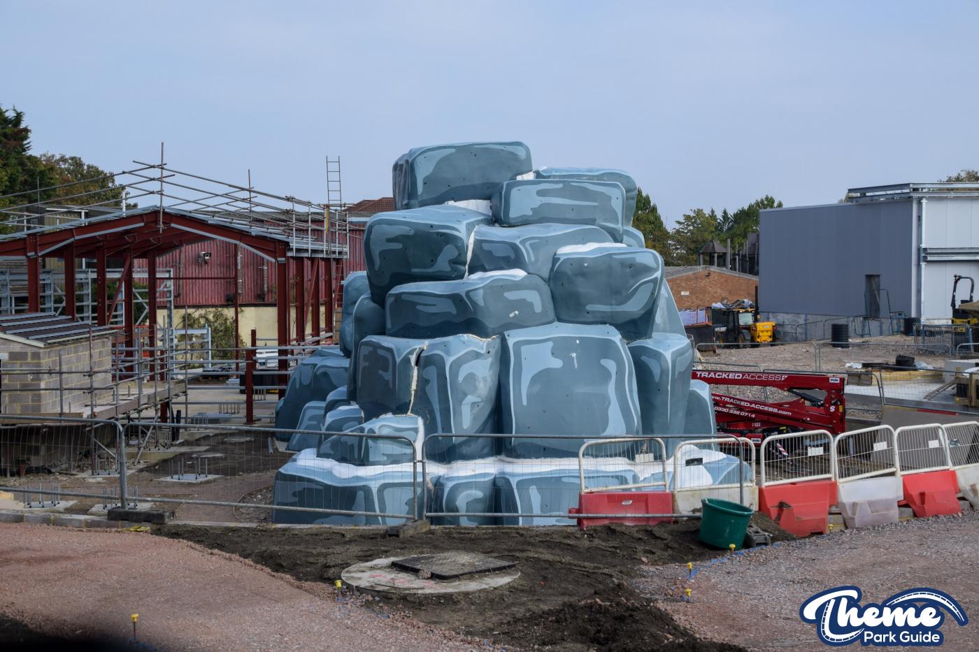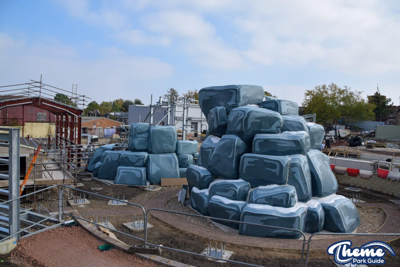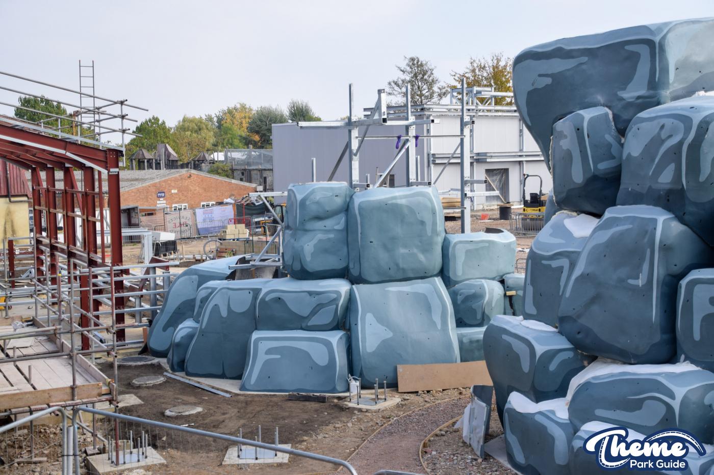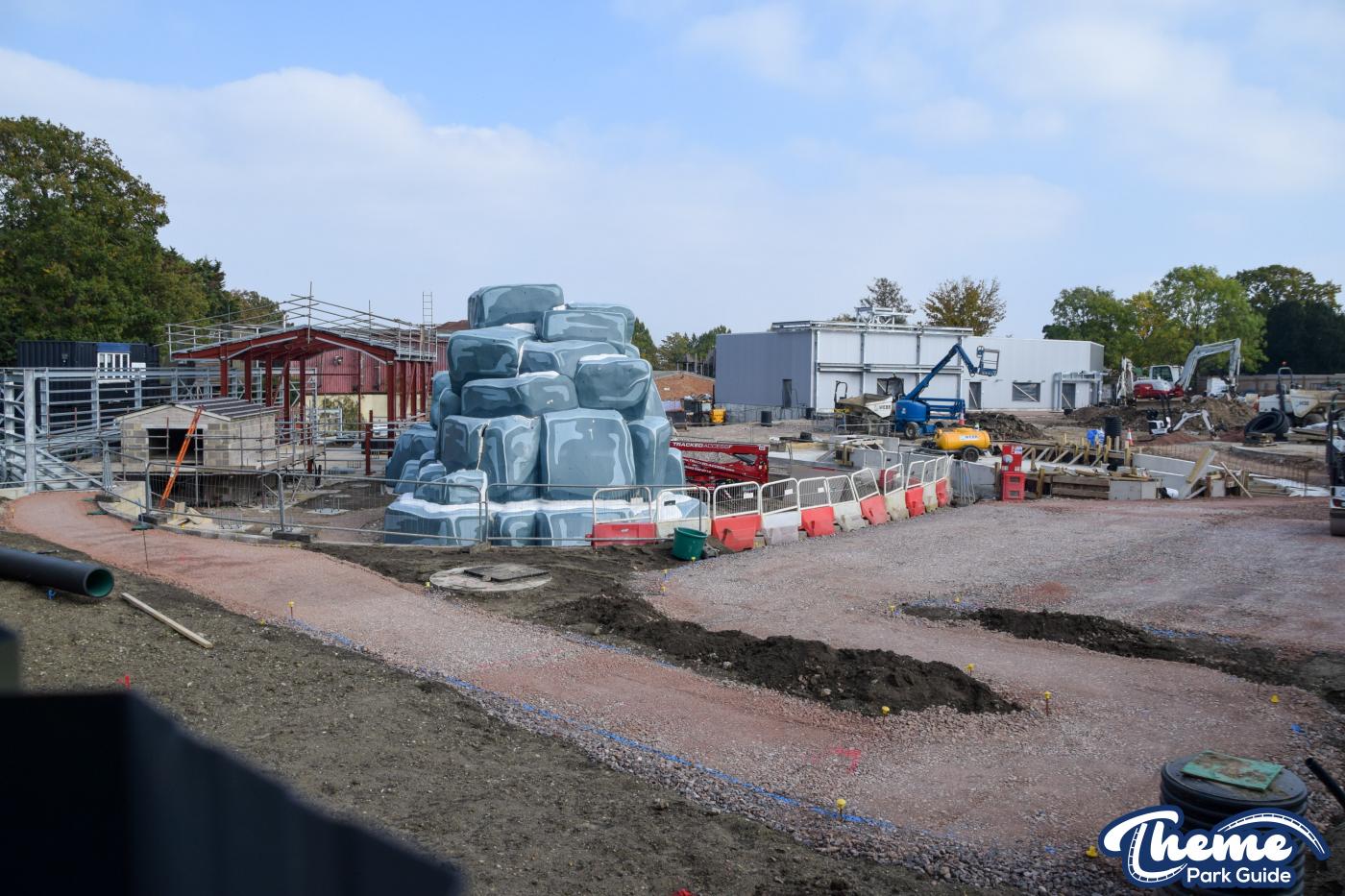 Work has now begun on mapping out the exit paths for the new rollercoaster, offering the first hints at how guests will flow through the area once the ride opens. Theming is also starting to take shape, with large rock mountain structures being installed around the coaster site, signalling the beginning of immersive environmental detailing.