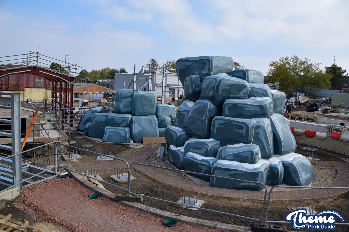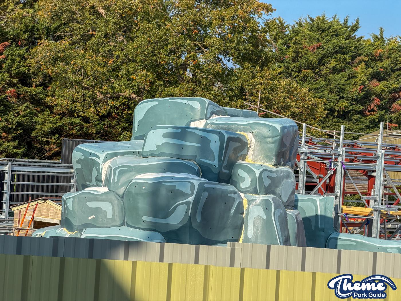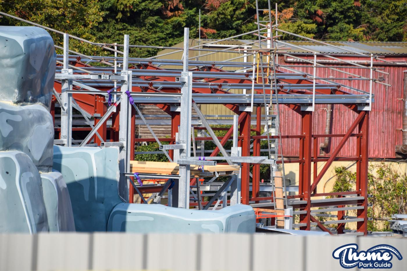 Work has now begun on mapping out the exit paths for the new rollercoaster, offering the first hints at how guests will flow through the area once the ride opens. Theming is also starting to take shape, with large rock mountain structures being installed around the coaster site, signalling the beginning of immersive environmental detailing.