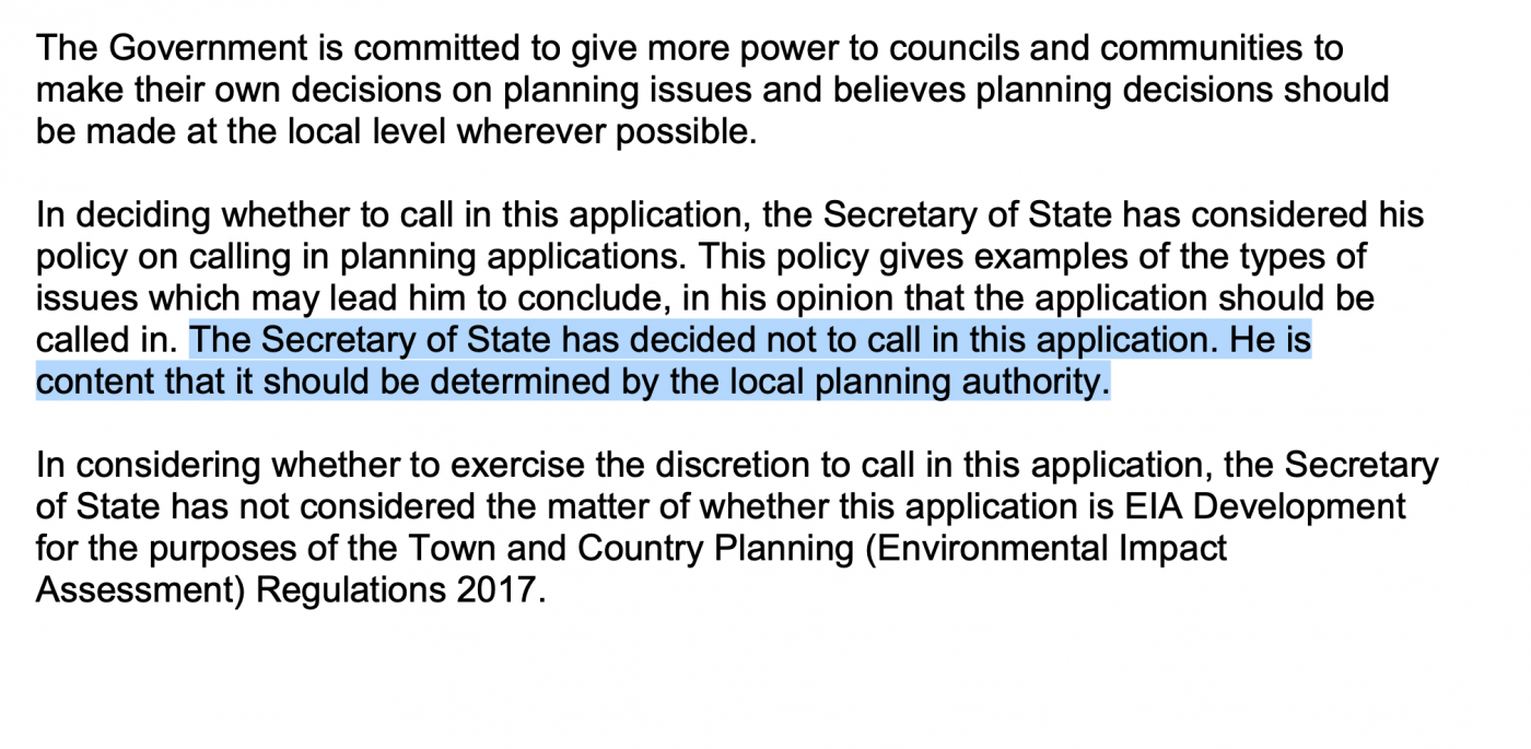 “The Secretary of State has decided not to call in this application. He is content that it should be determined by the local planning authority.”
