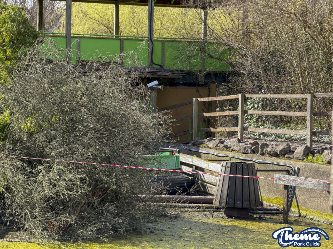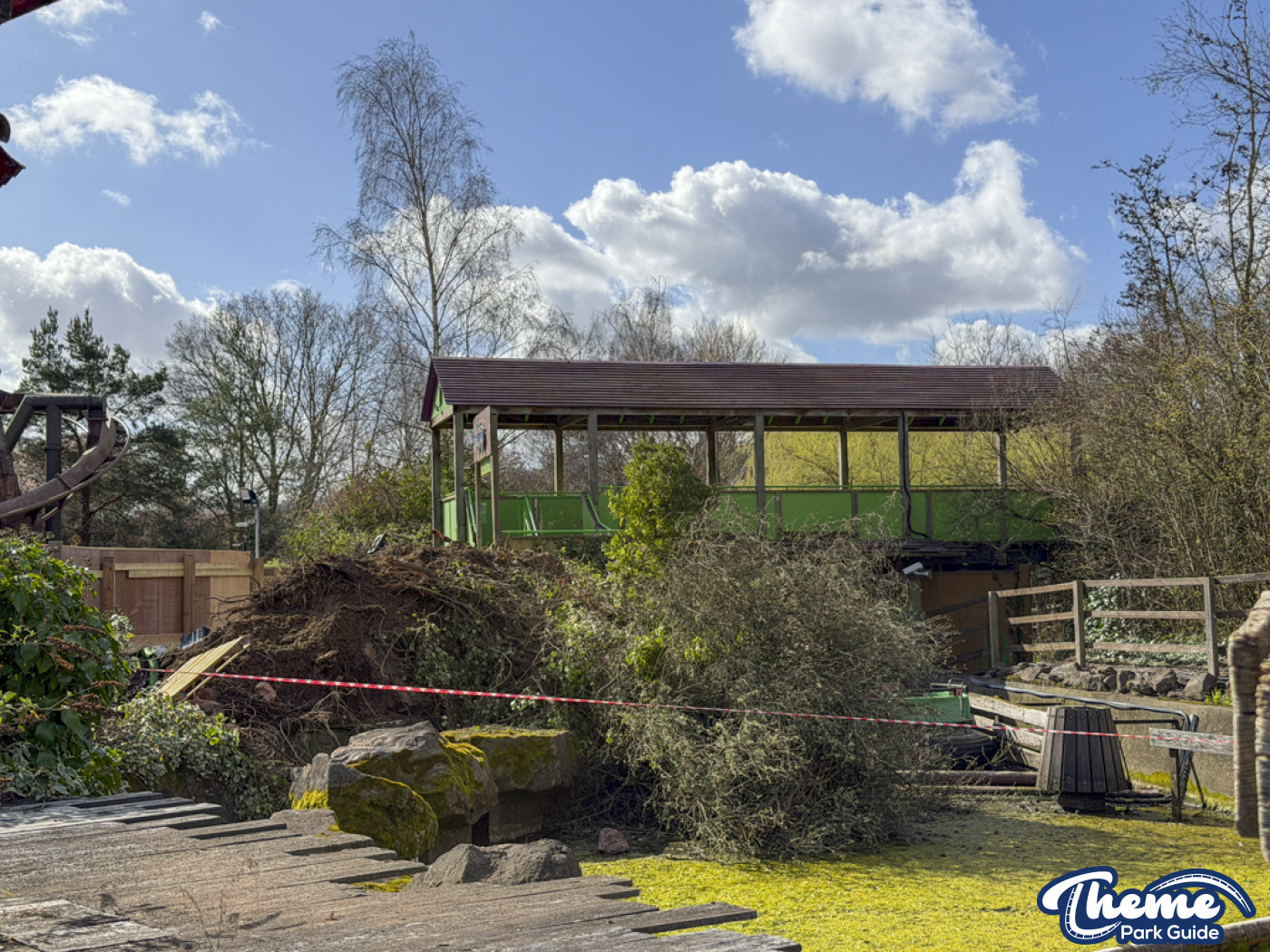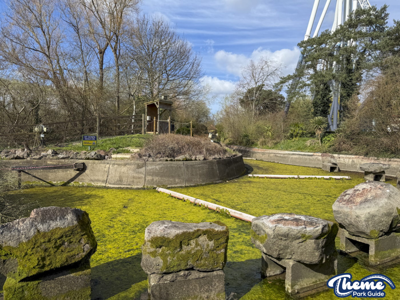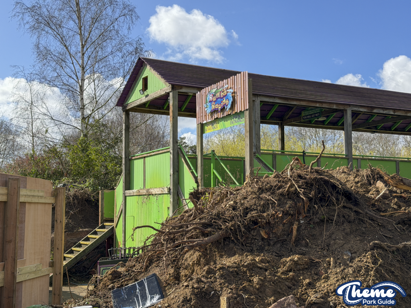 Elsewhere, the ride itself shows clear signs of being left dormant over the winter months. The water trough has developed a green hue, a result of it sitting untouched for an extended period. This contrast between the remaining elements of the ride and the ongoing removal work really highlights that Rumba Rapids is now in its final days.