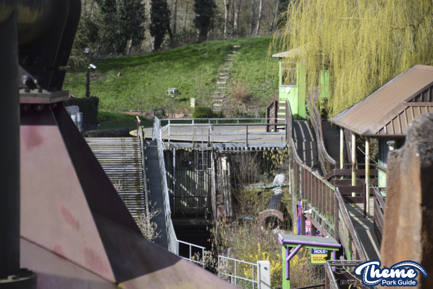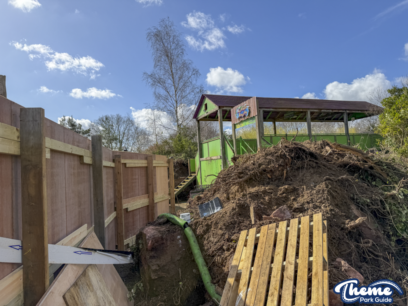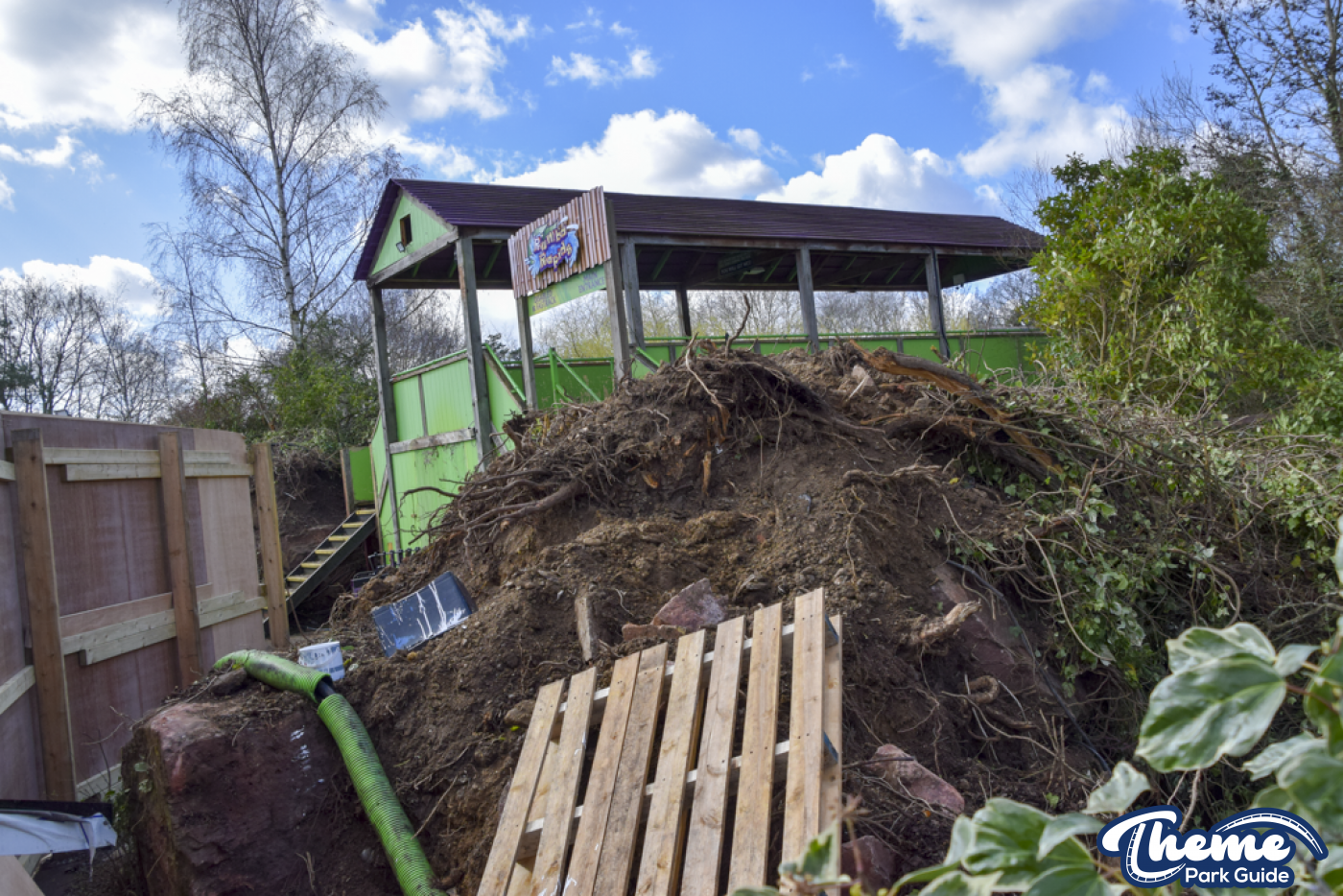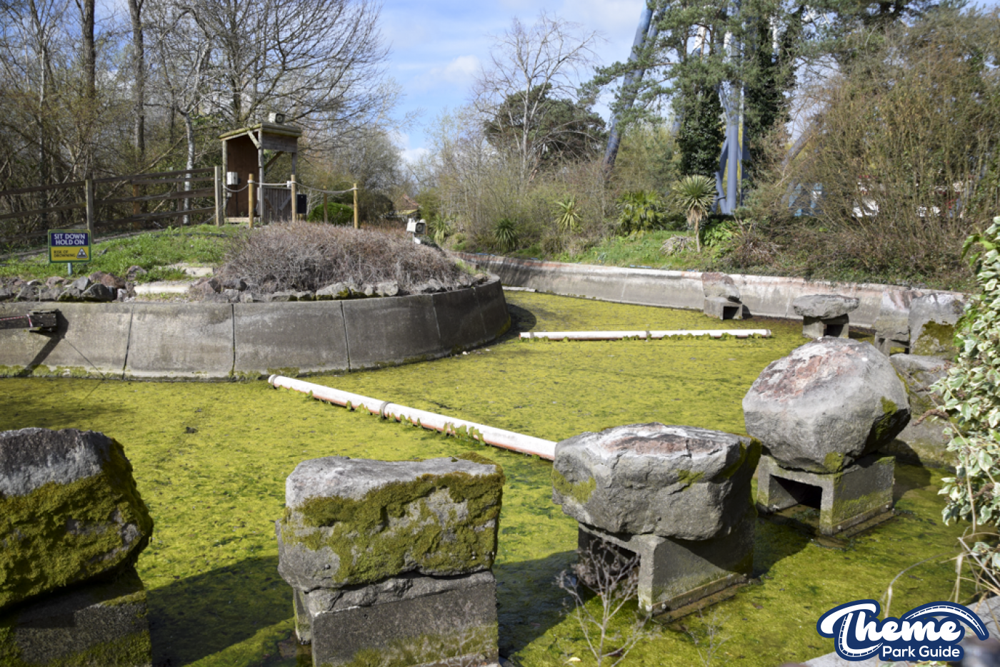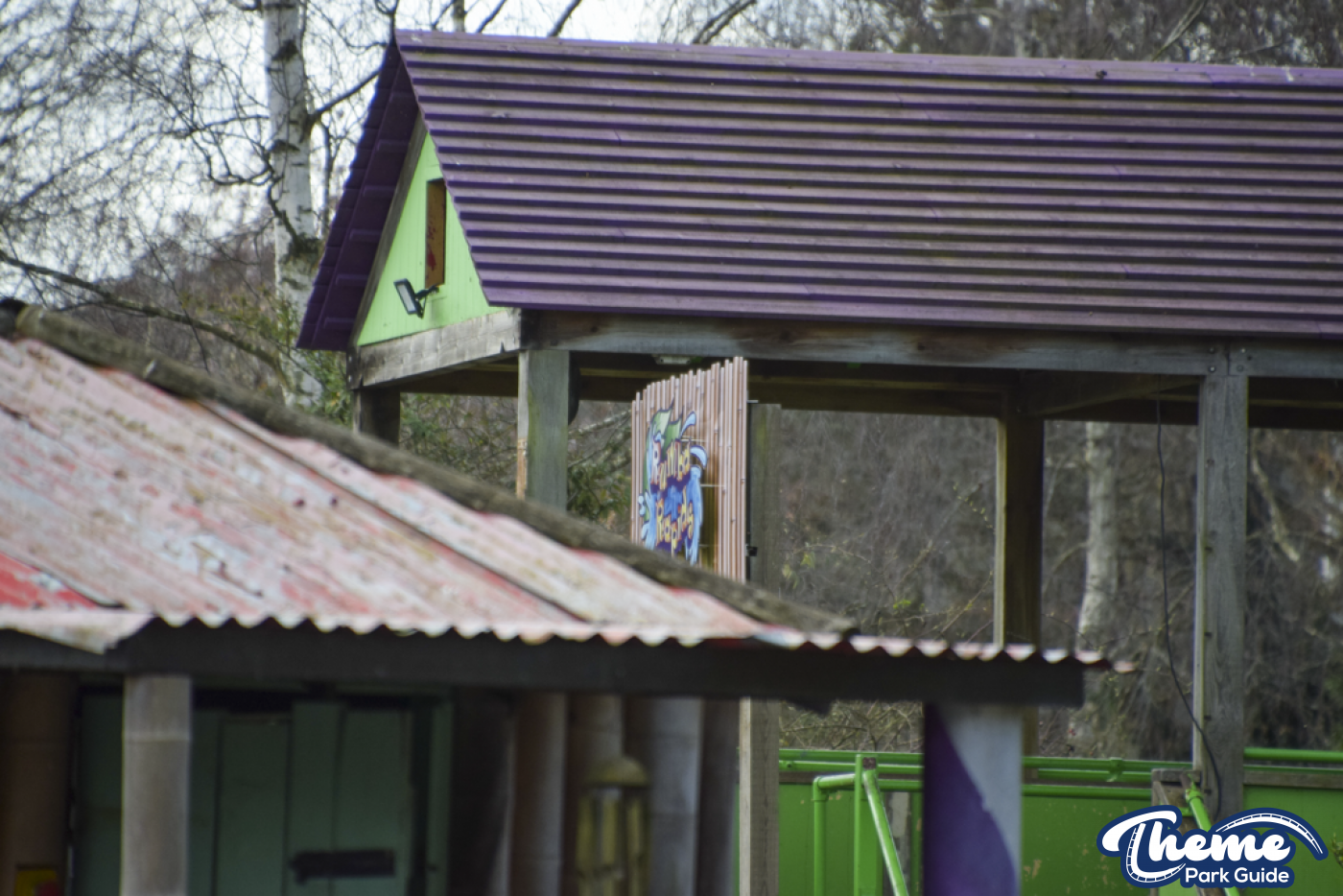 Elsewhere, the ride itself shows clear signs of being left dormant over the winter months. The water trough has developed a green hue, a result of it sitting untouched for an extended period. This contrast between the remaining elements of the ride and the ongoing removal work really highlights that Rumba Rapids is now in its final days.