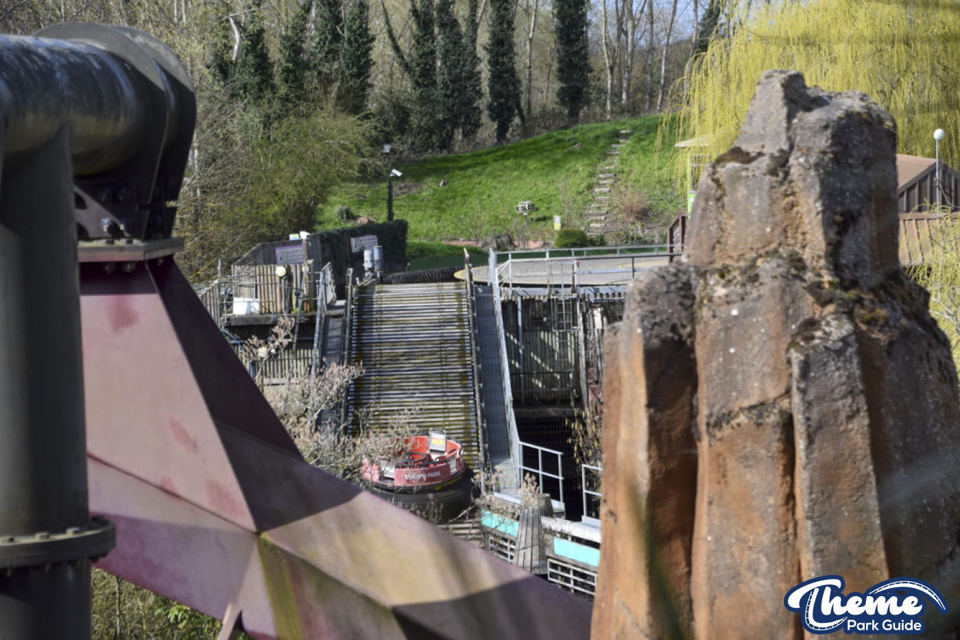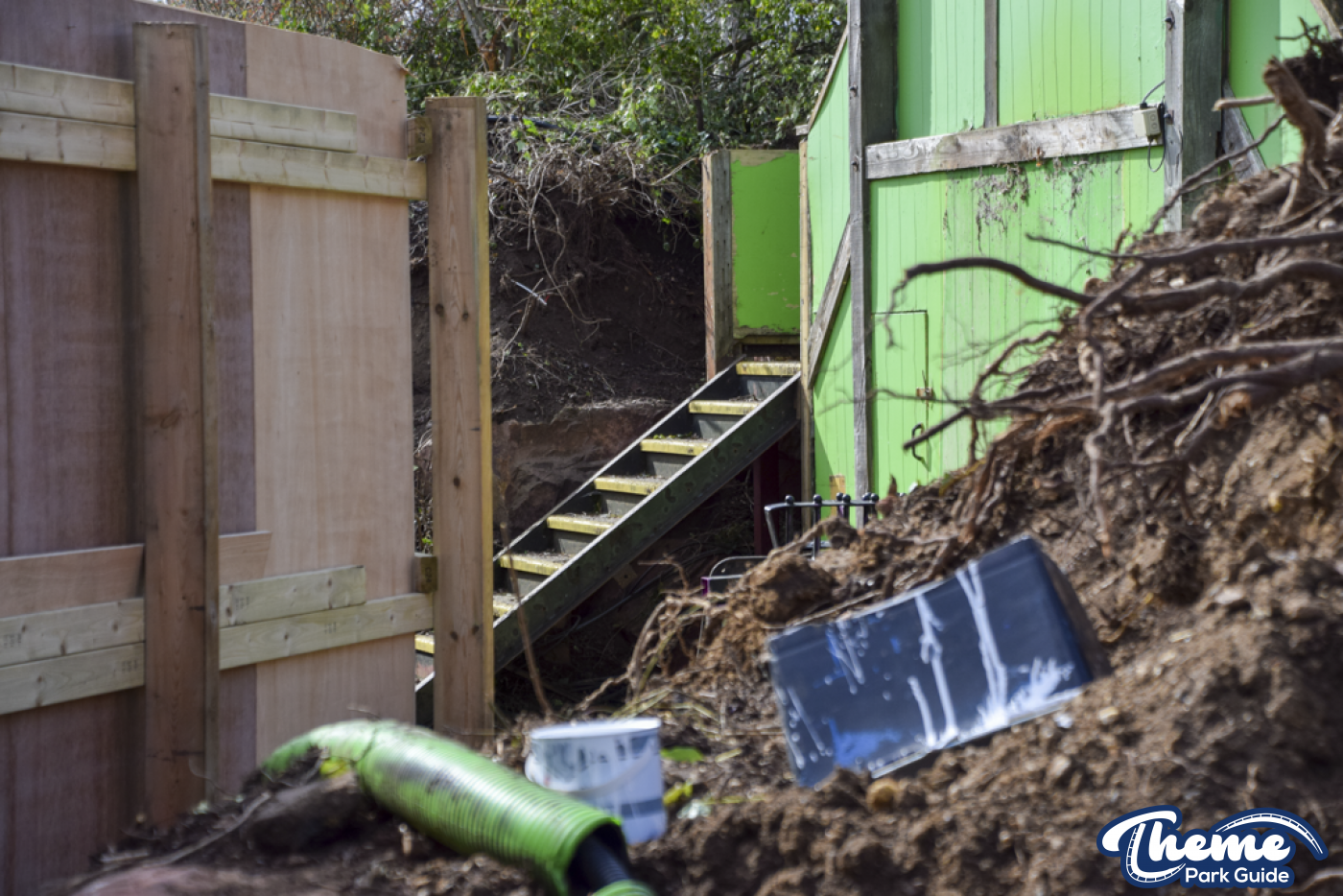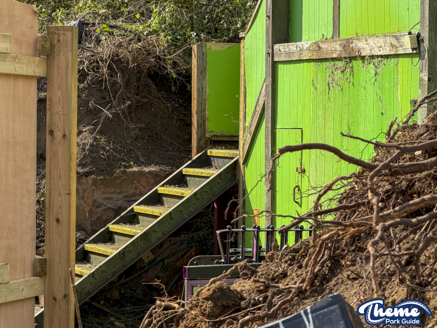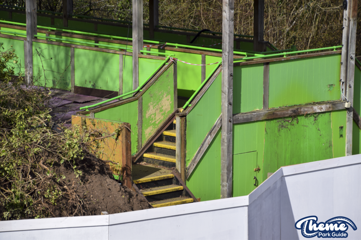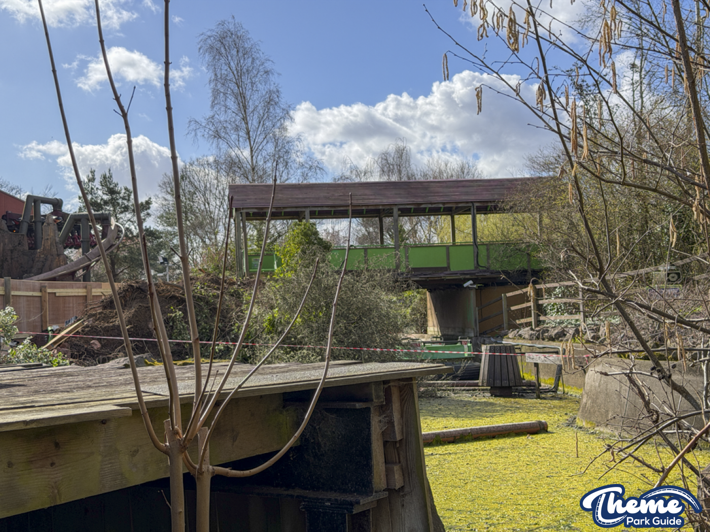 Closer inspection of the ride suggests that early dismantling work is already underway. The exit stairs are in the process of being removed, possibly to allow easier access for construction teams and equipment. Despite this, parts of the ride remain intact for now—several boats can still be spotted within the track, including one positioned on the lift hill and two resting beneath the bridge.