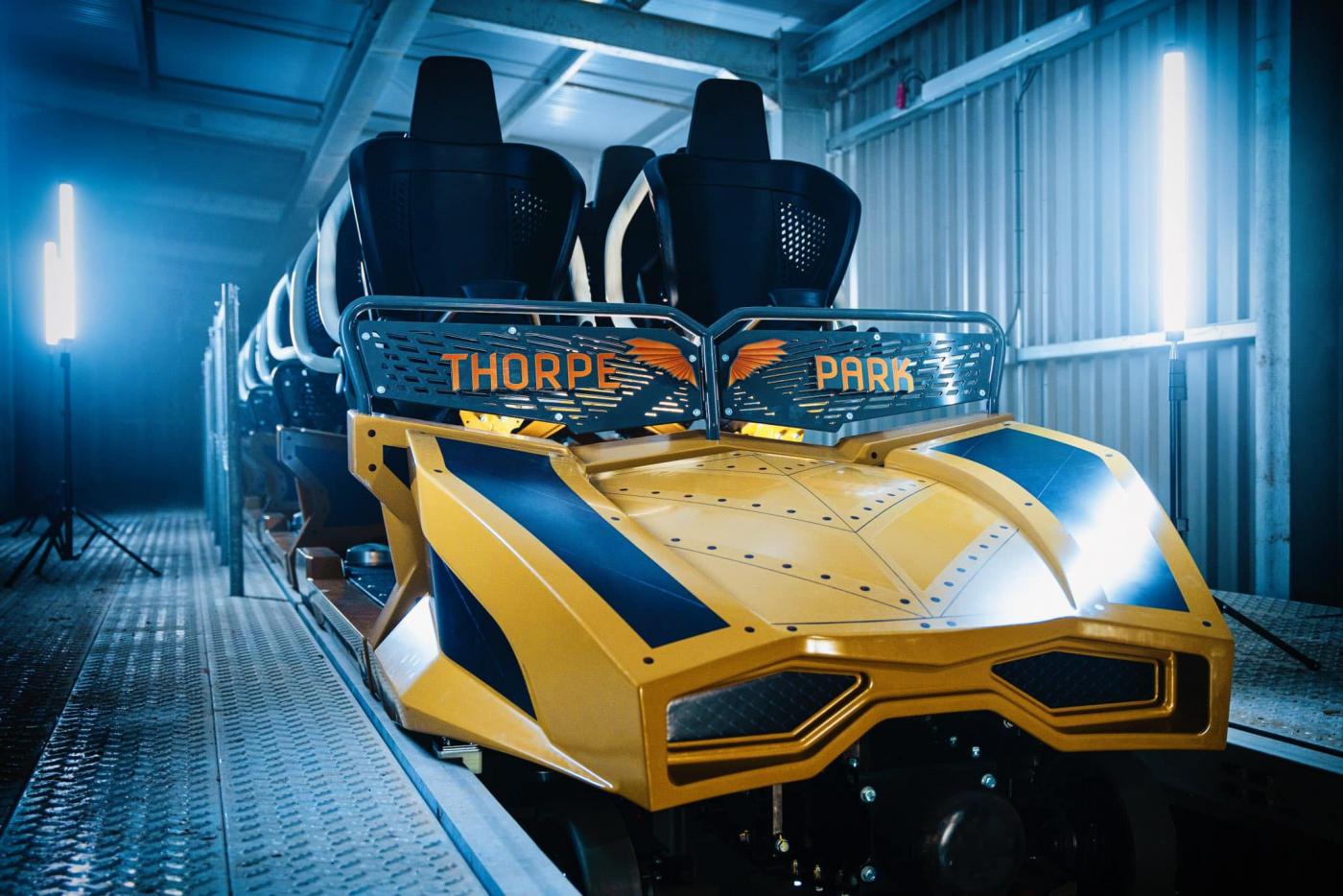 The colour of the train is gold with black seats and white bars on the train. These new Mack Rides trains also appear to have a new non-slip coating on the base of the trains. Also appearing at the front of the train is the park name along with a pair of golden wings.