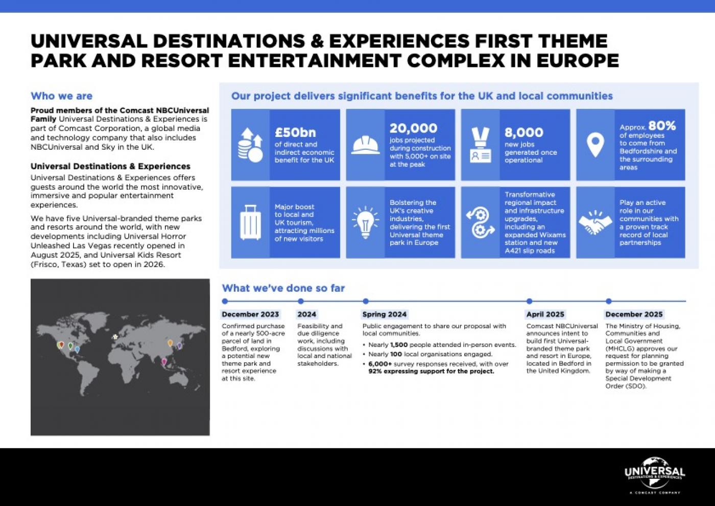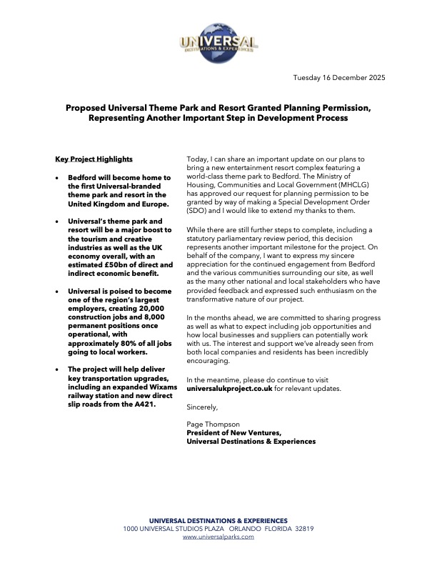He described the approval as “another important milestone” for the project and expressed appreciation for the enthusiasm and feedback shown by Bedford residents, neighbouring communities, and national and local stakeholders. Universal also confirmed its commitment to sharing further updates in the coming months, including information on job opportunities and ways local businesses and suppliers may work with the company.