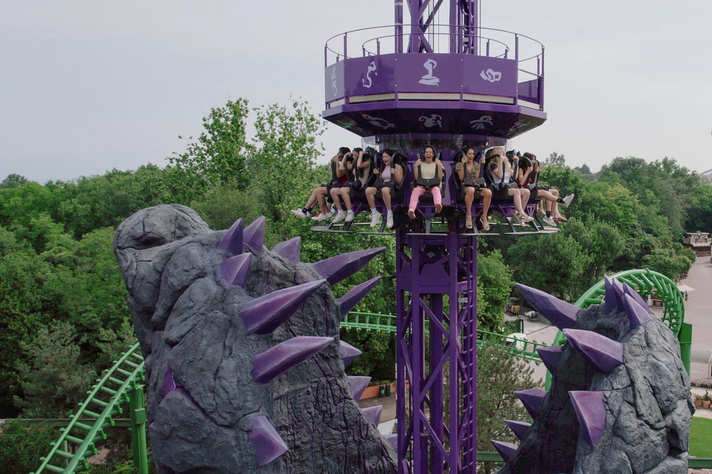 The Wolf Legend adventure begins already at the entrance portal, where an imposing tree trunk has (due to the curse) taken on the features of the majestic animal. The adventurers then board a gondola, and on the notes of a ritual chant, begin to ascend the octagonal tower surrounded by glittering symbols to be deciphered, and extraordinary lighting effects. Only when they reach the highest point of the attraction do they fall from 25 metres into the jaws of the wolf, passing through dense clouds of smoke. Guests are invited to climb up and down several times, and repeatedly rotate around the tower, for a memorable and unique experience before the final descent.