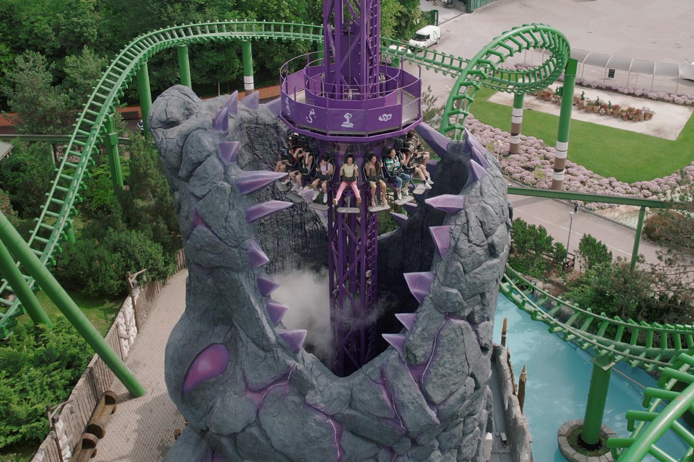 "Wolf Legend" draws its inspiration from the pivotal figure of the new attraction: a majestic wolf of over 16 metres that, struck by a curse, was turned to stone with his huge jaws wide open. Visitors are summoned to challenge the heights by performing a daring ritual: throwing themselves into the jaws of the stone animal to break the curse that imprisons it.